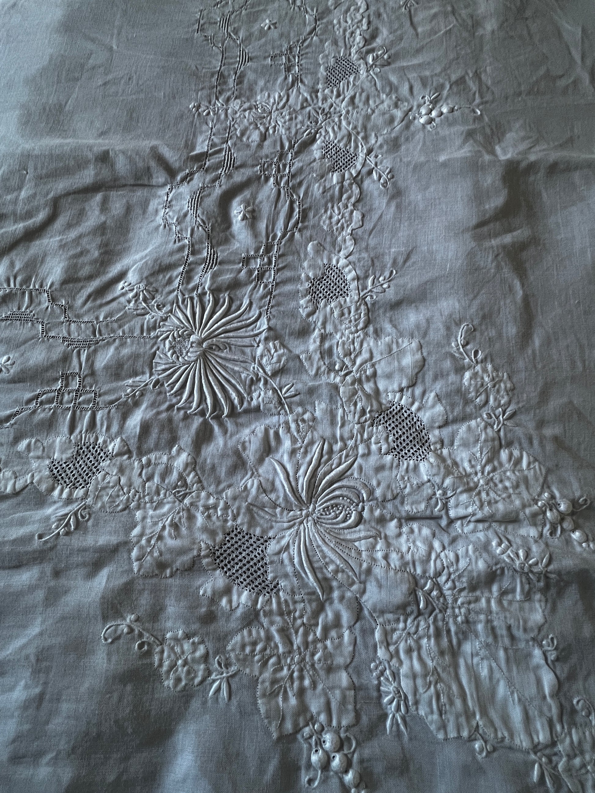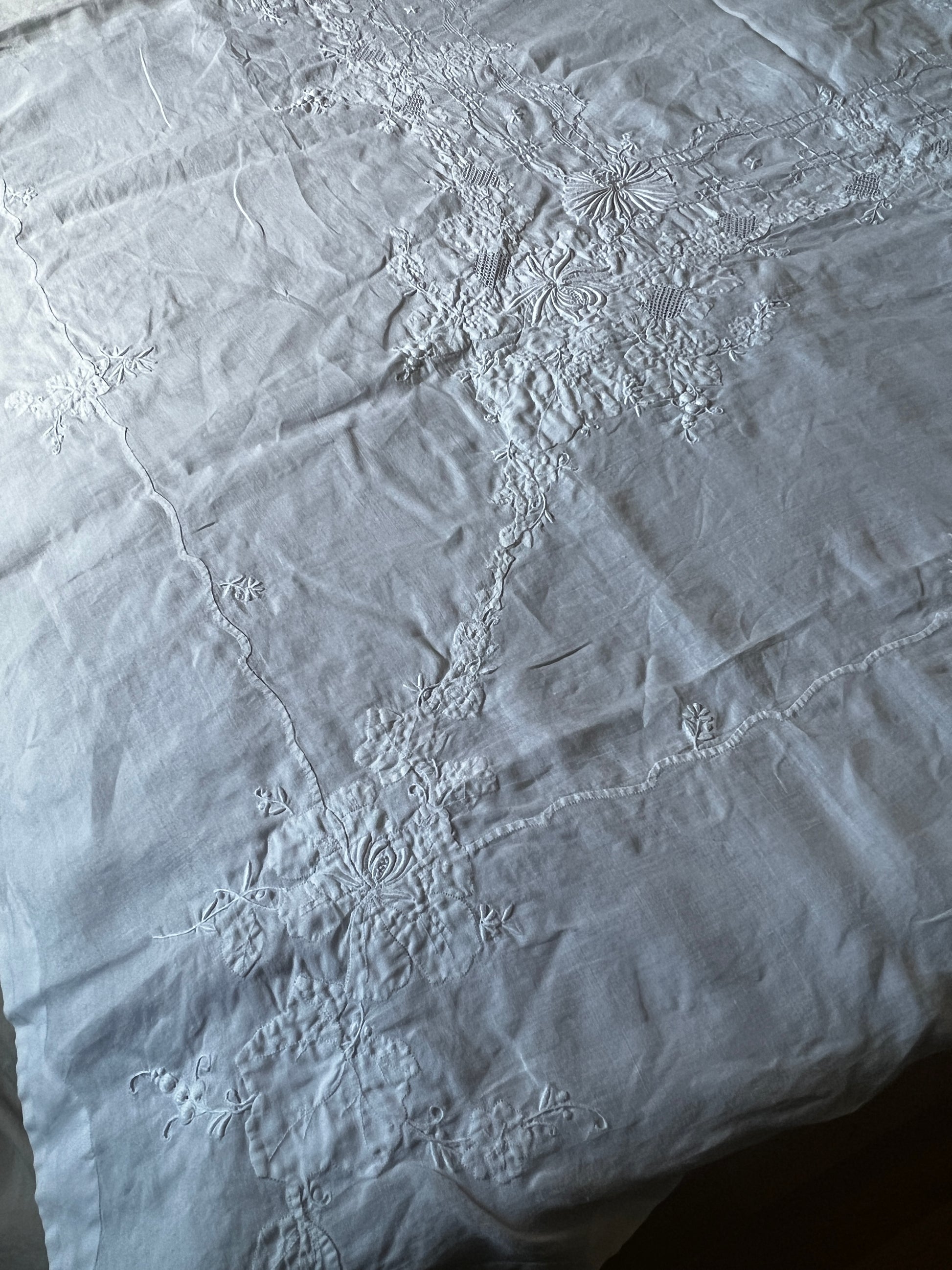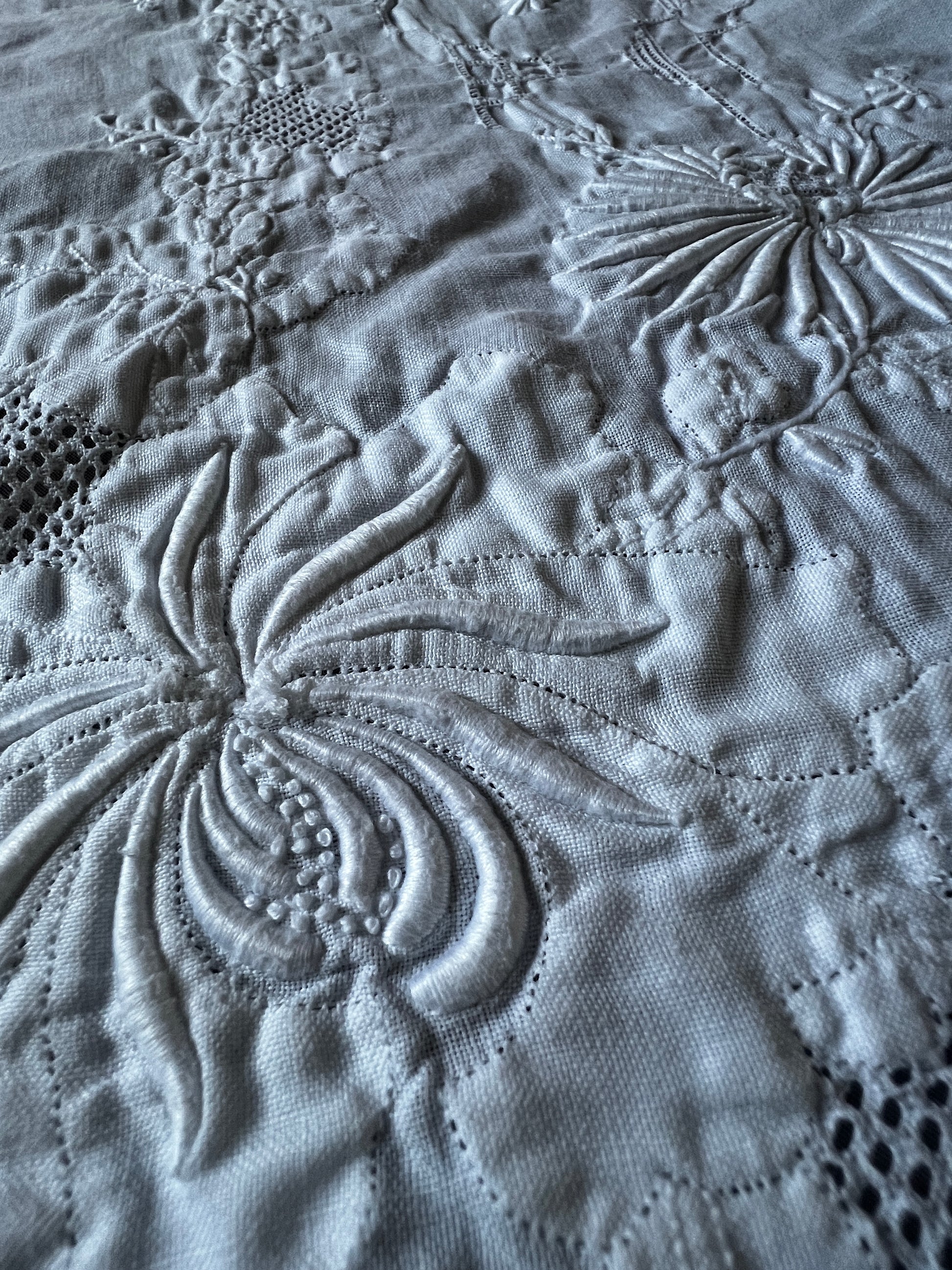 純白の布地に白一色の刺繍が丁寧に施された、大判サイズのクロスです