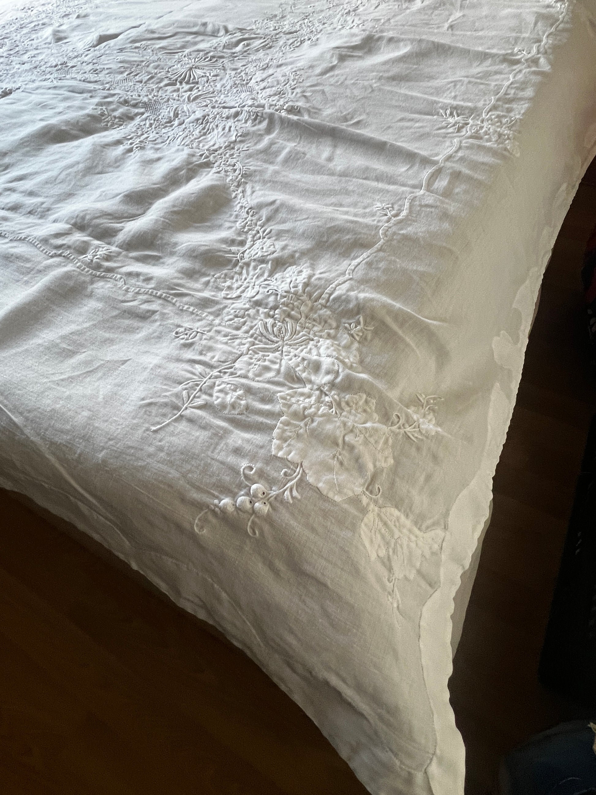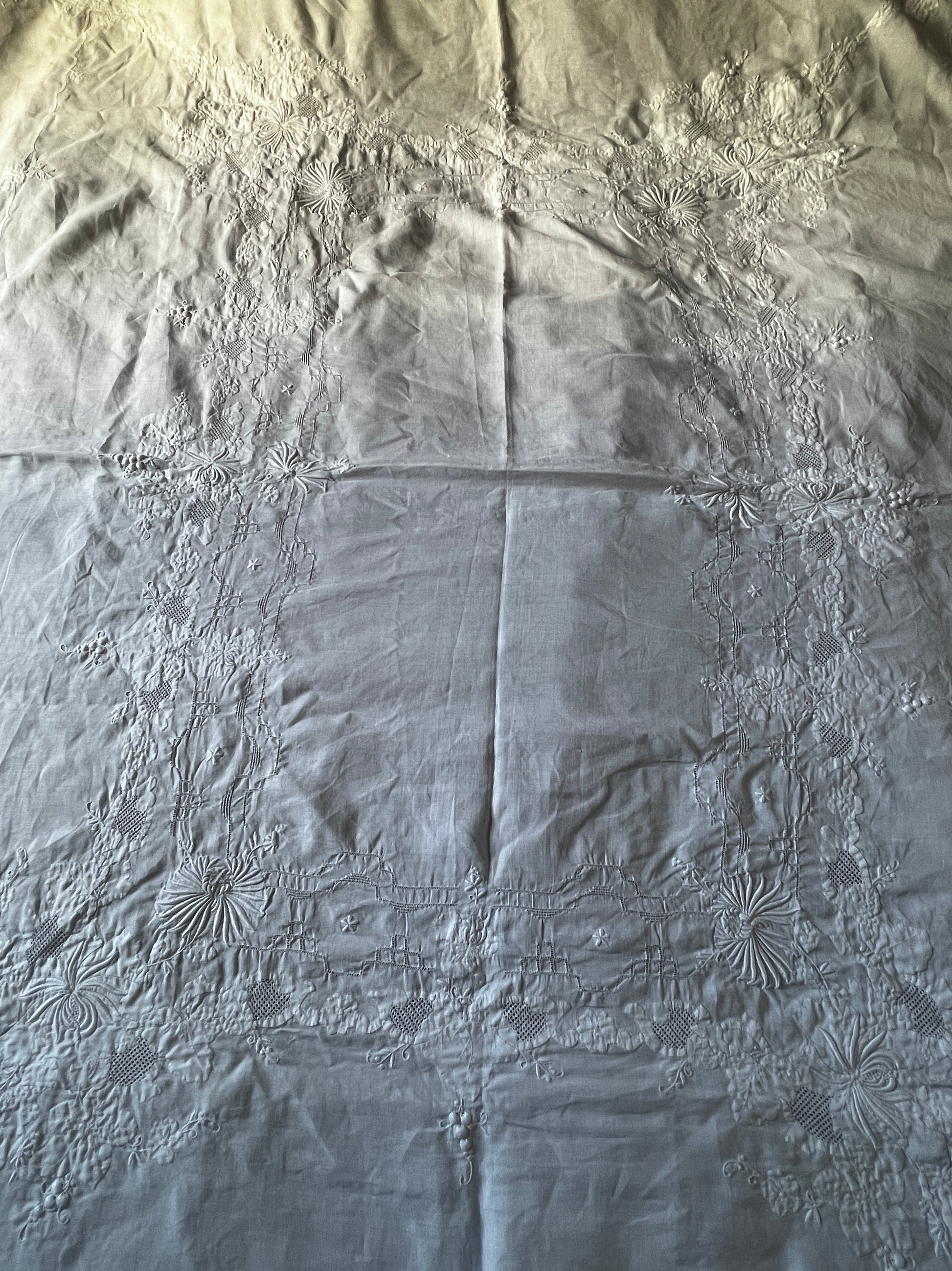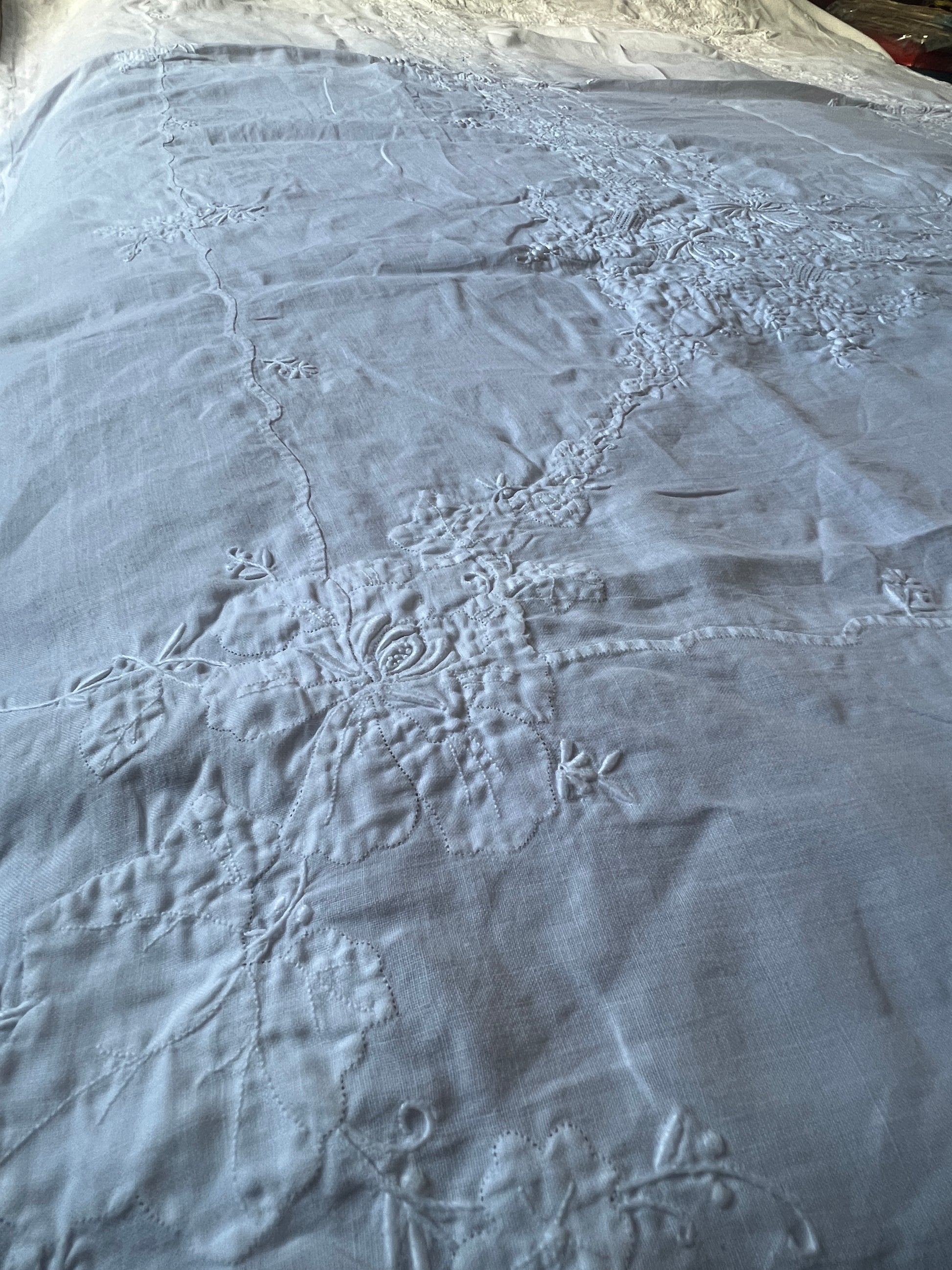 純白の布地に白一色の刺繍が丁寧に施された、大判サイズのクロスです