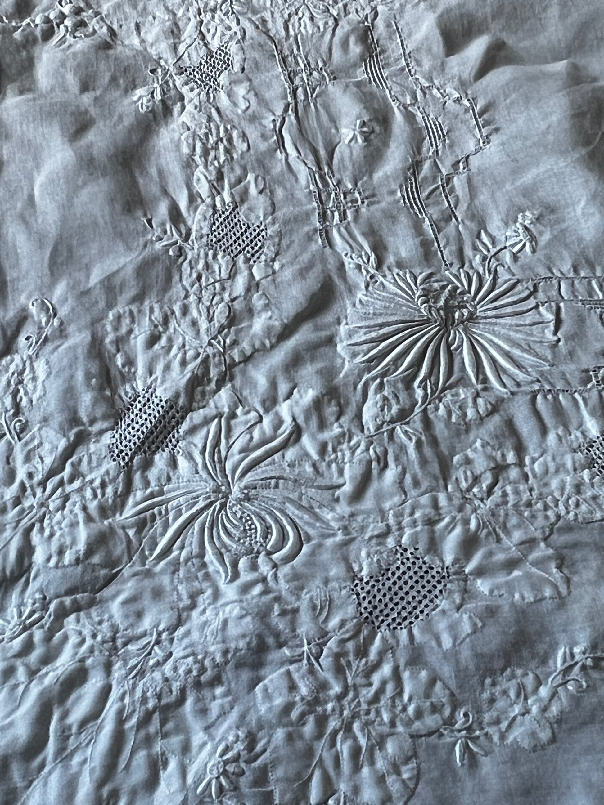 全体にふんだんに施された刺繍は、見ごたえのある美しさで、特にボリューム感のあるステッチや、裏面にあて布を重ねて刺すことで透け感に陰影をつけた繊細な技法など、さりげない中にも手の込んだ丁寧な仕事が光ります