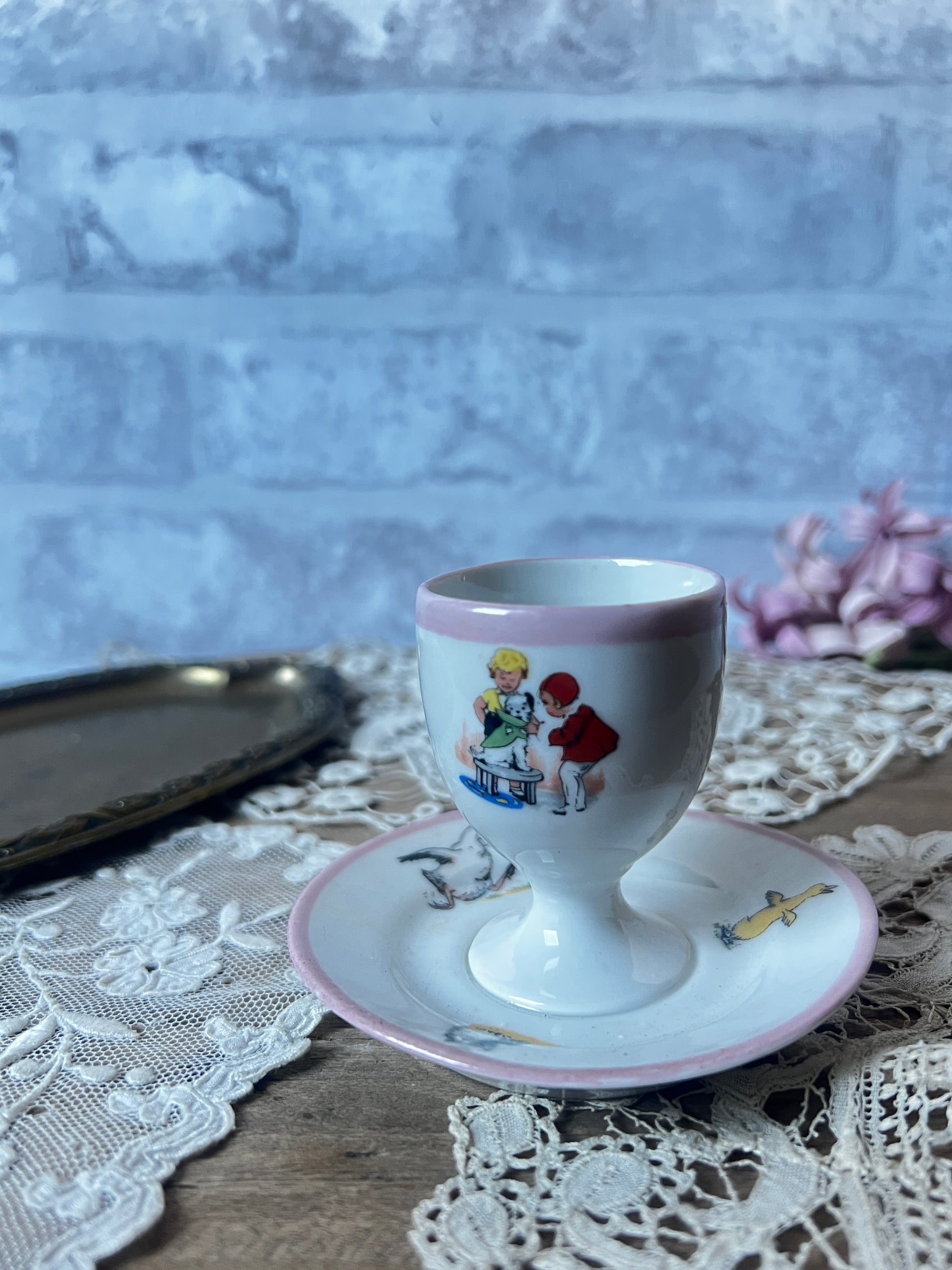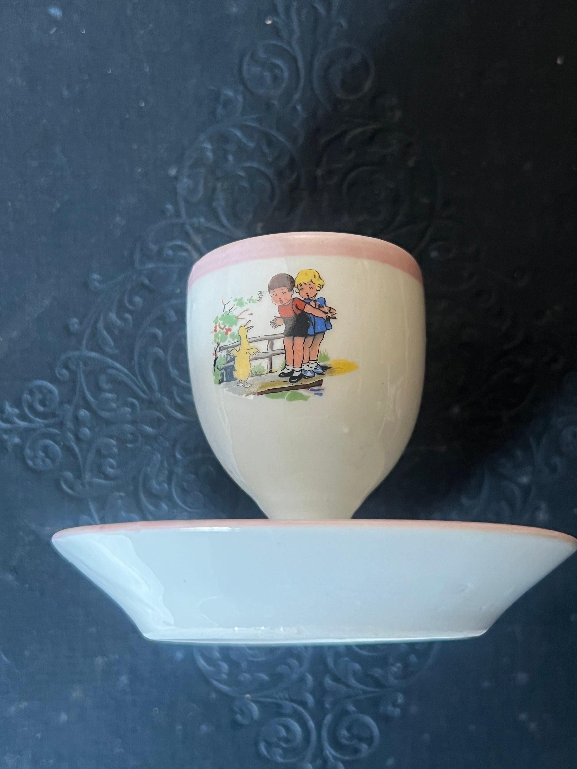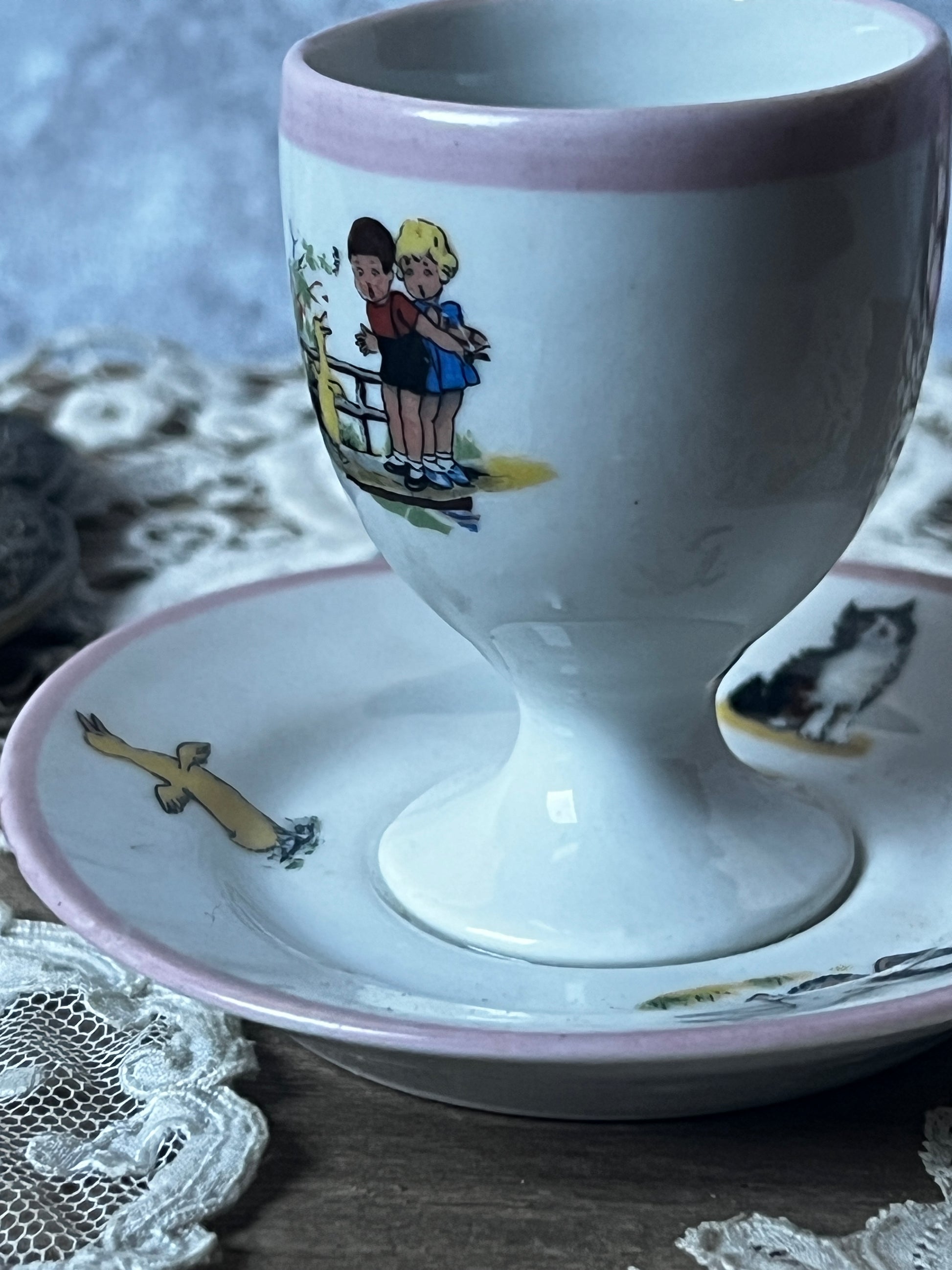 エッグスタンドと受け皿が一体となったユニークなデザインの陶器アイテムです