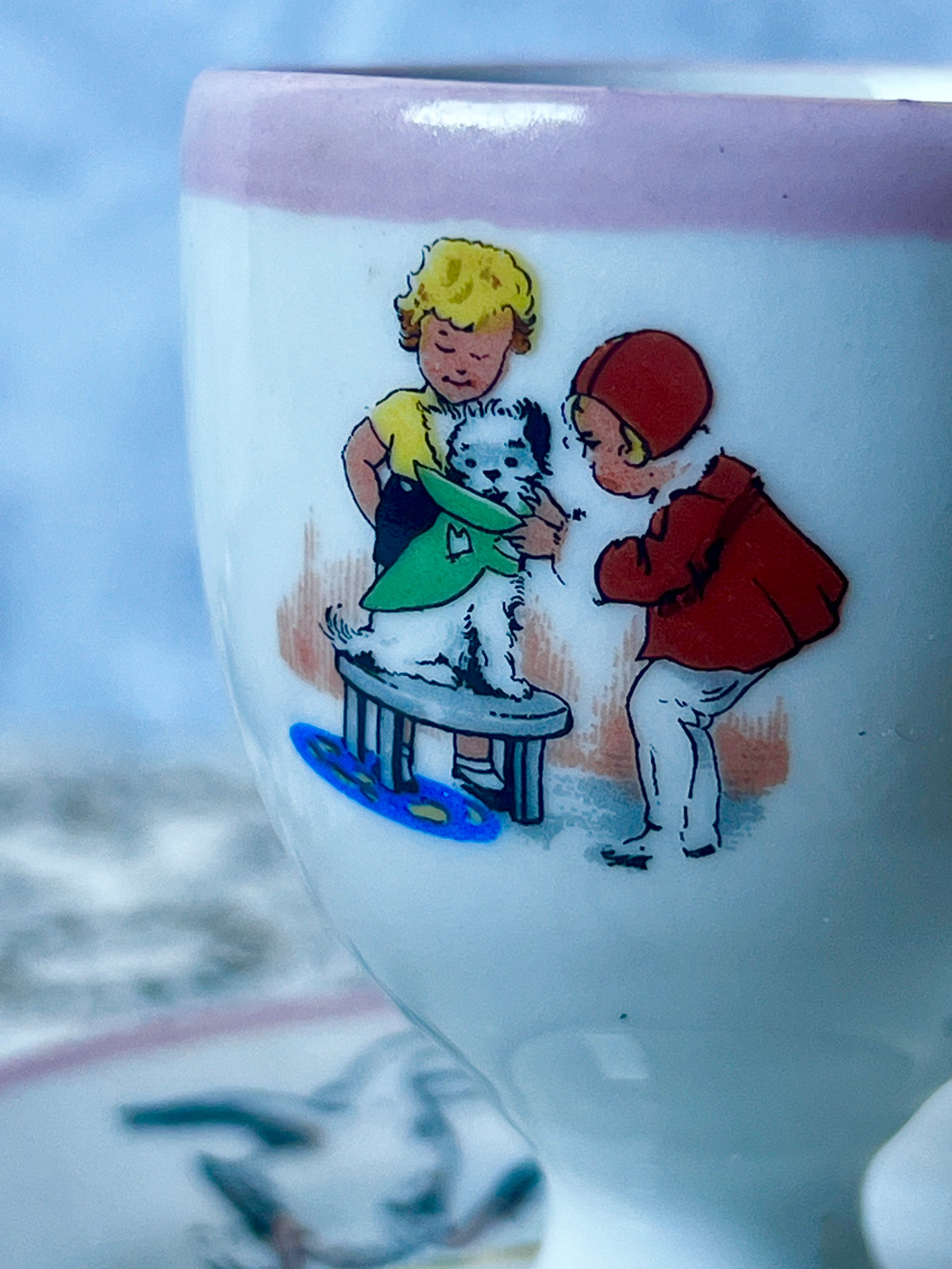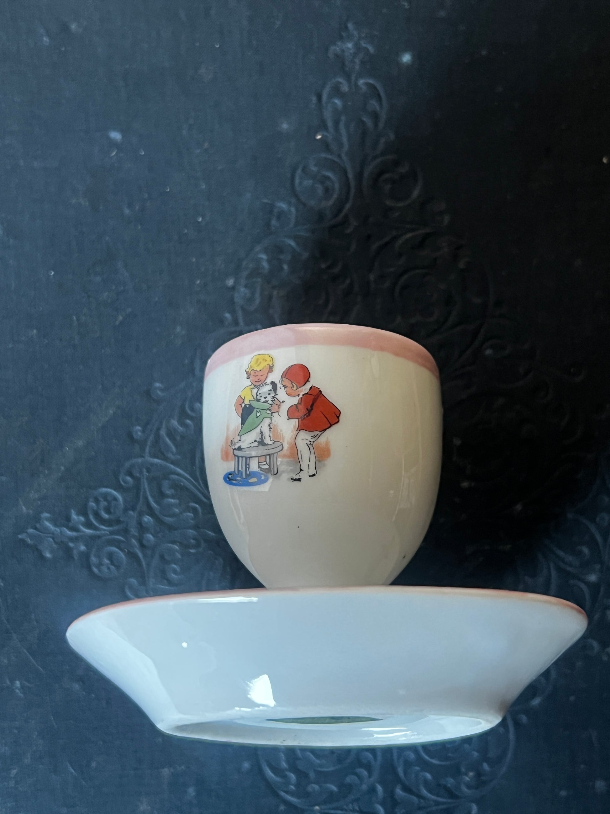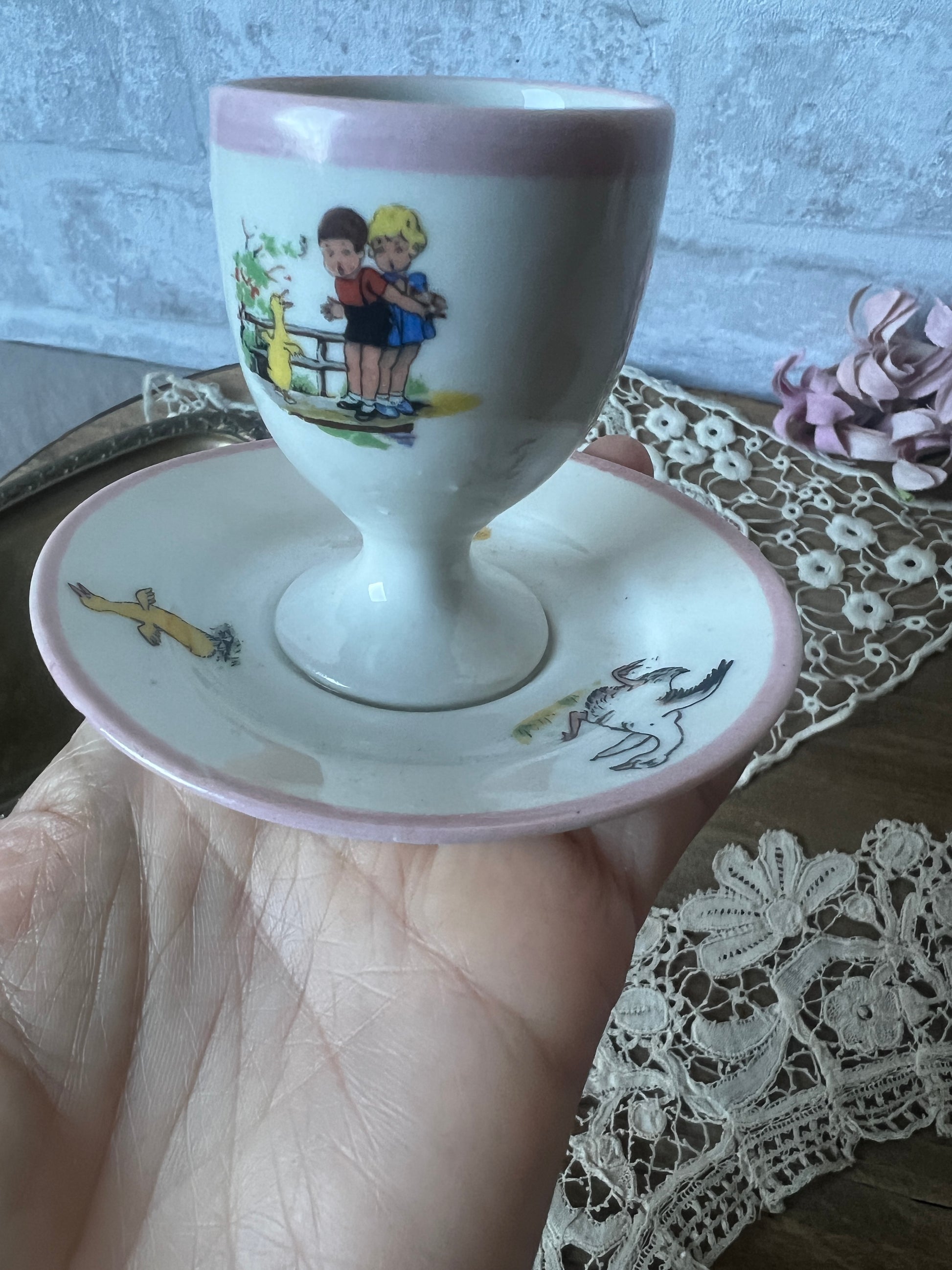 エッグスタンドと受け皿が一体となったユニークなデザインの陶器アイテムです
