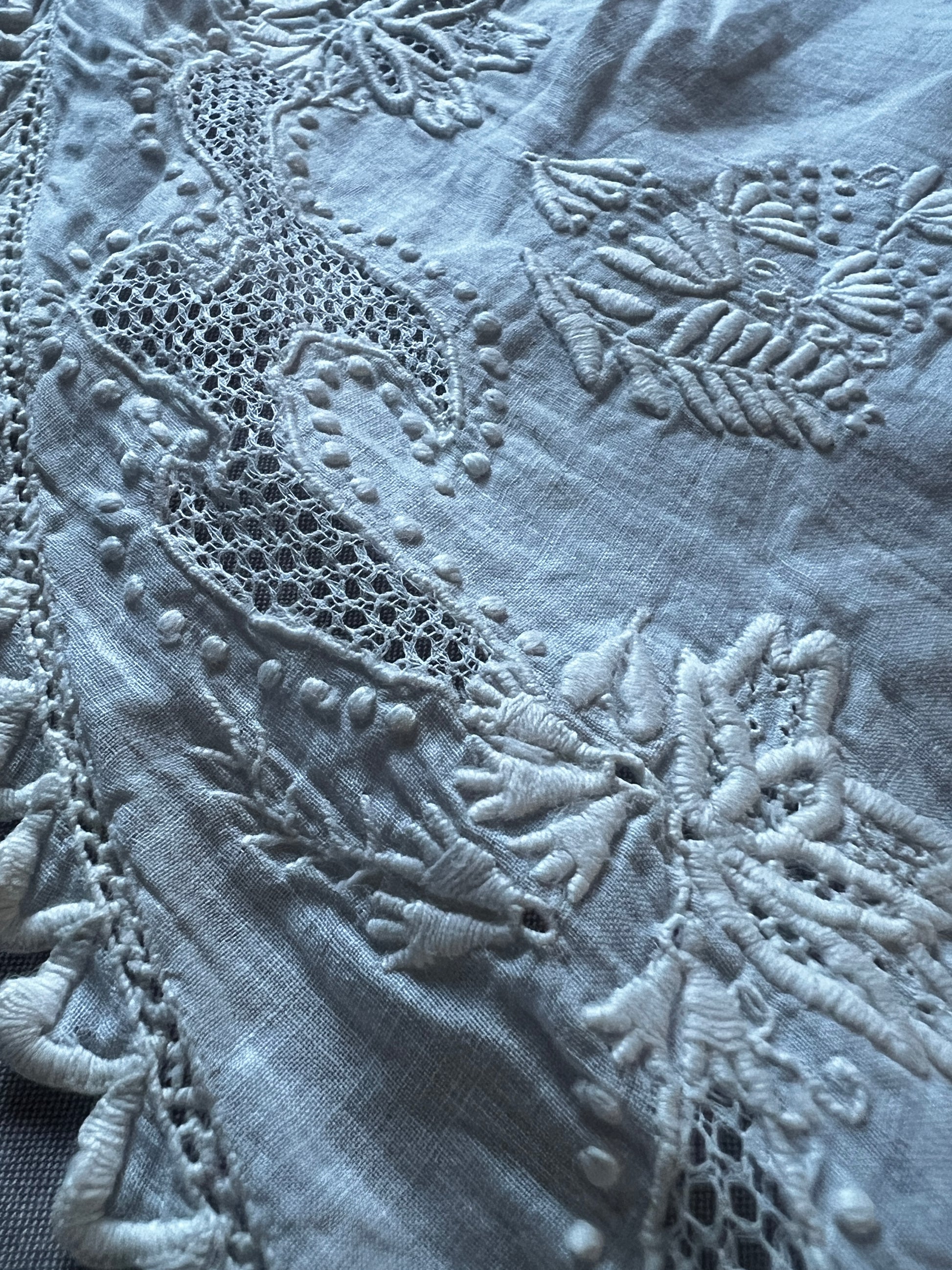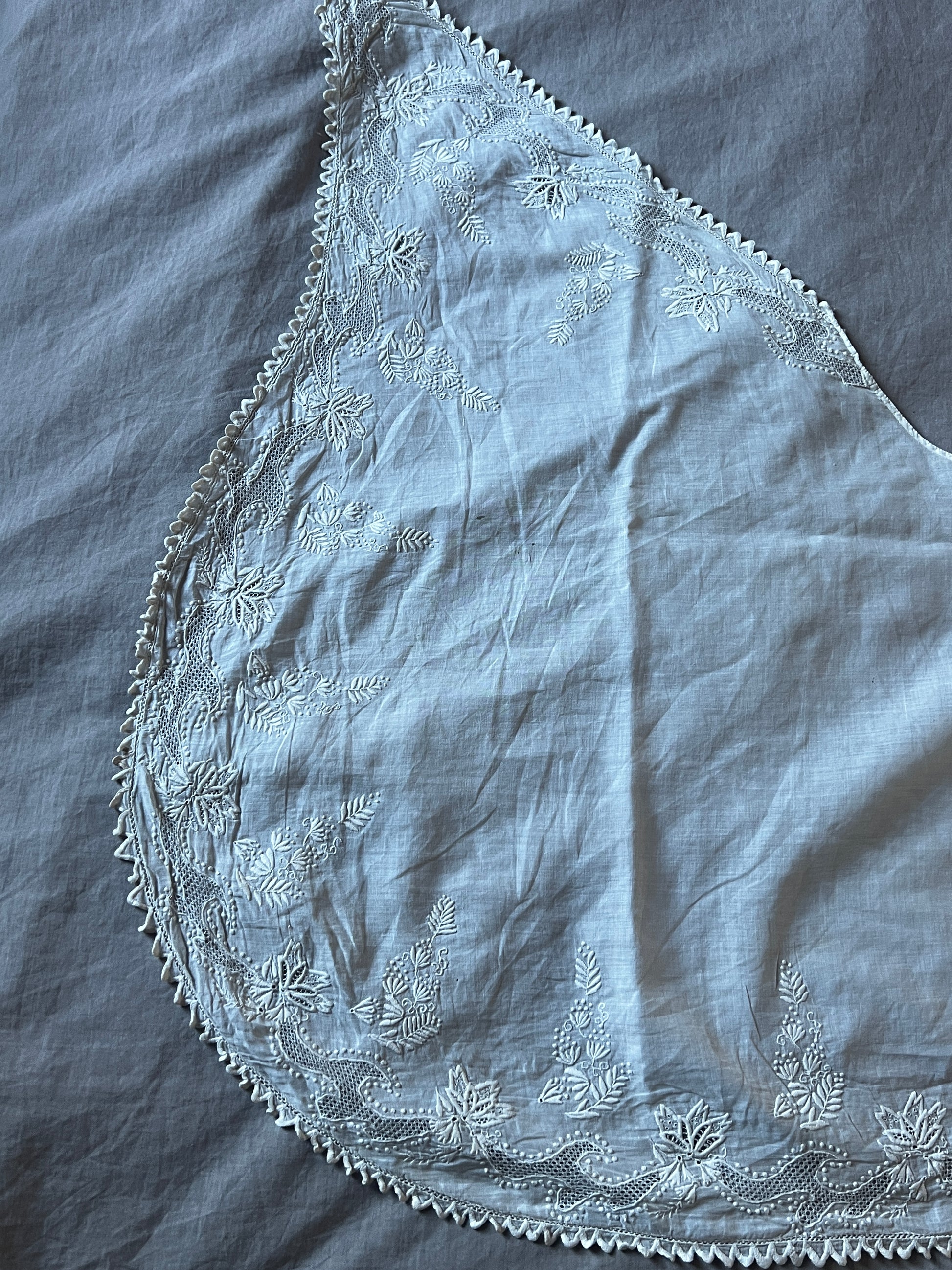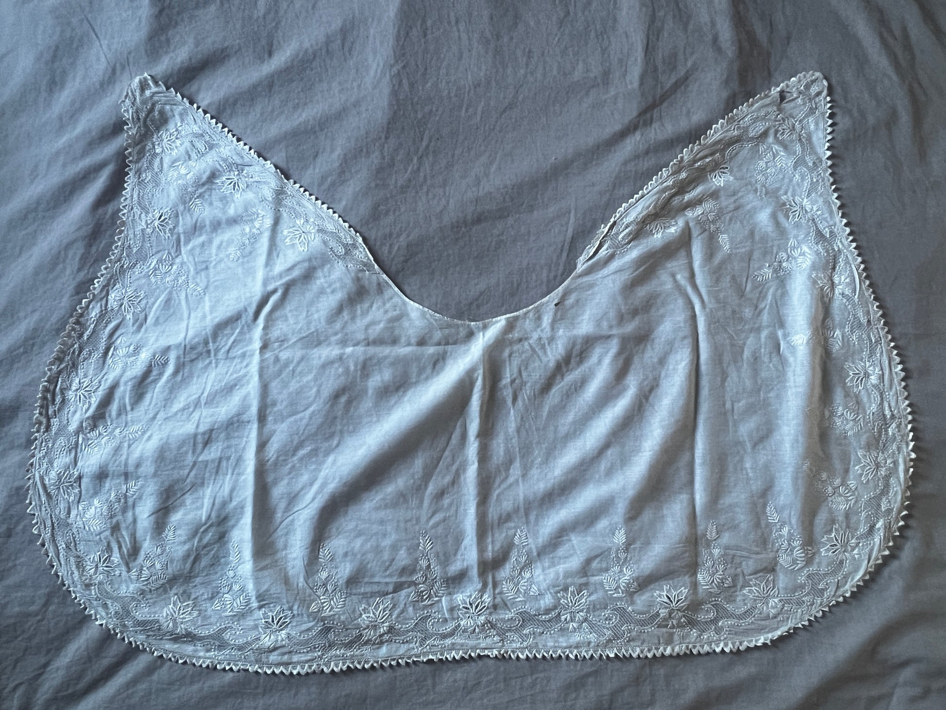 繊細な手刺繍で元々はドレスの一部だったと思われる形です