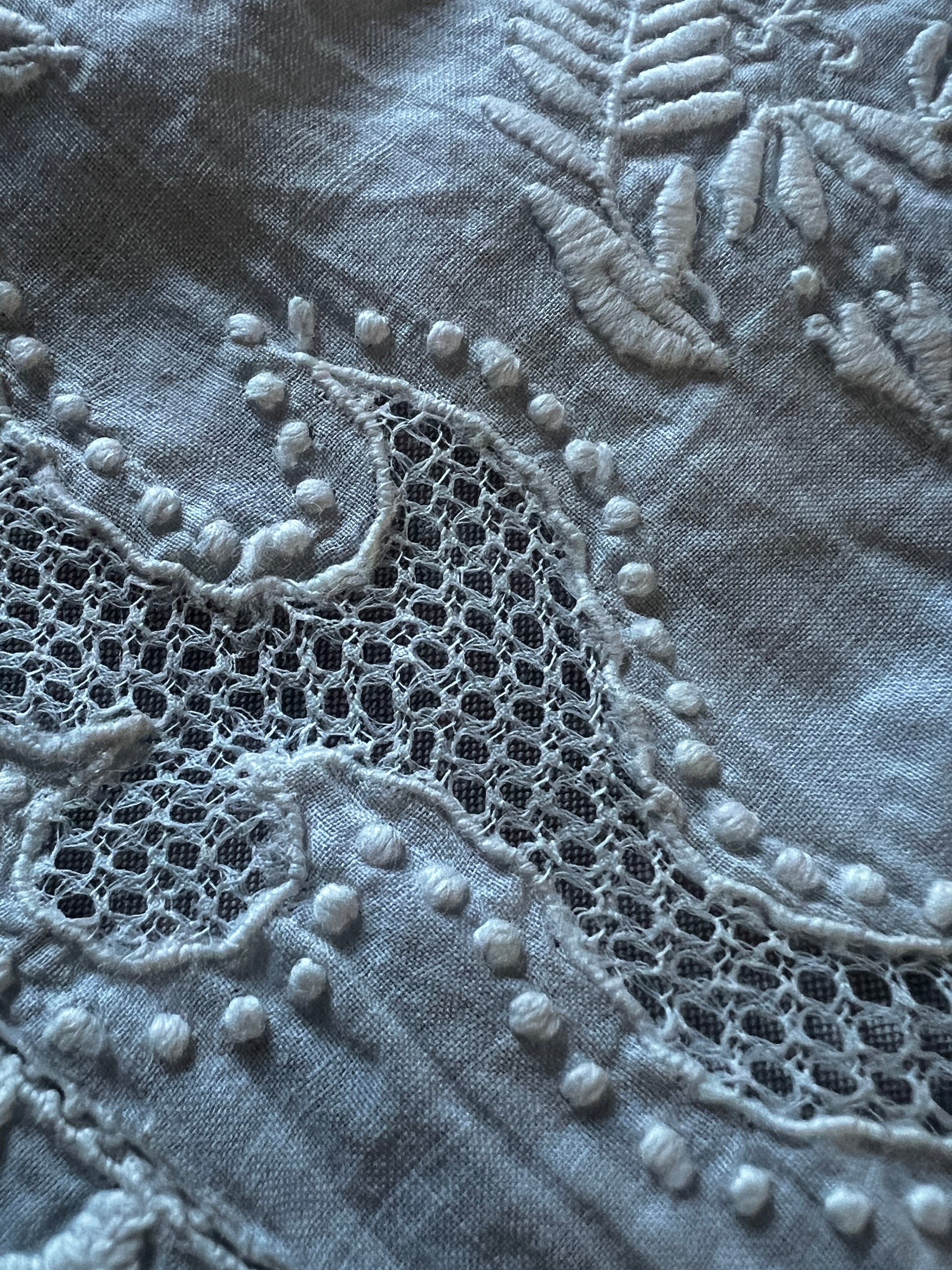 柔らかく薄いローン地に細かなステッチの白刺繍が施されています