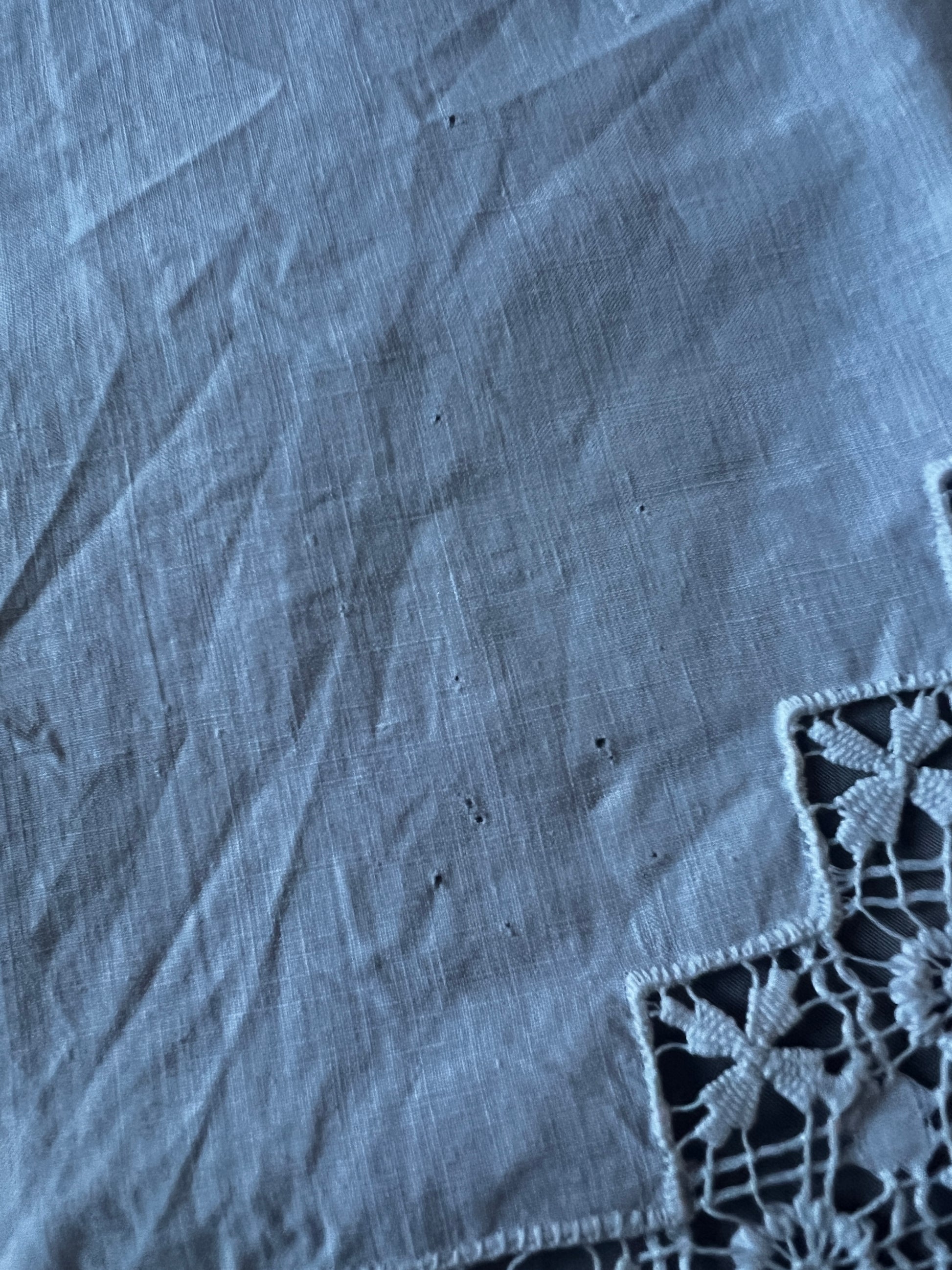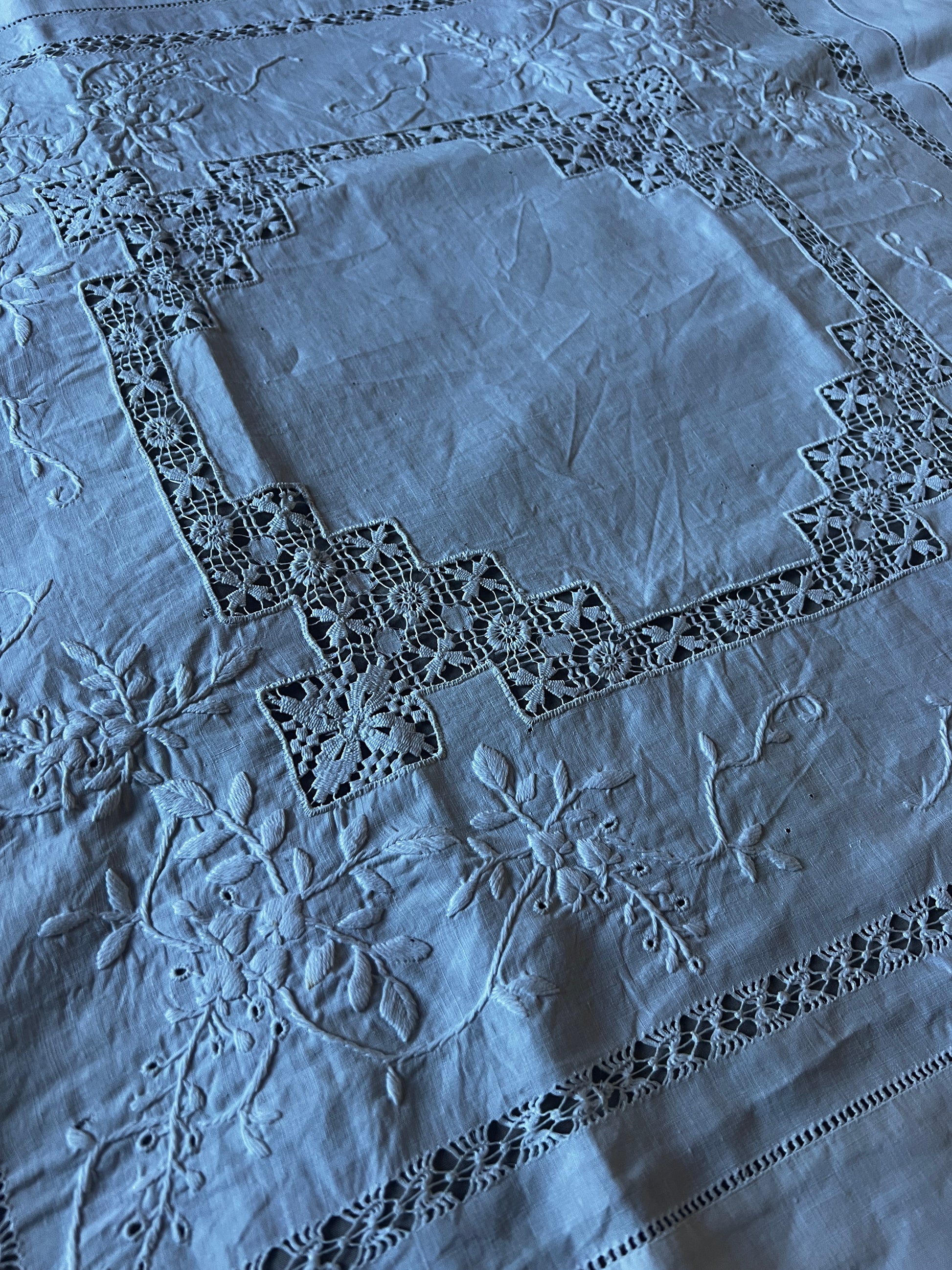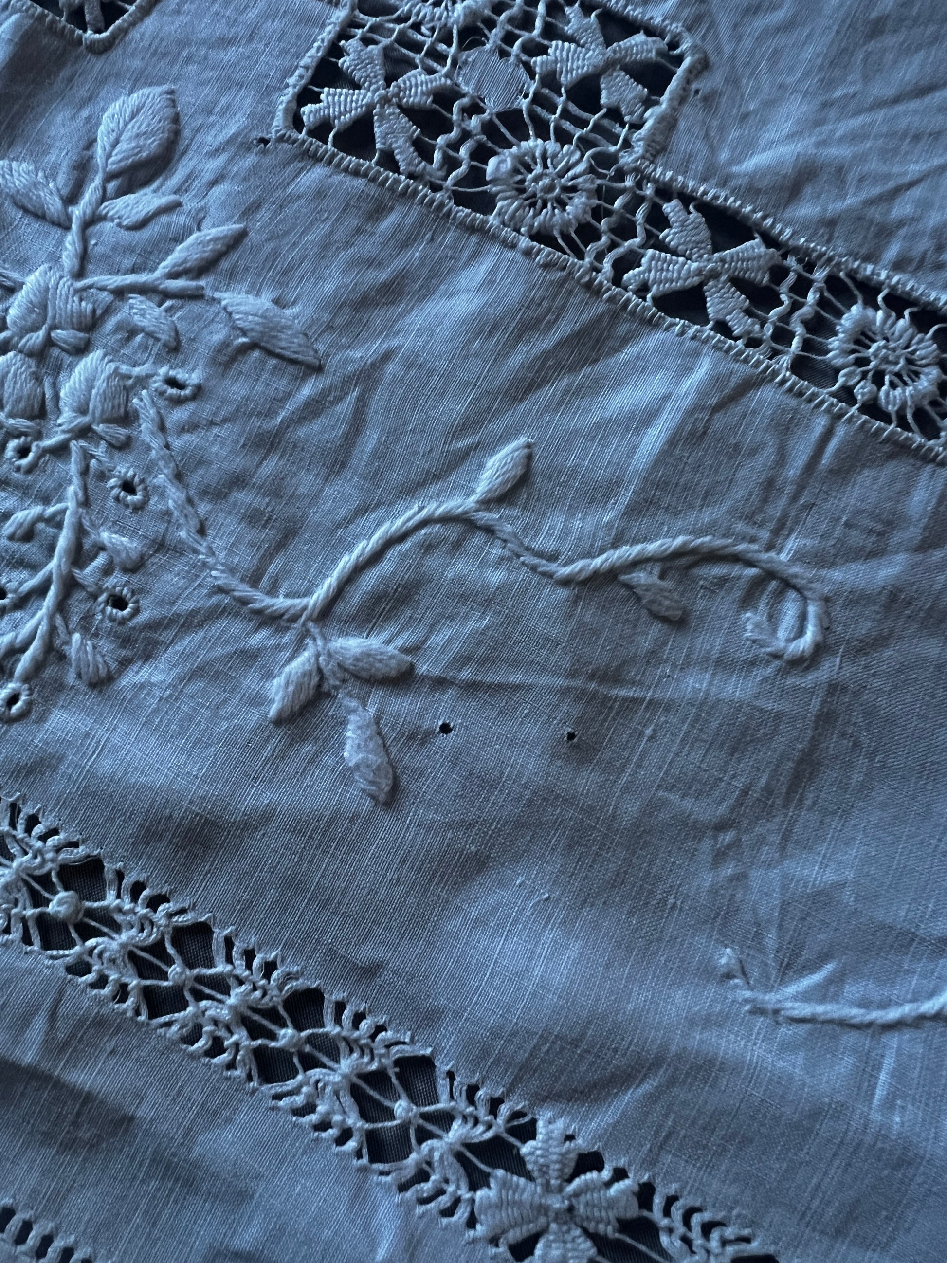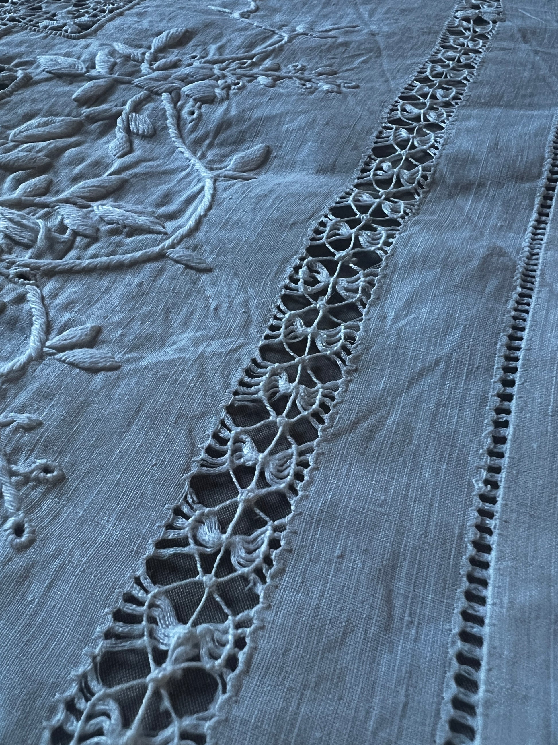 白刺繍とレース、ドロンワークが丁寧に組み合わされたクロスです