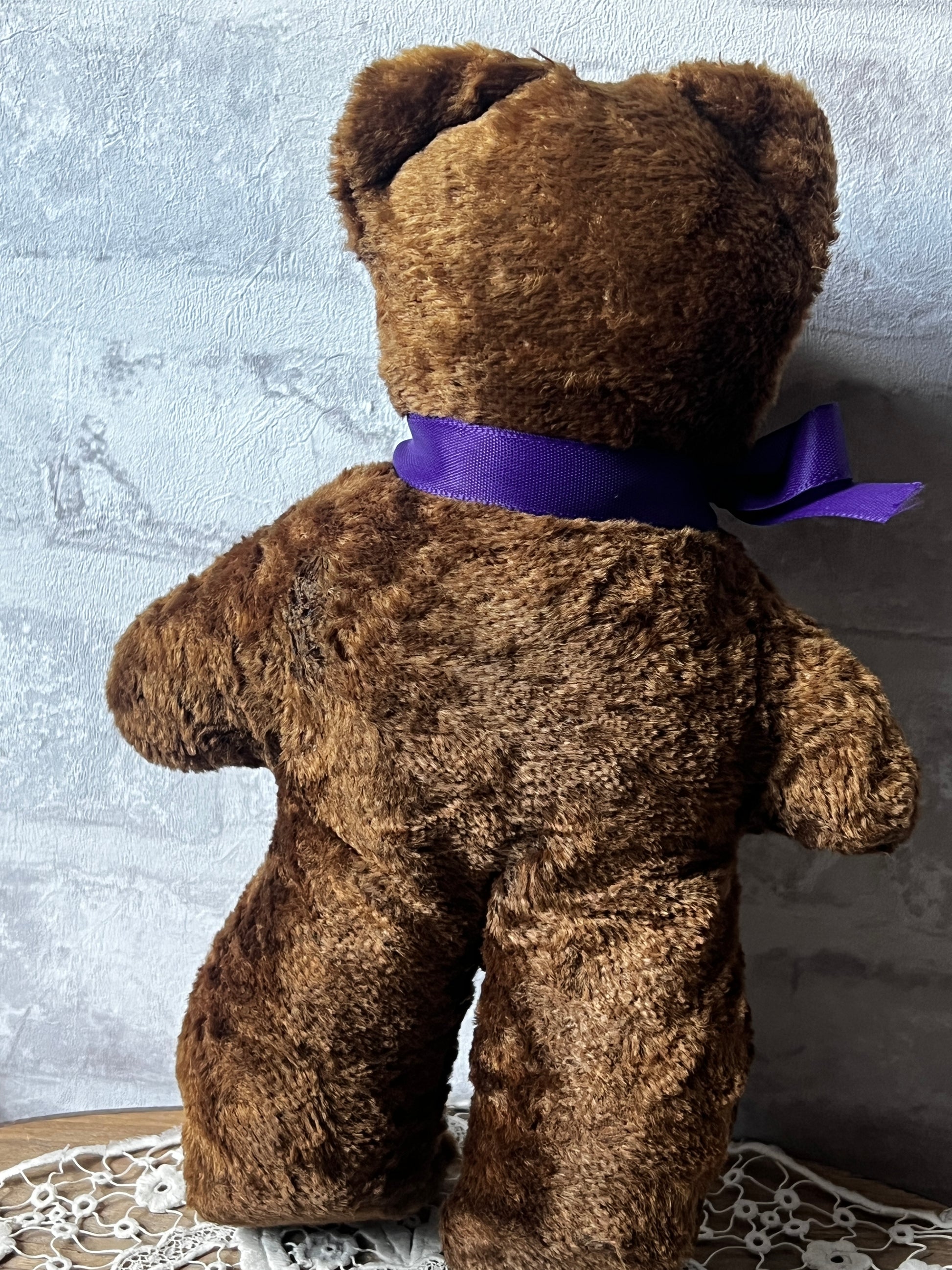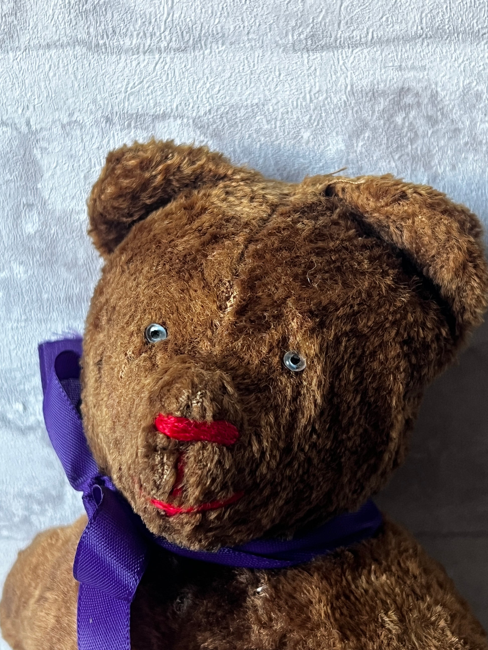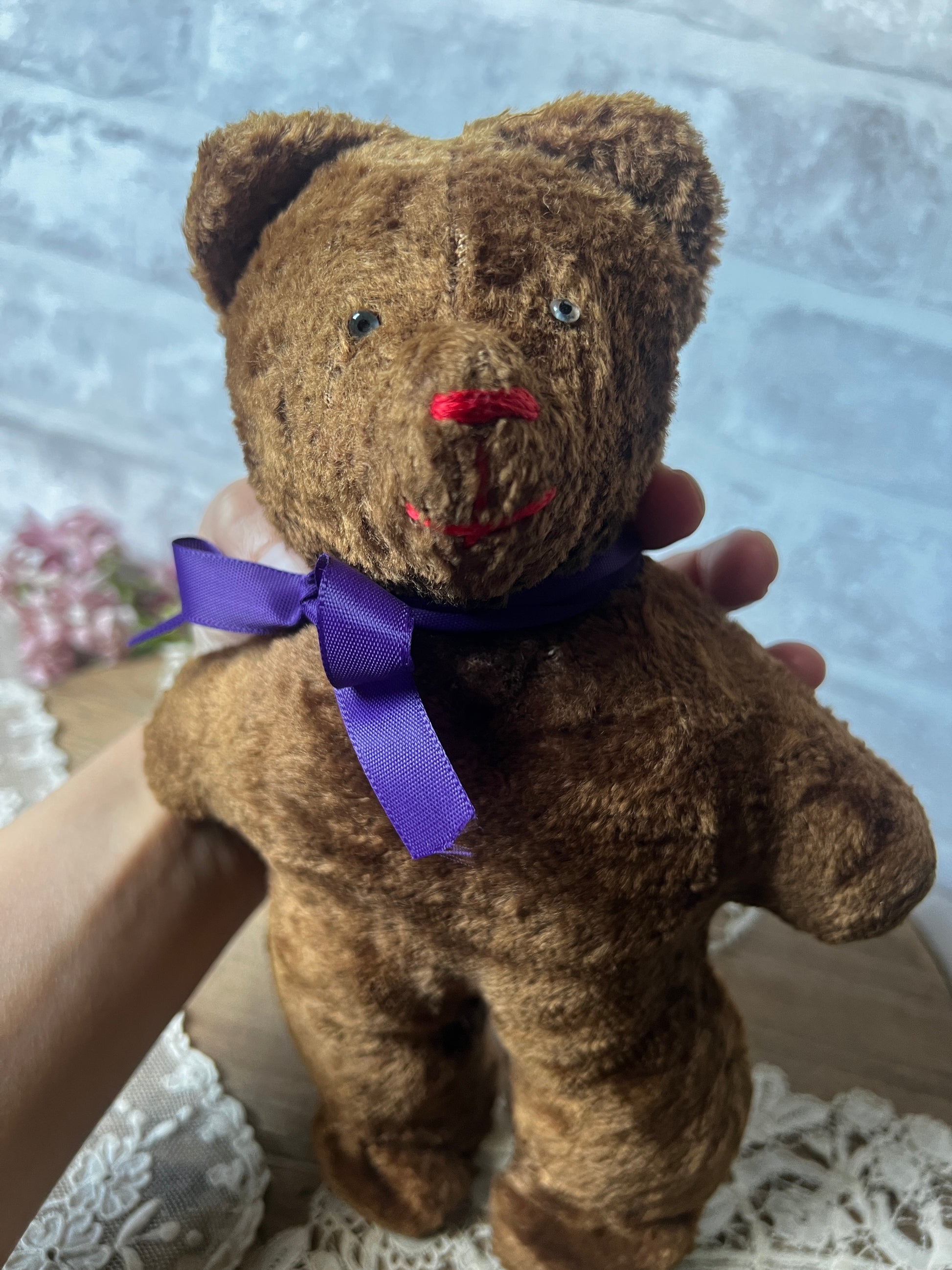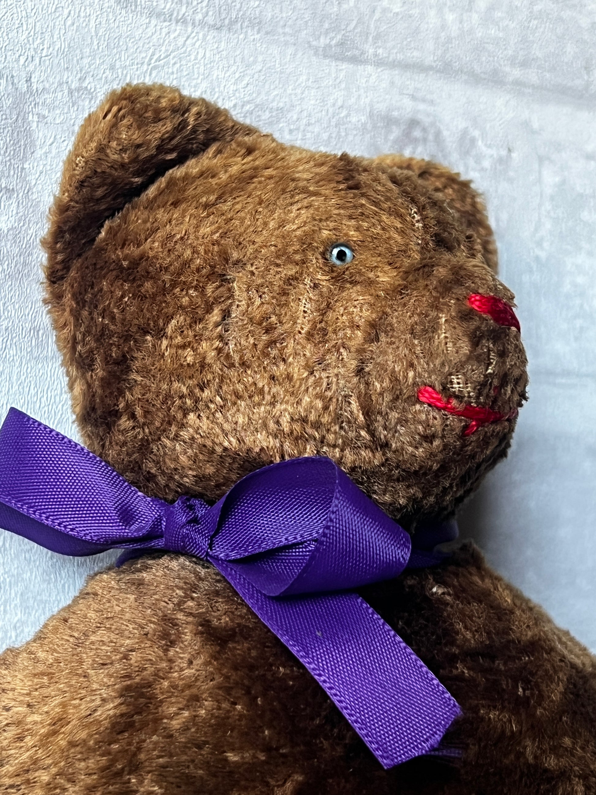小さなグラスアイ、首には上品な紫色のリボンが結ばれています