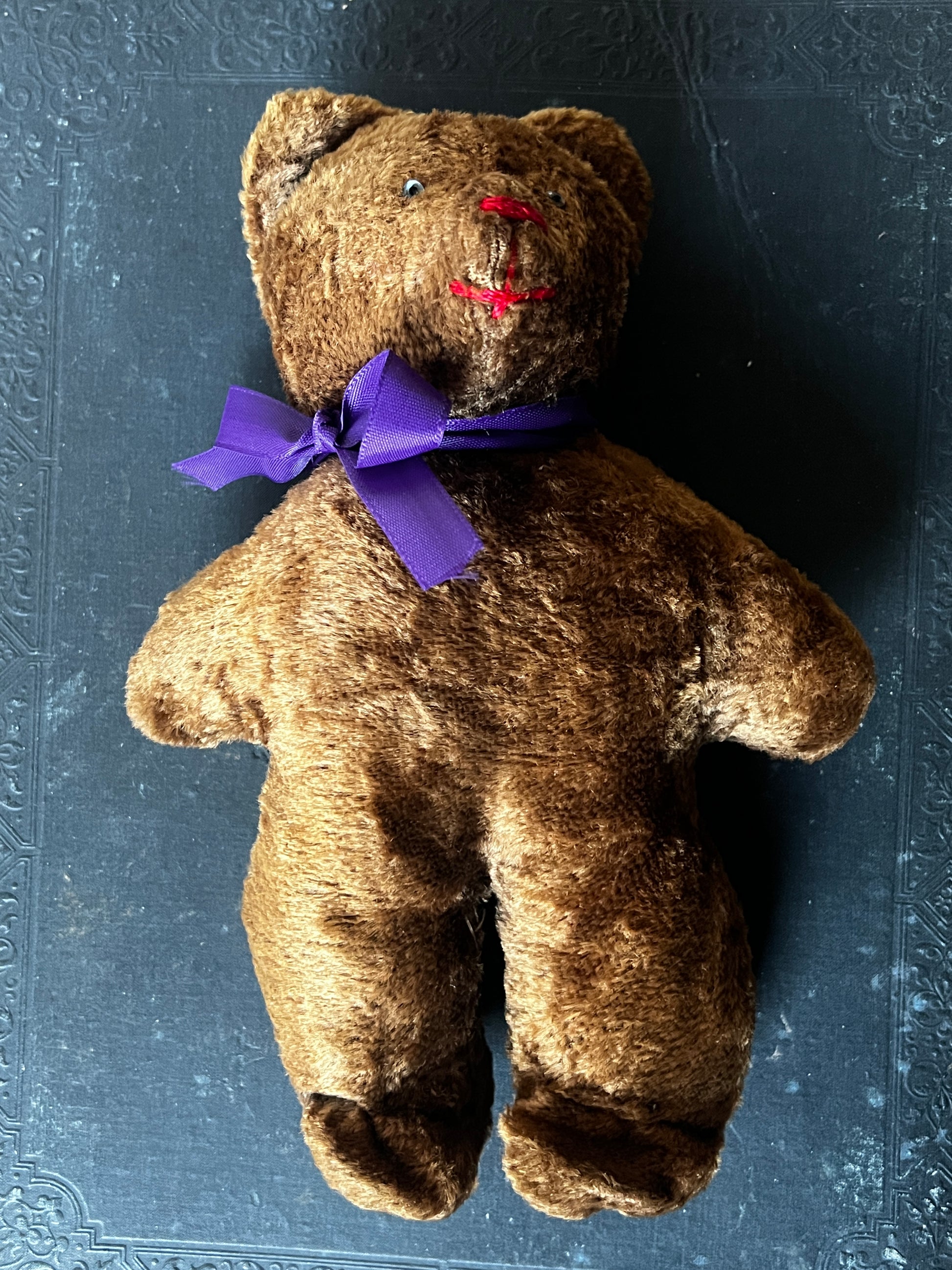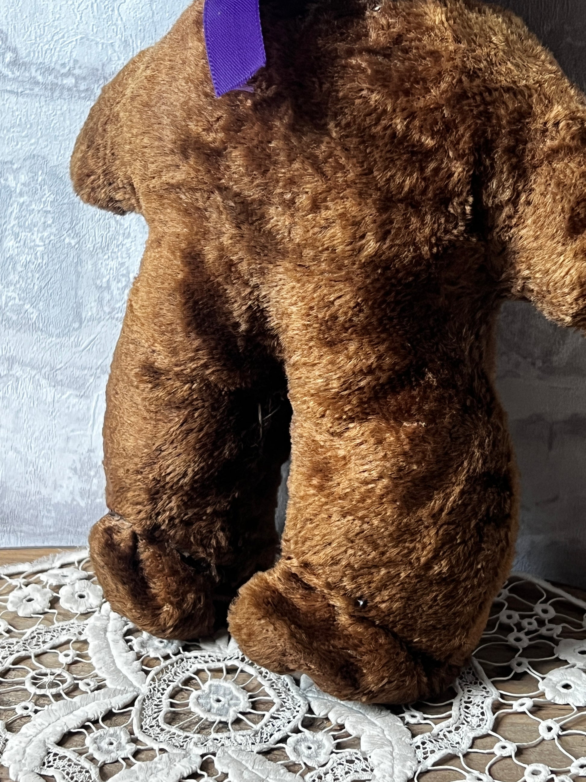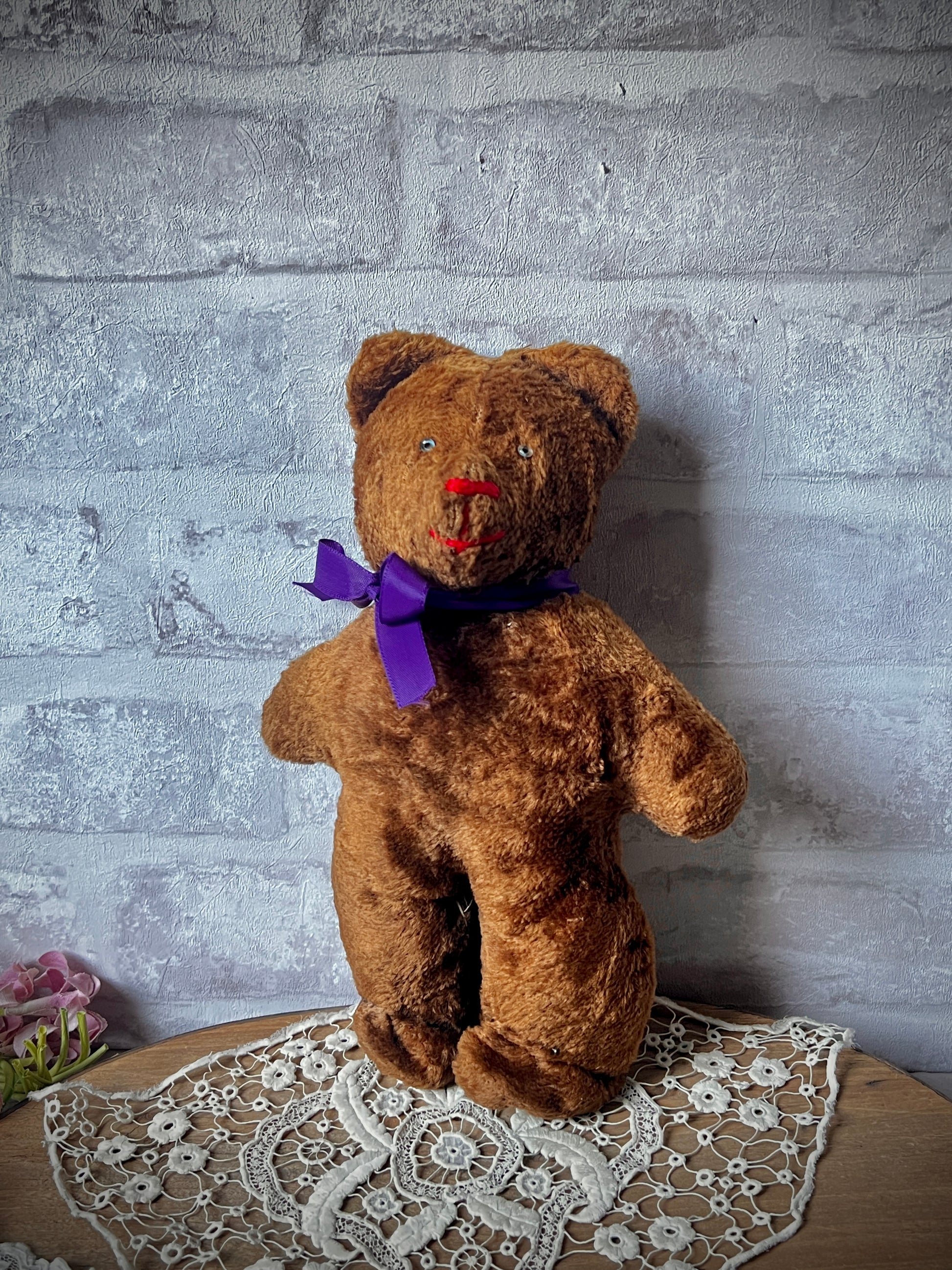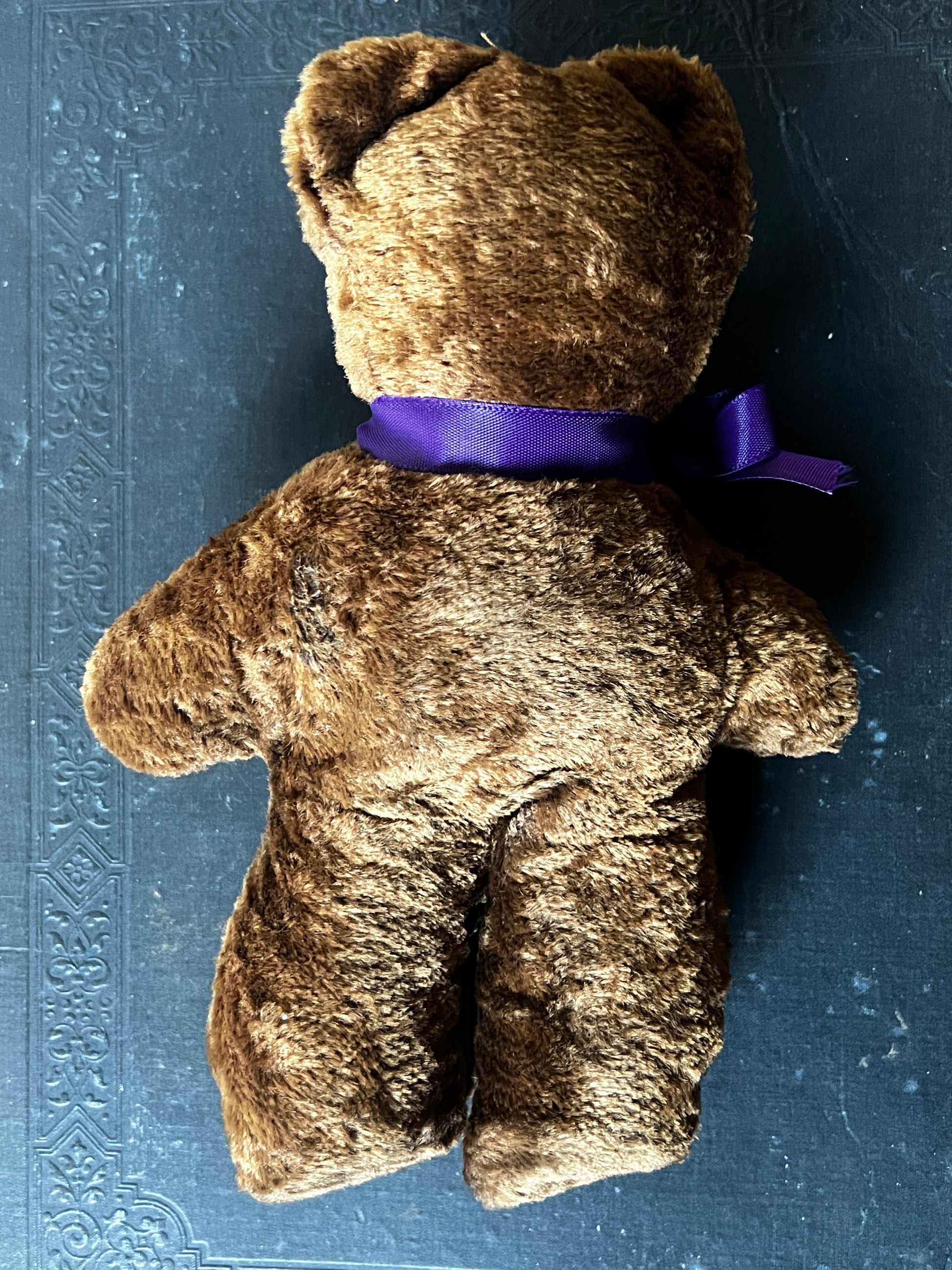 小さなグラスアイ、首には上品な紫色のリボンが結ばれています