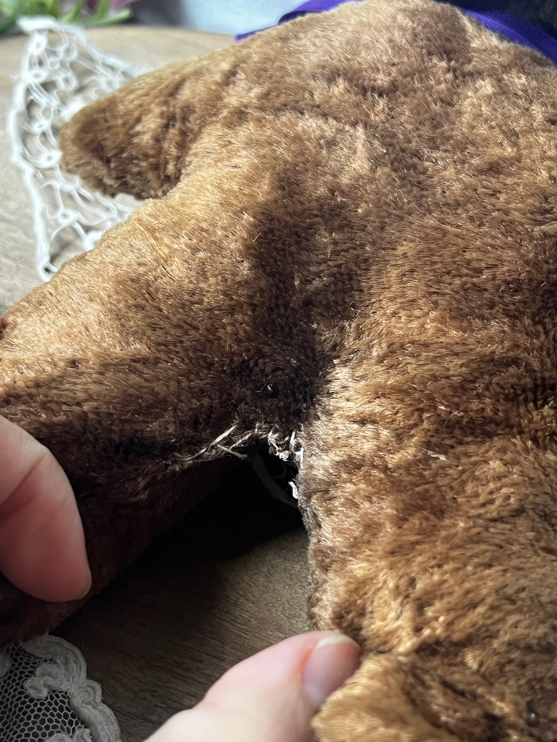 脚の付け根部分には過去の修繕痕が縫い目として残っており、背中には少し硬化した感触の部分がございます