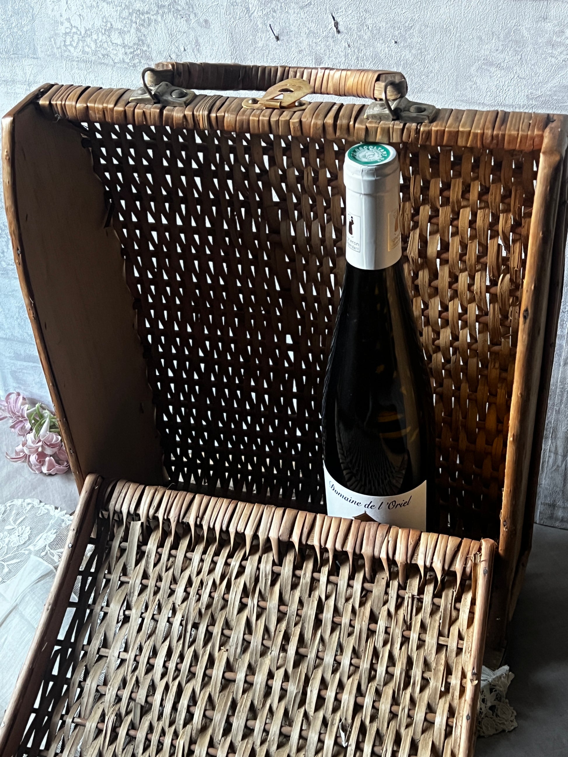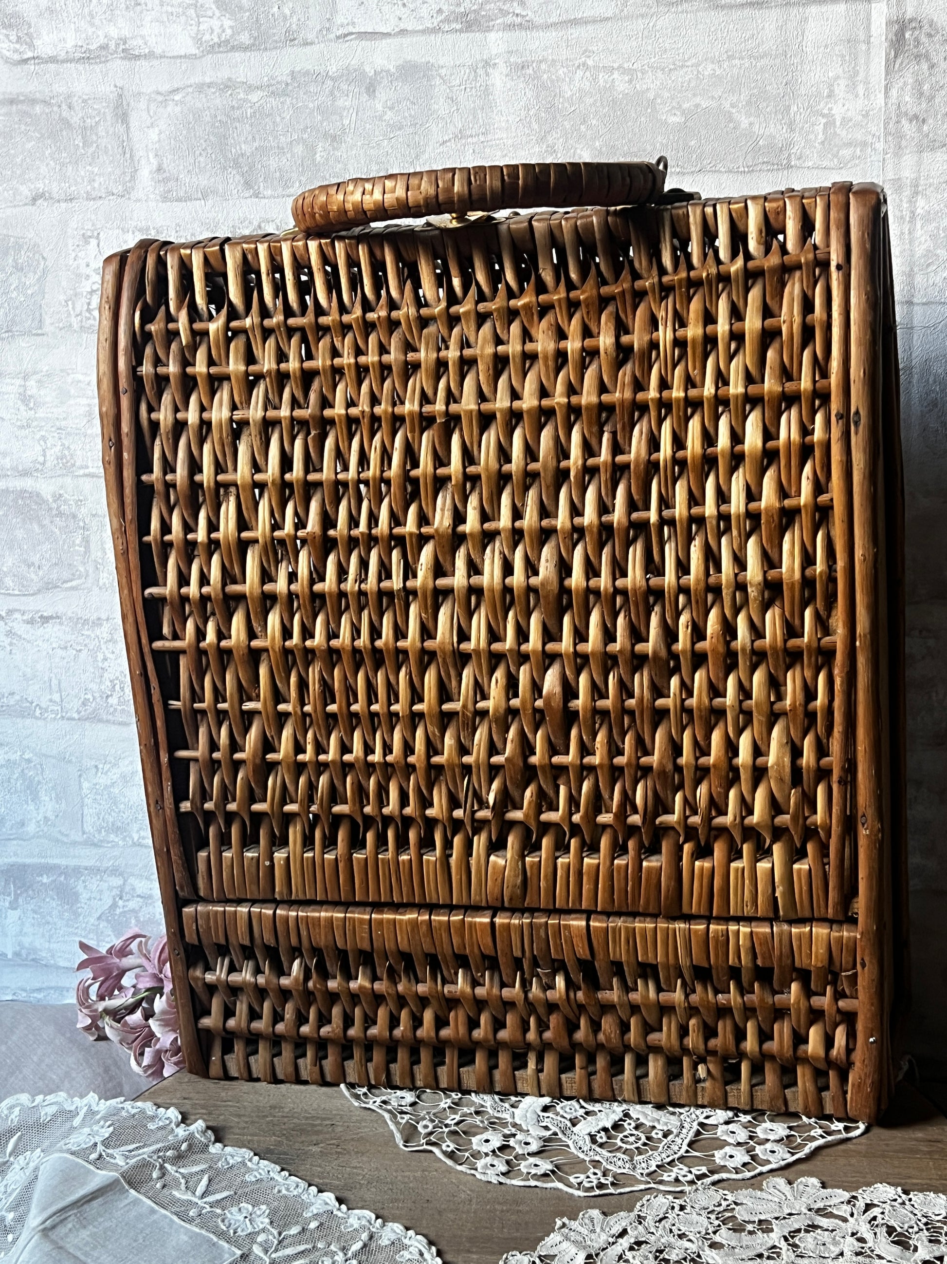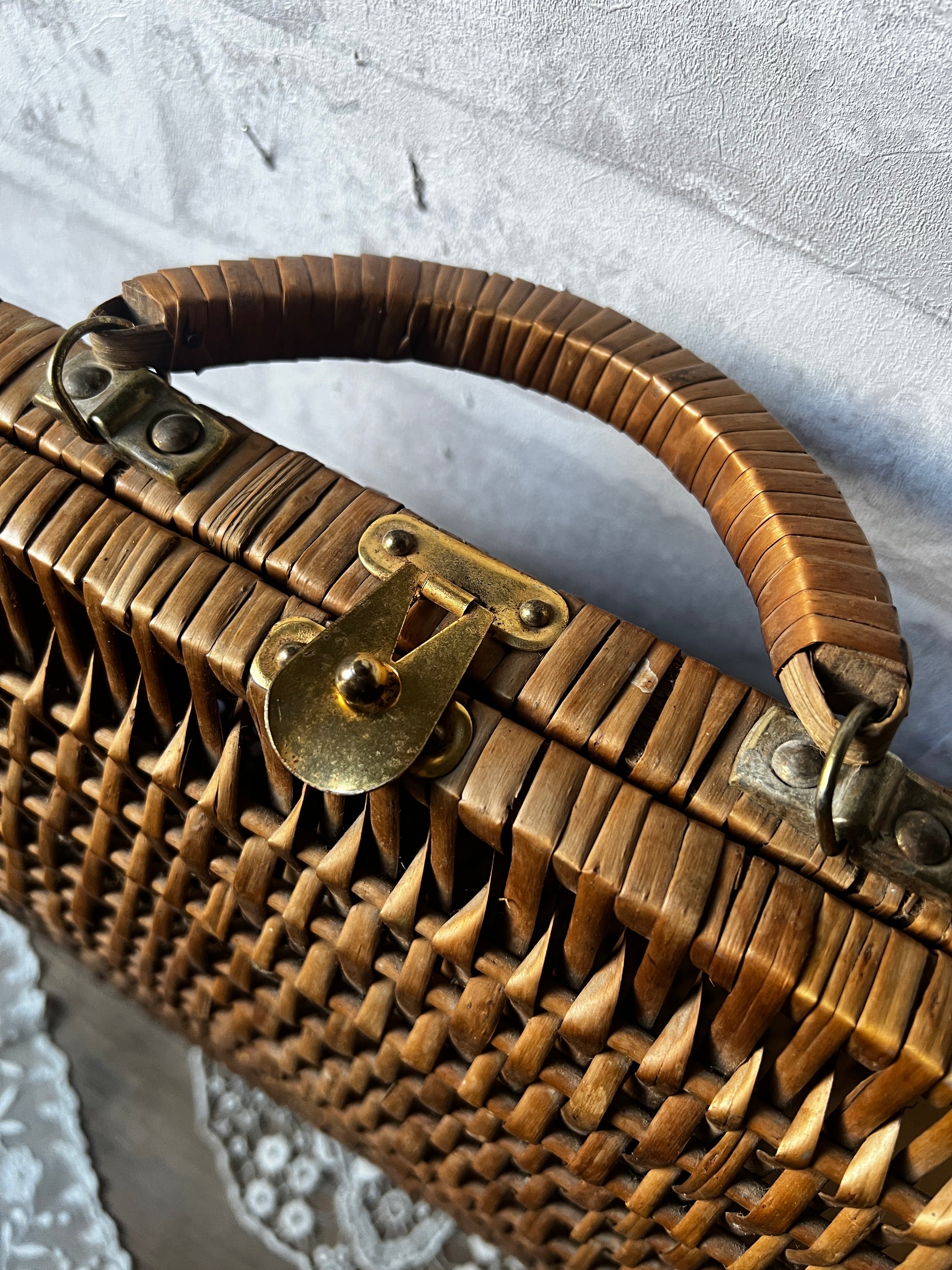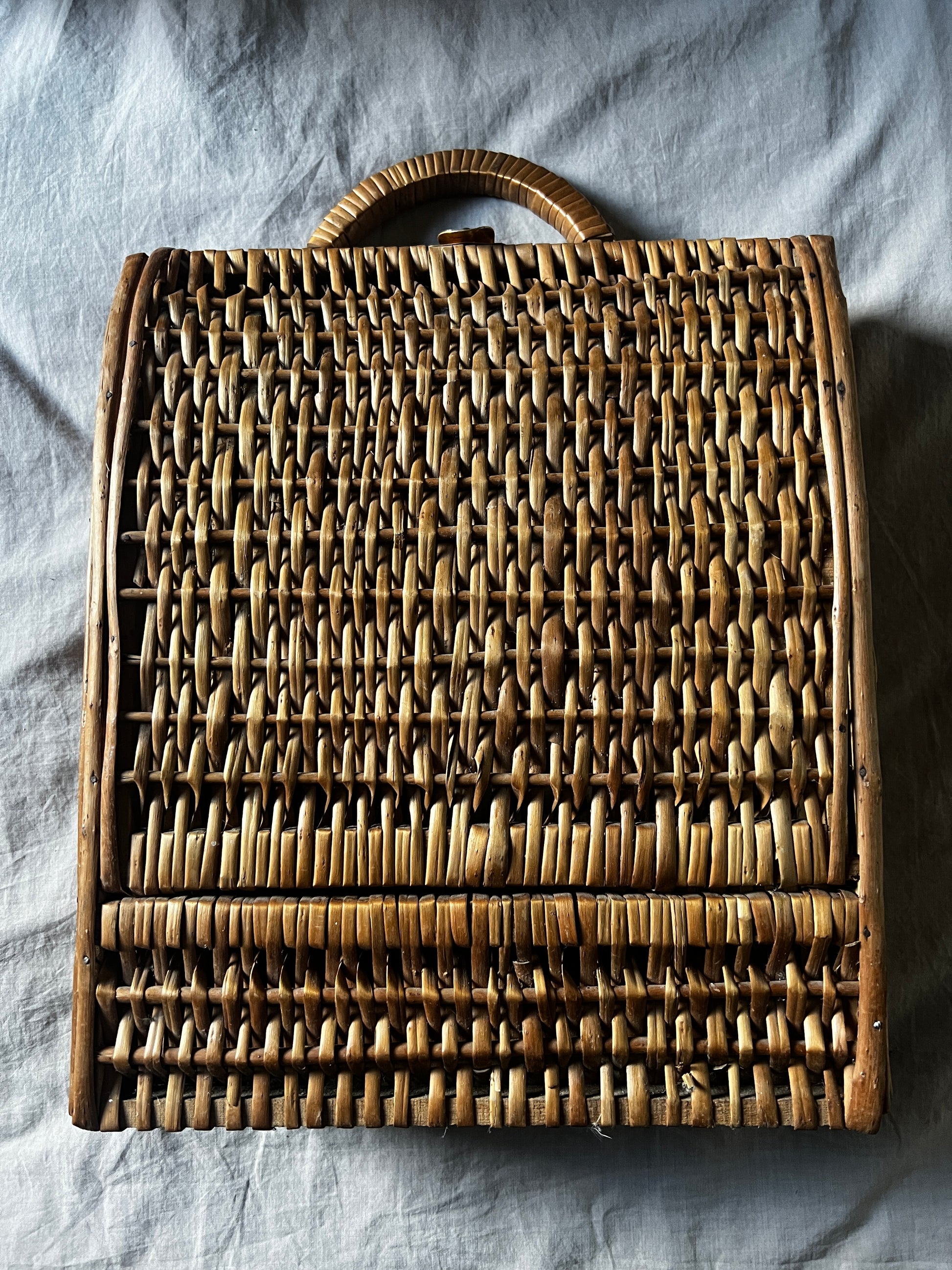 籐で丁寧に編まれたしっかりとした造りで、上部には留め金と持ち手がついており、持ち運びにも便利な仕様です