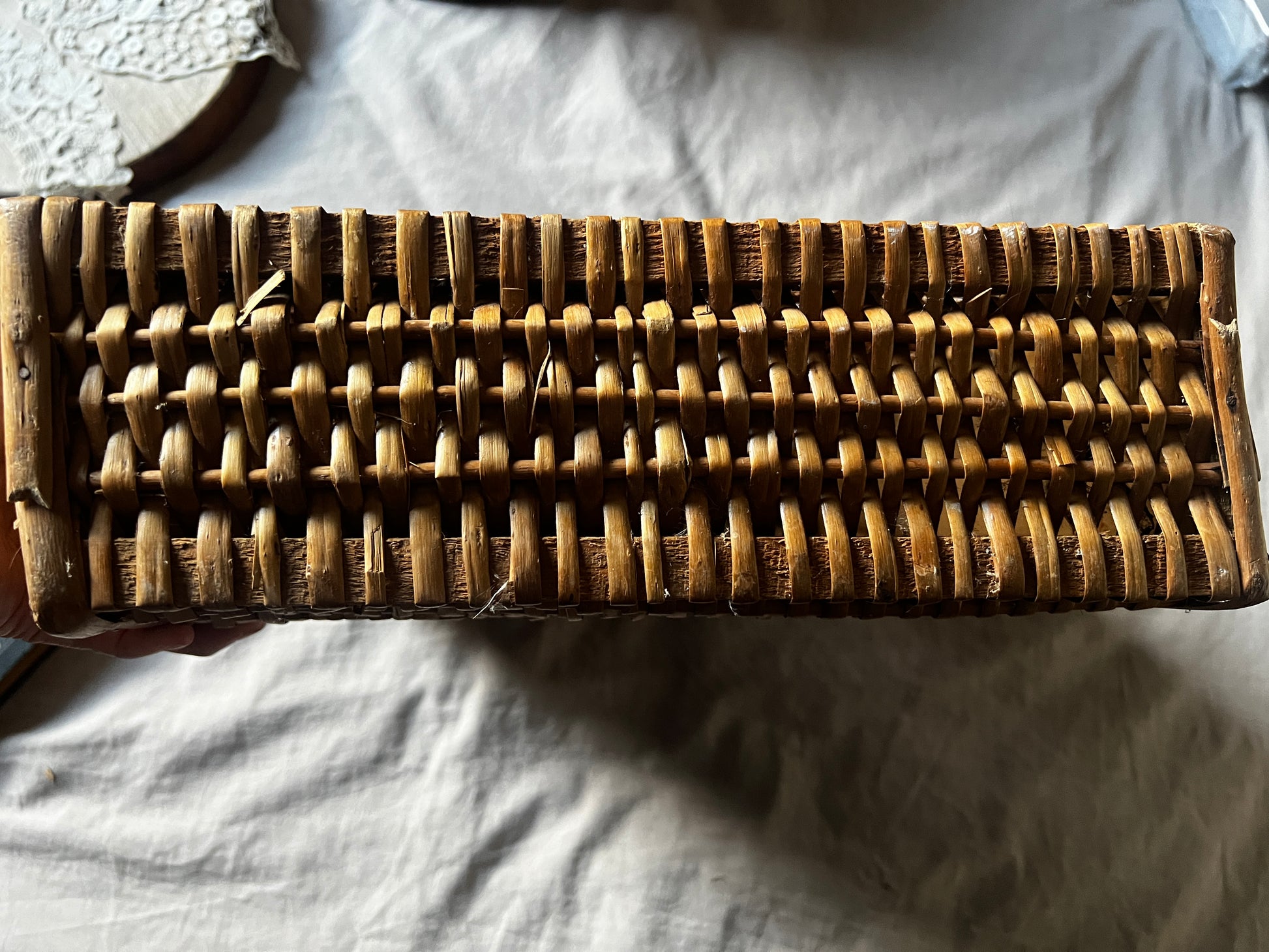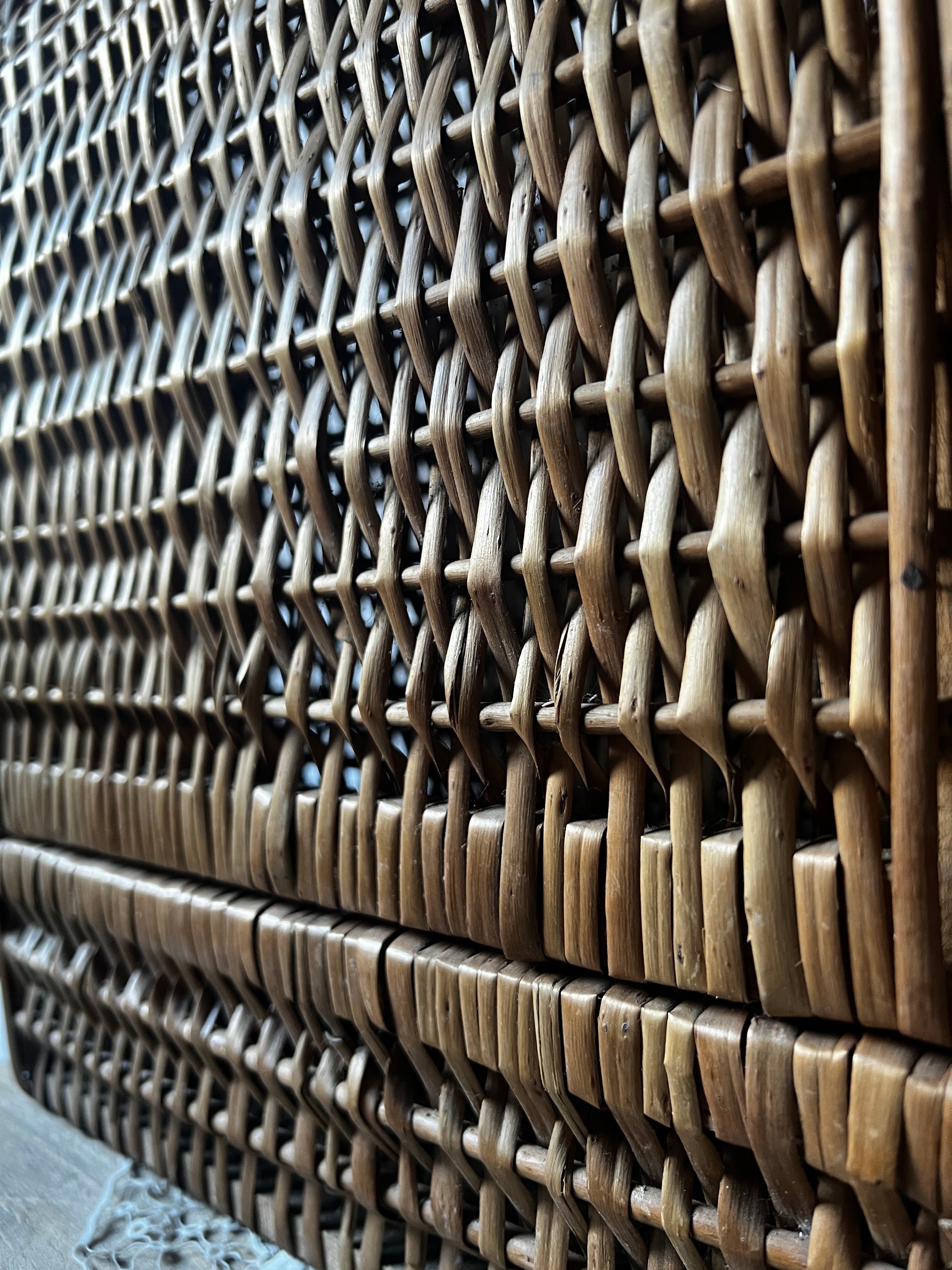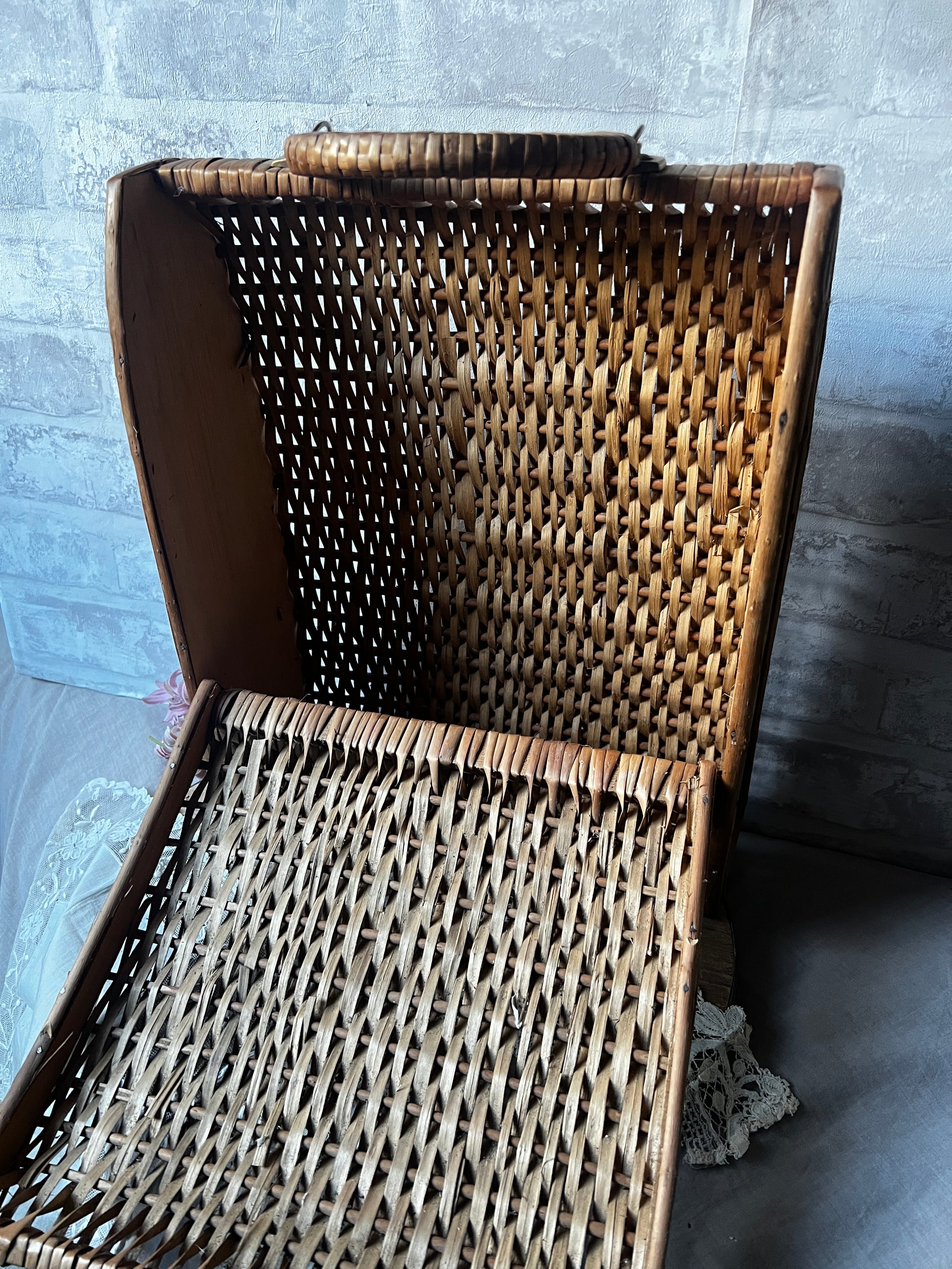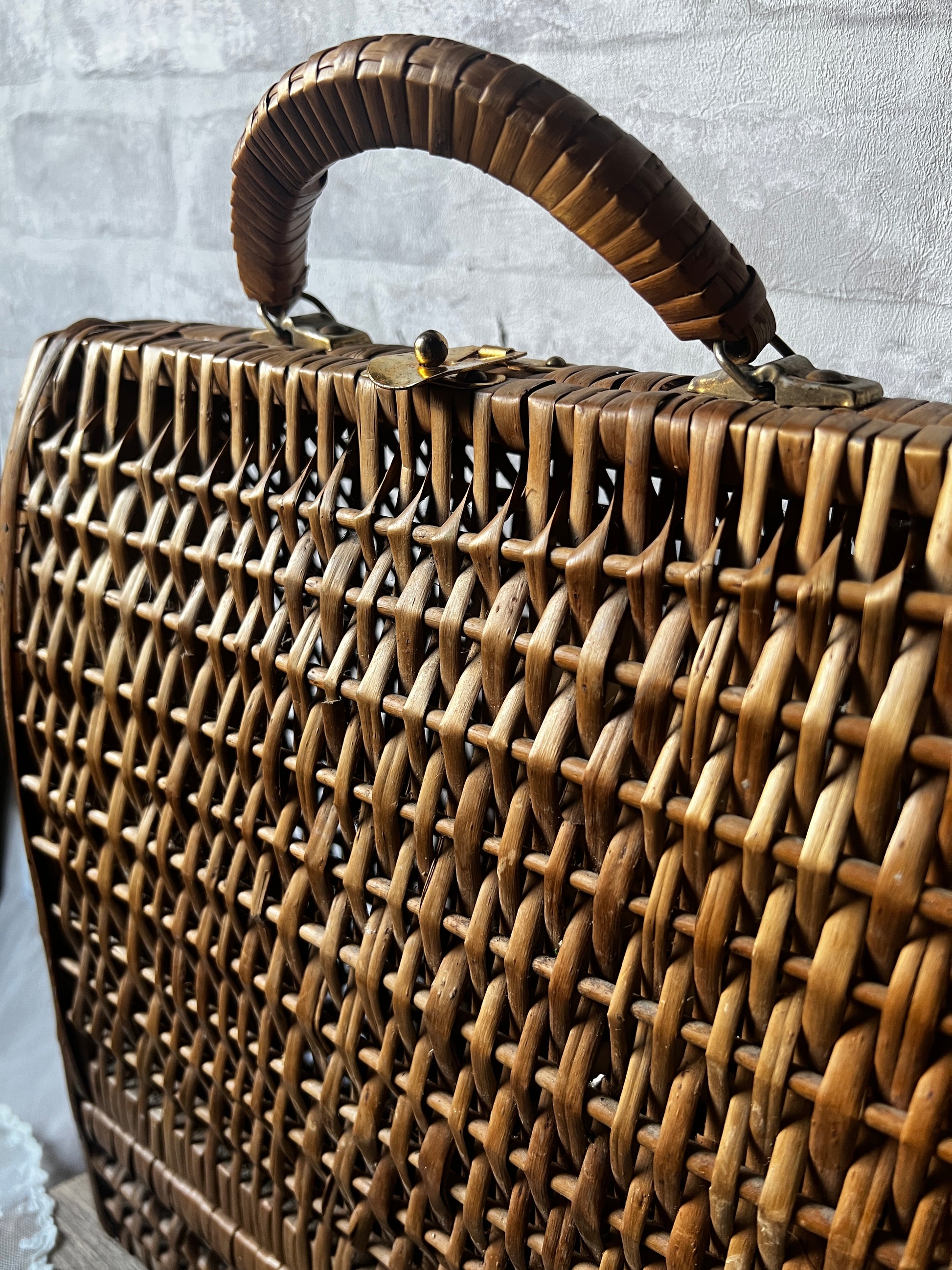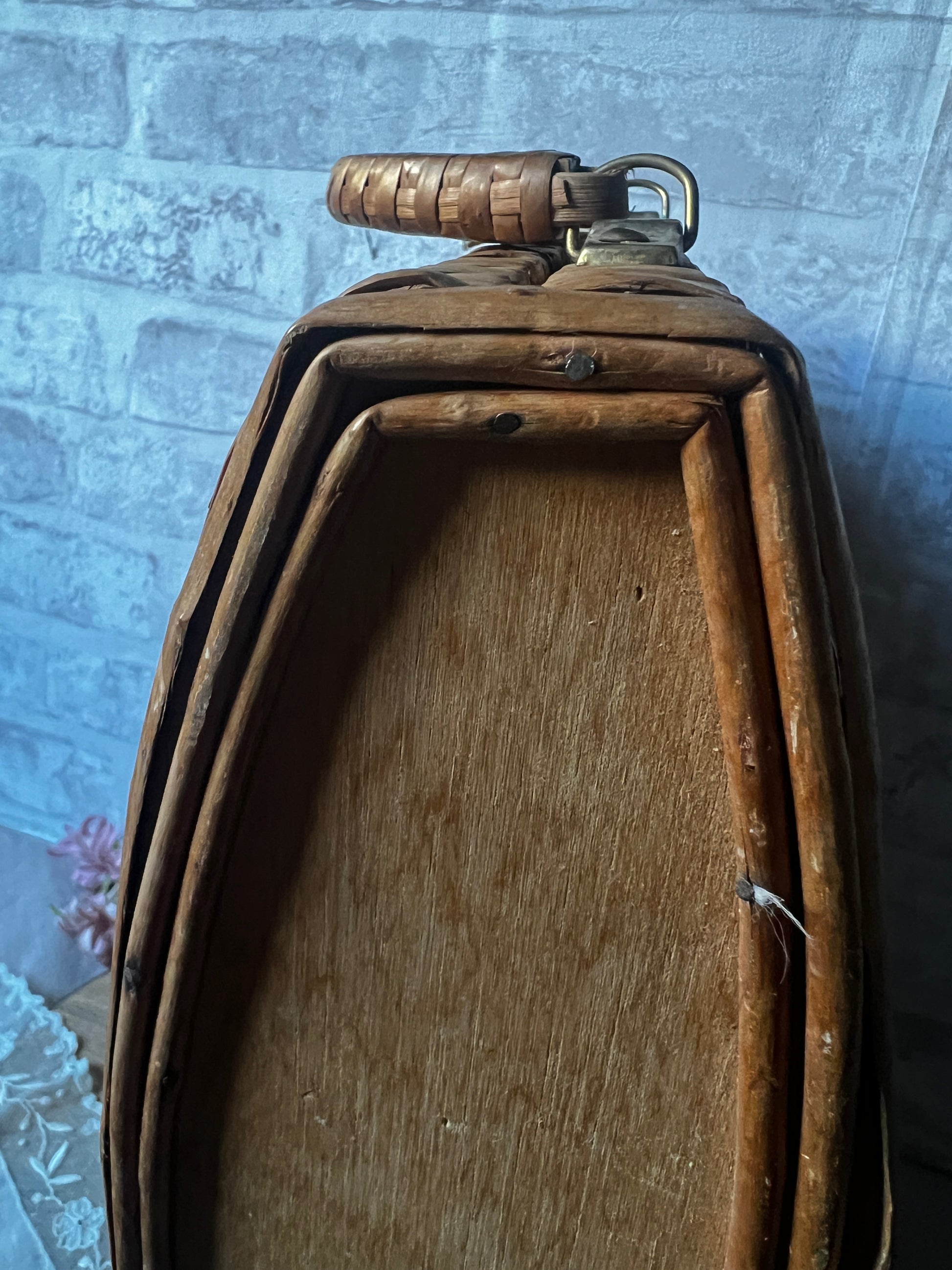 籐で丁寧に編まれたしっかりとした造りで、上部には留め金と持ち手がついており、持ち運びにも便利な仕様です