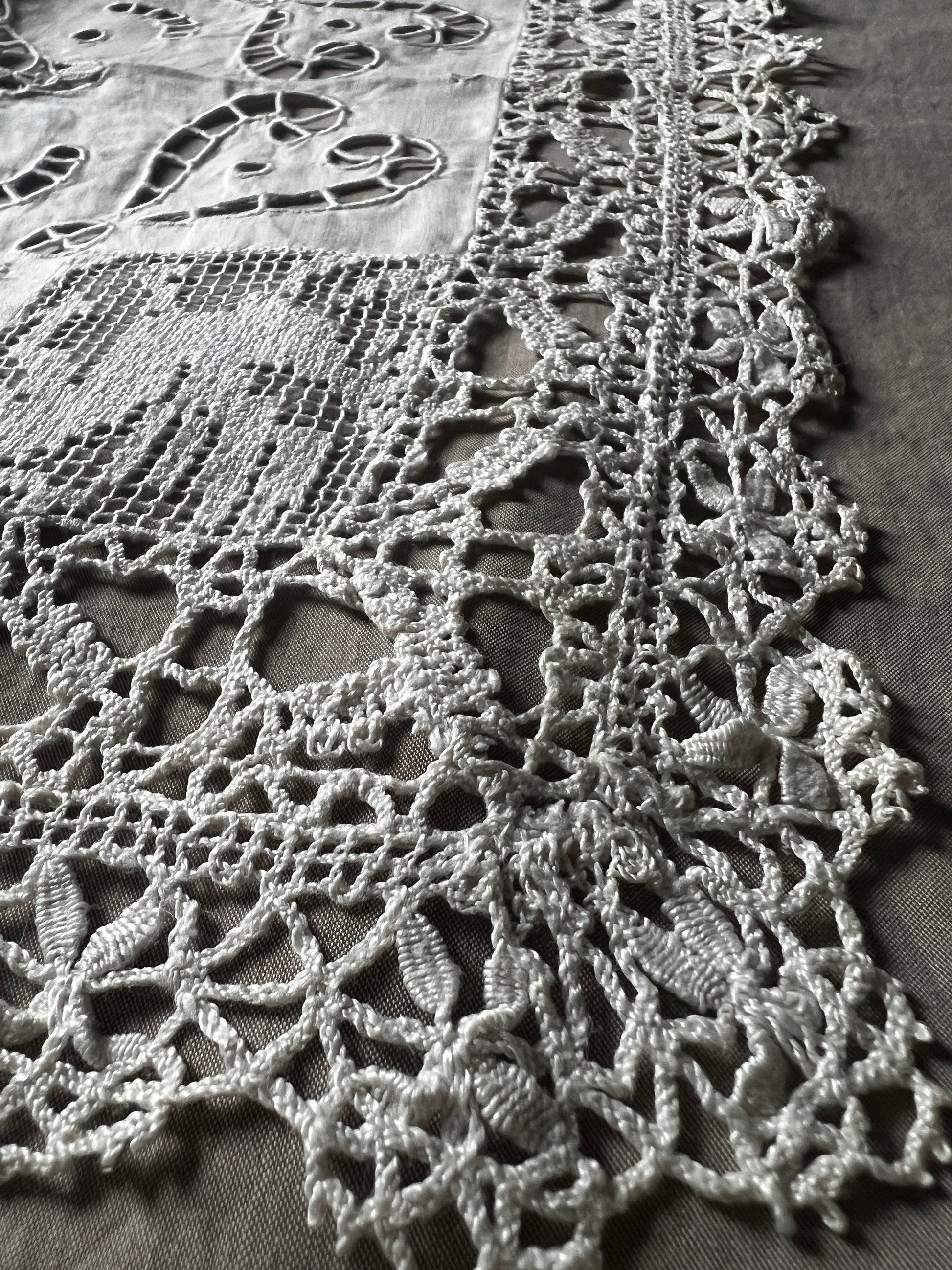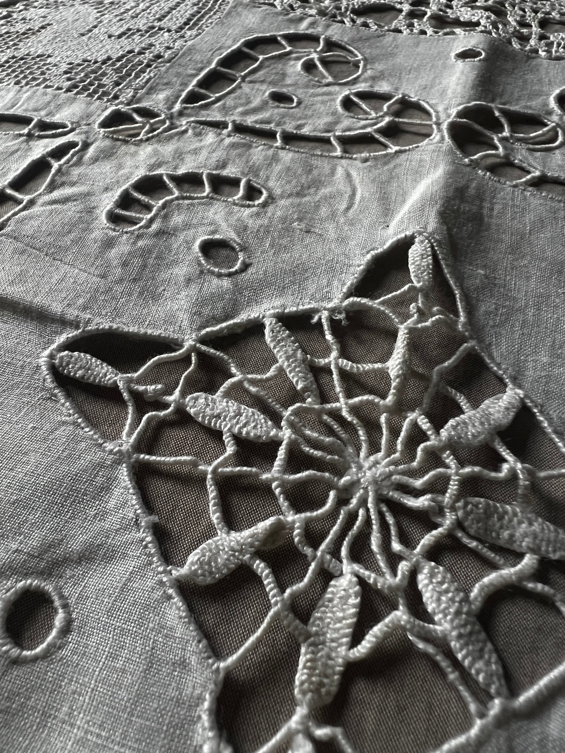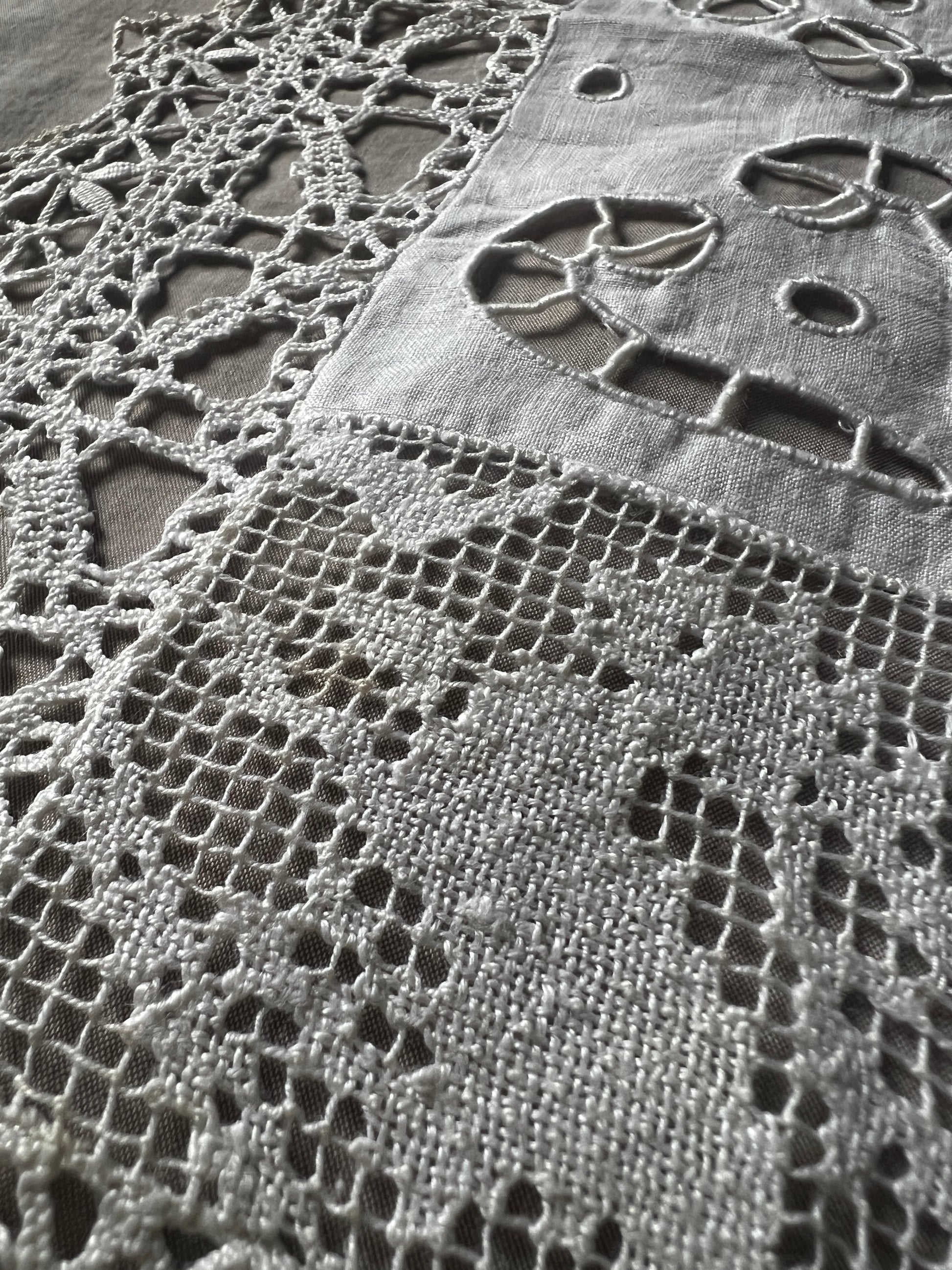 カットワーク刺繍を中心に、フィレレースやボビンレースの縁取りで丁寧に仕立てられたクロスです