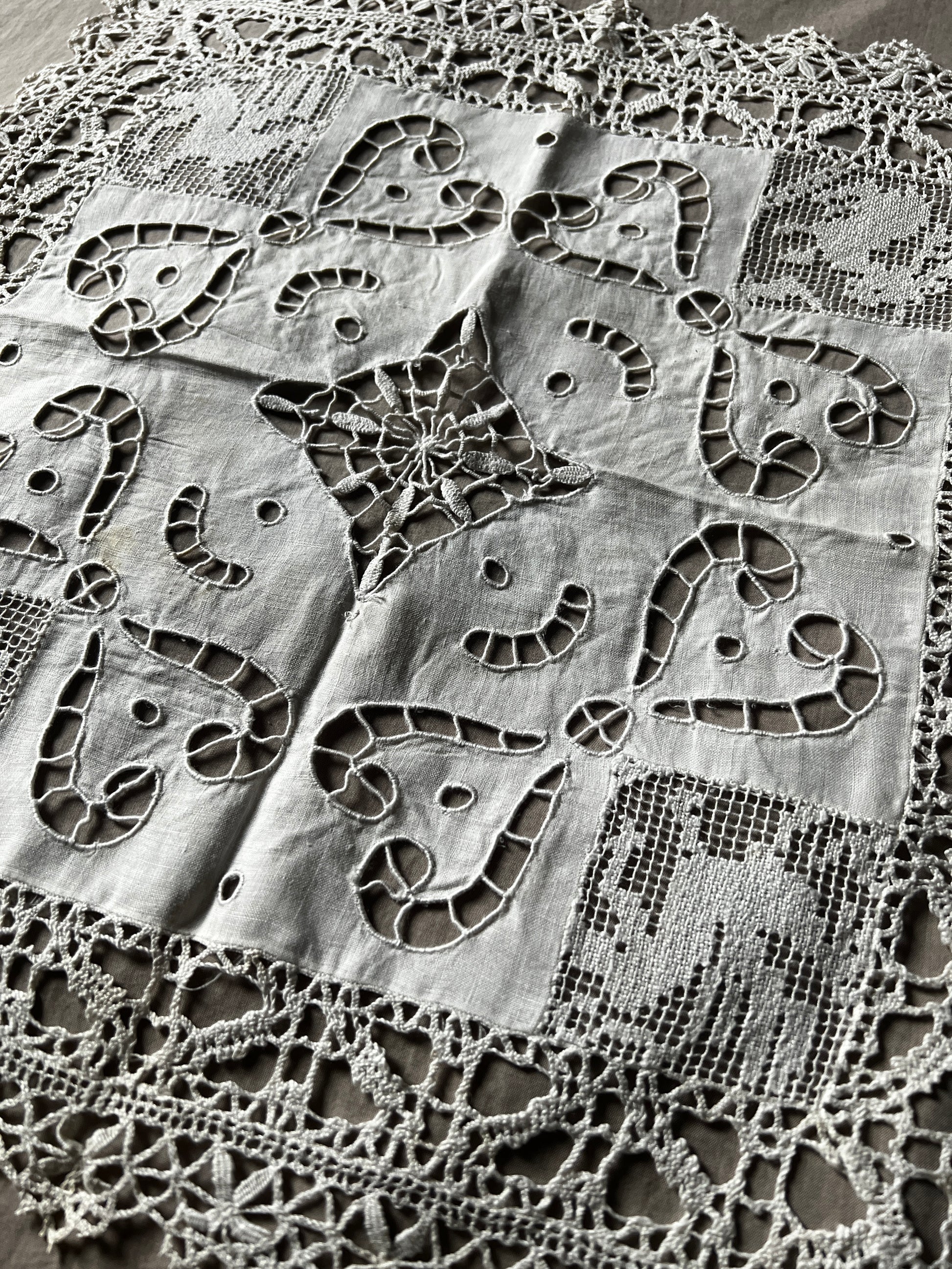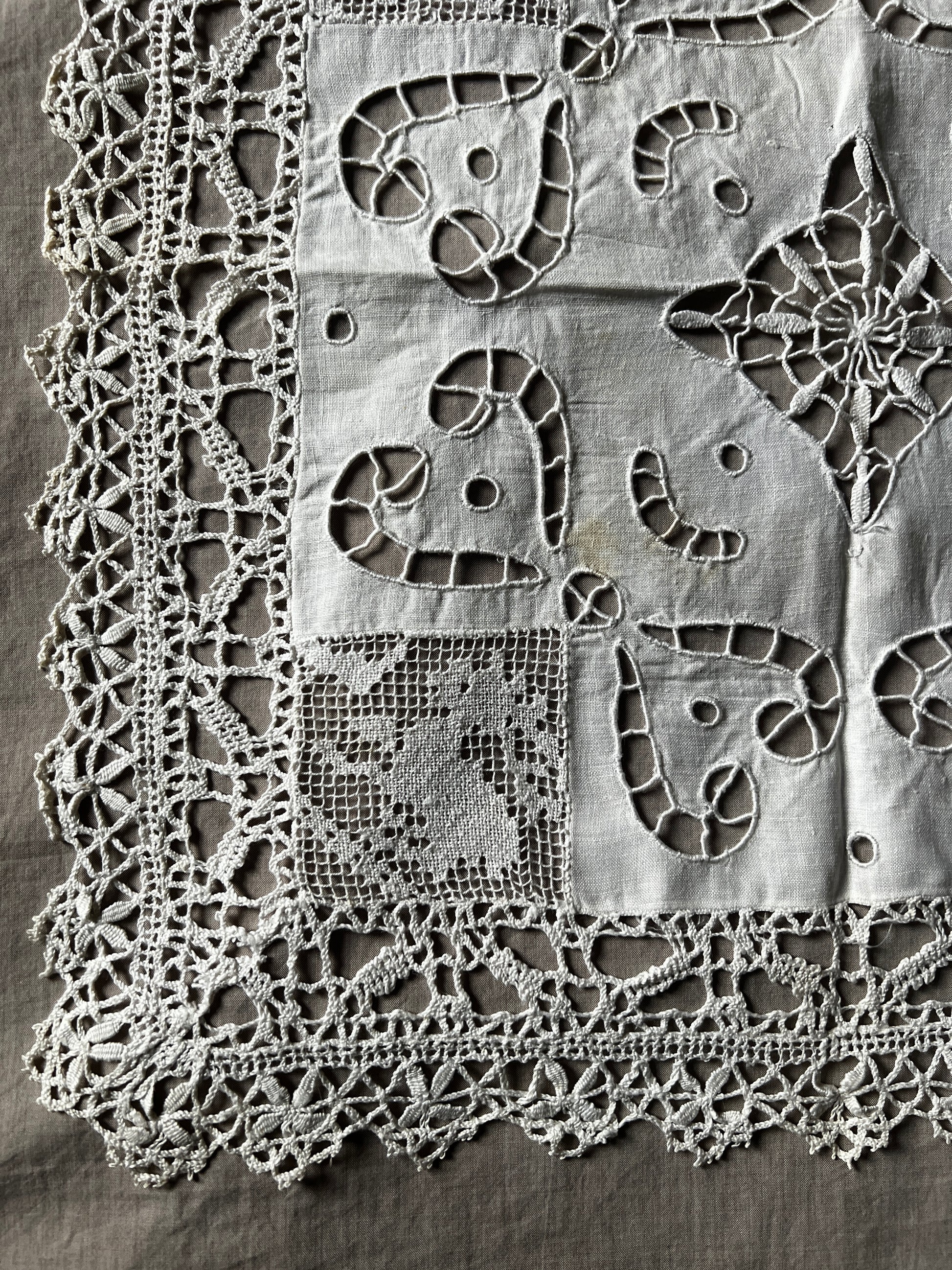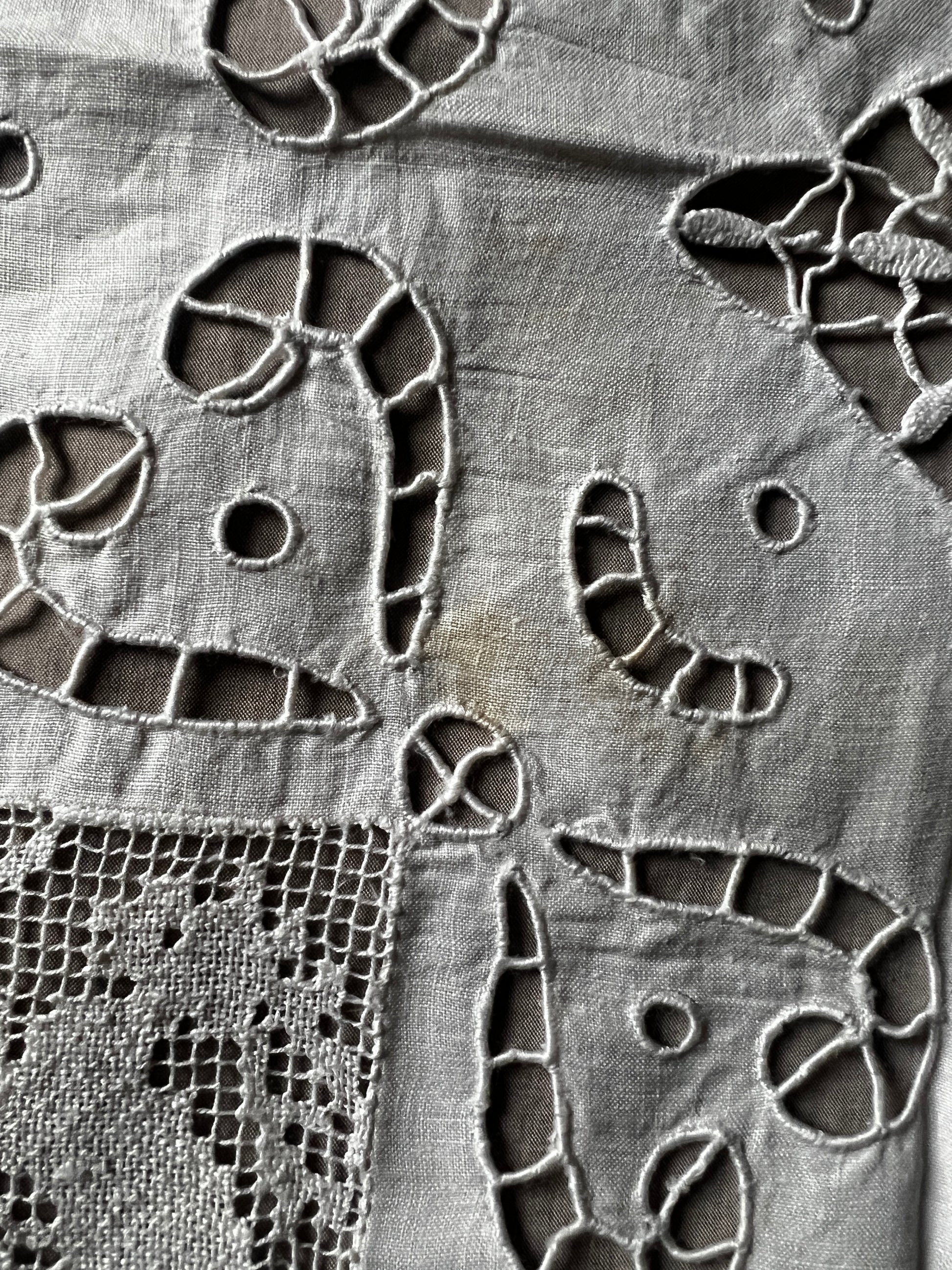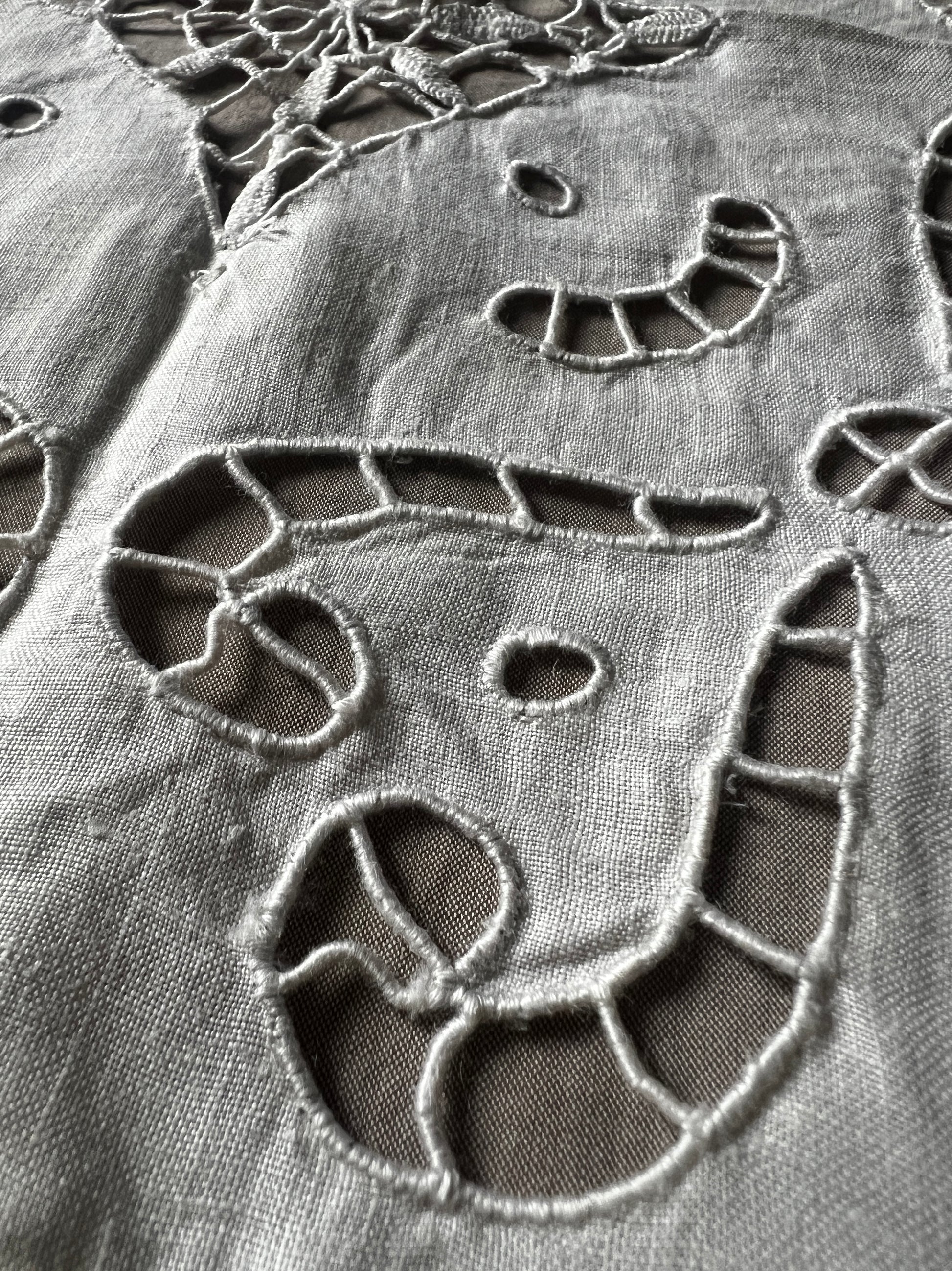 カットワーク刺繍を中心に、フィレレースやボビンレースの縁取りで丁寧に仕立てられたクロスです