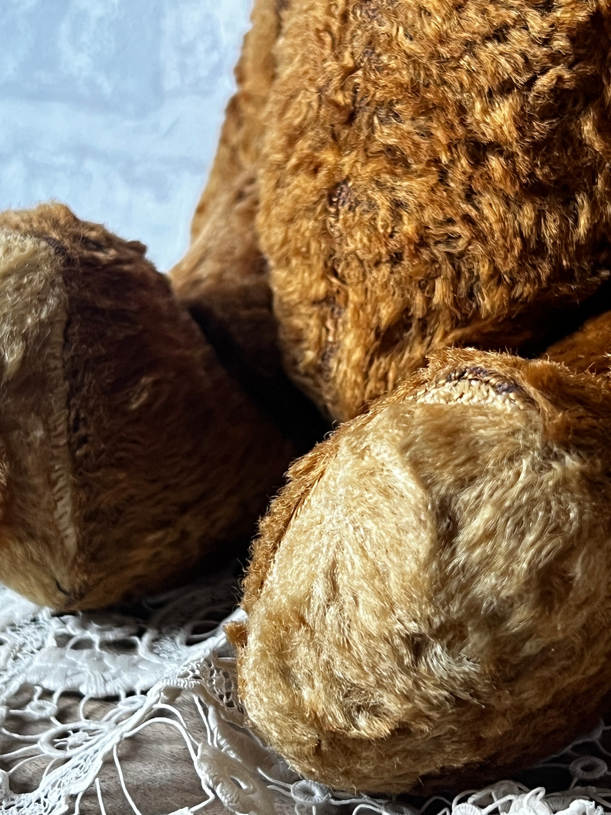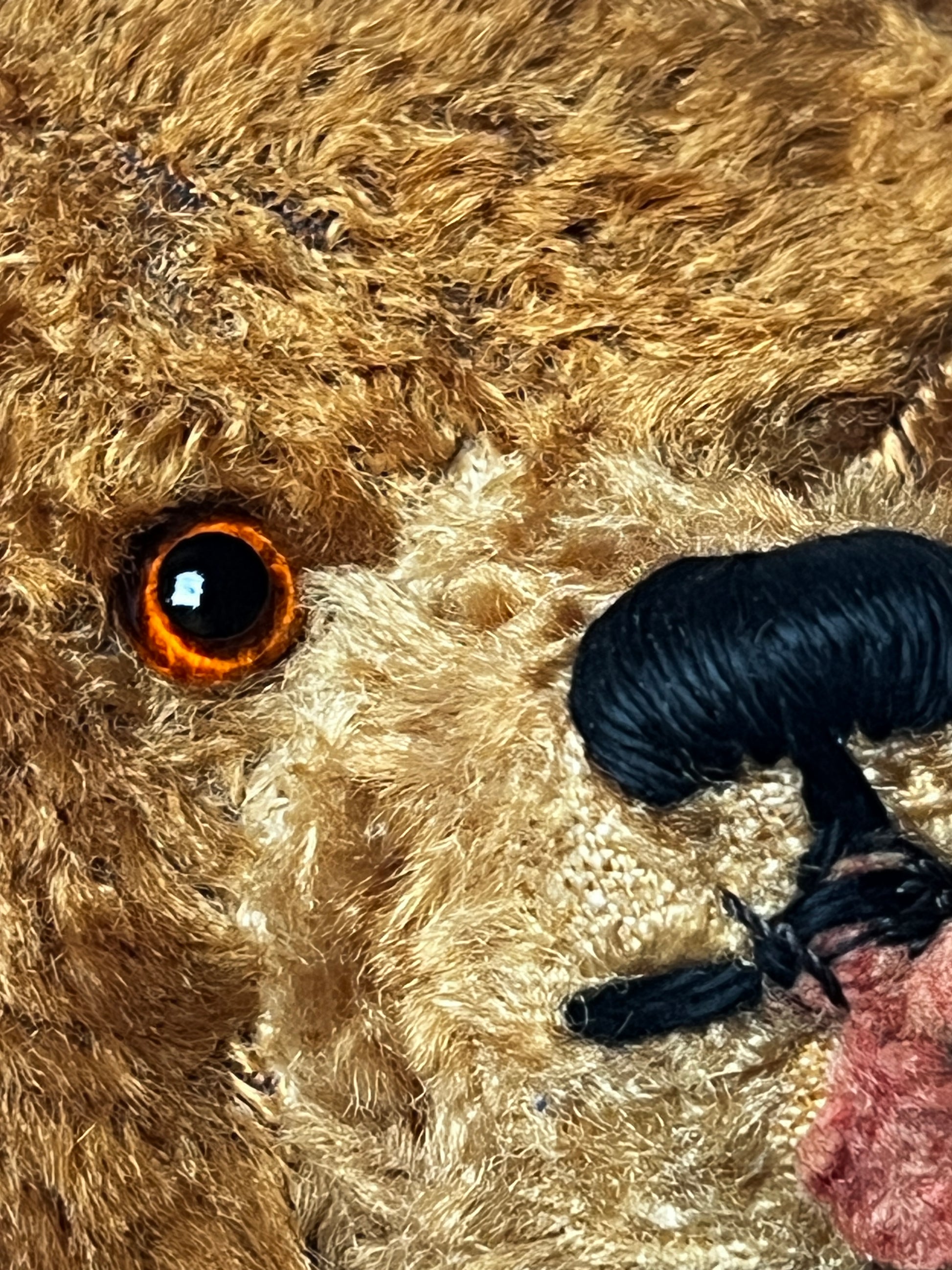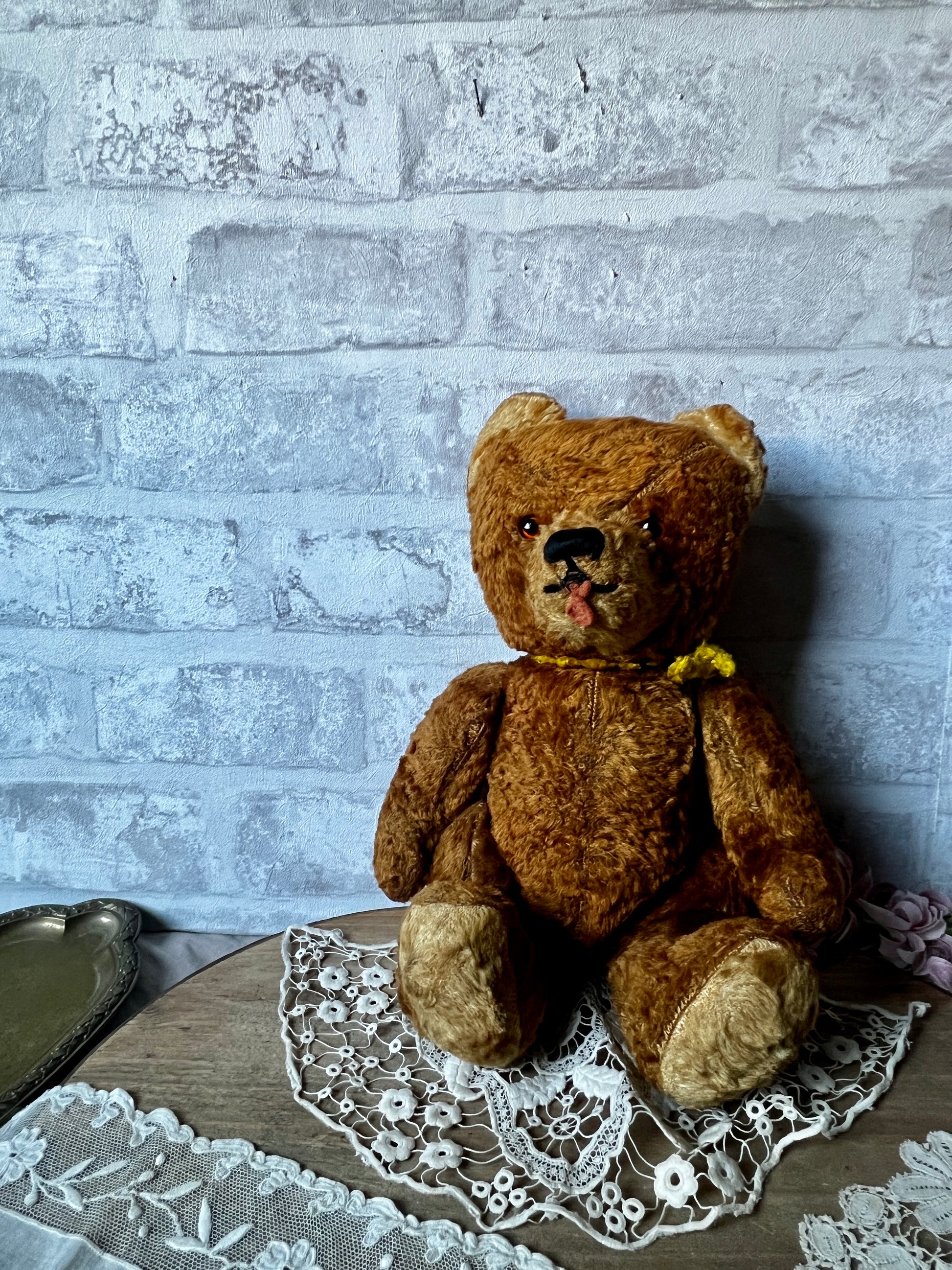 キャラメルカラーの毛並みが年月を経てやわらかく馴染み、古いながらも美しい風合いを残すヴィンテージのぬいぐるみです