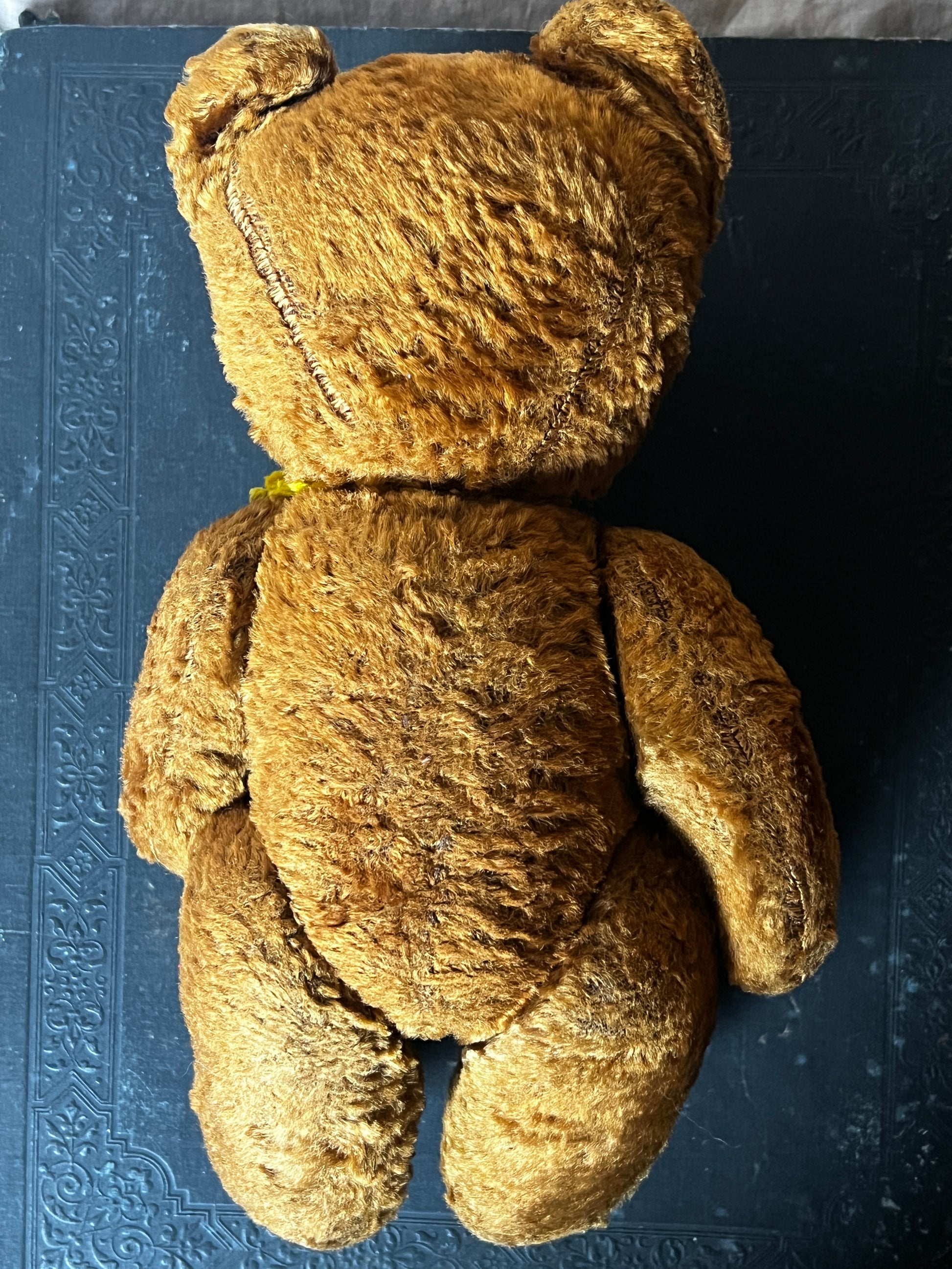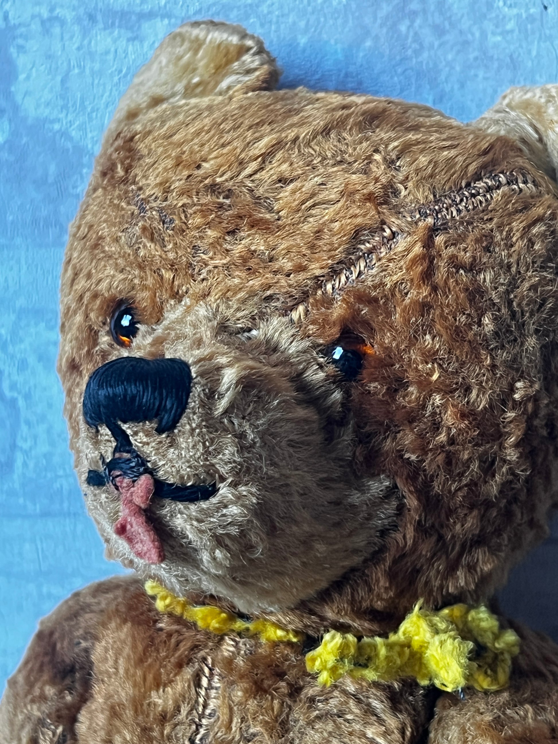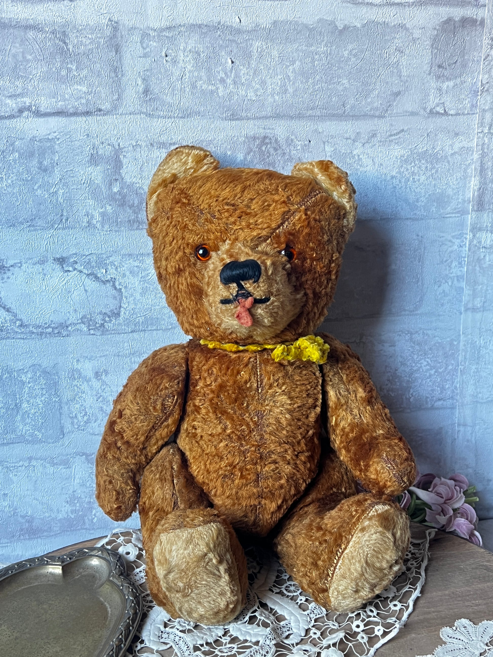 キャラメルカラーの毛並みが年月を経てやわらかく馴染み、古いながらも美しい風合いを残すヴィンテージのぬいぐるみです
