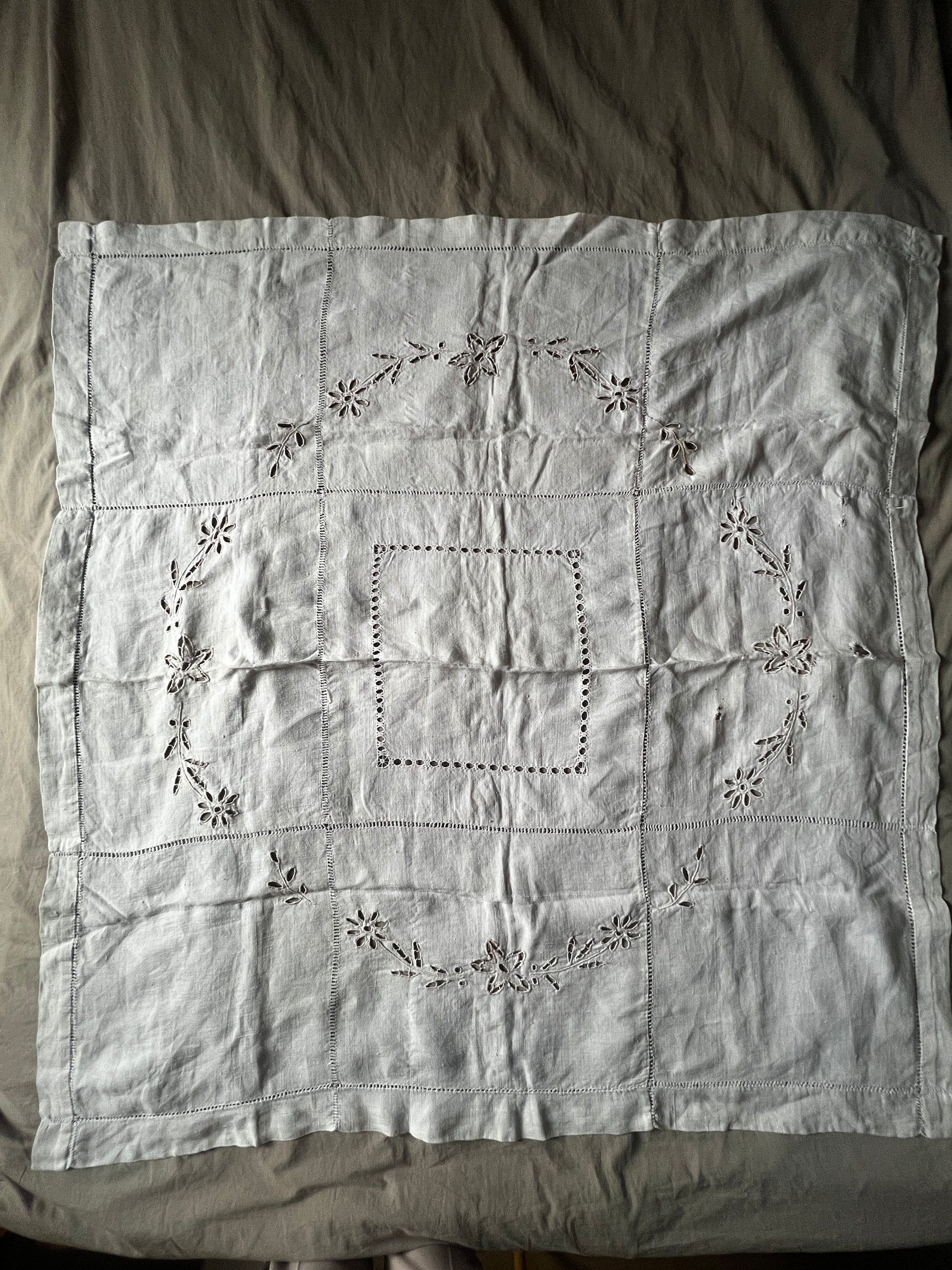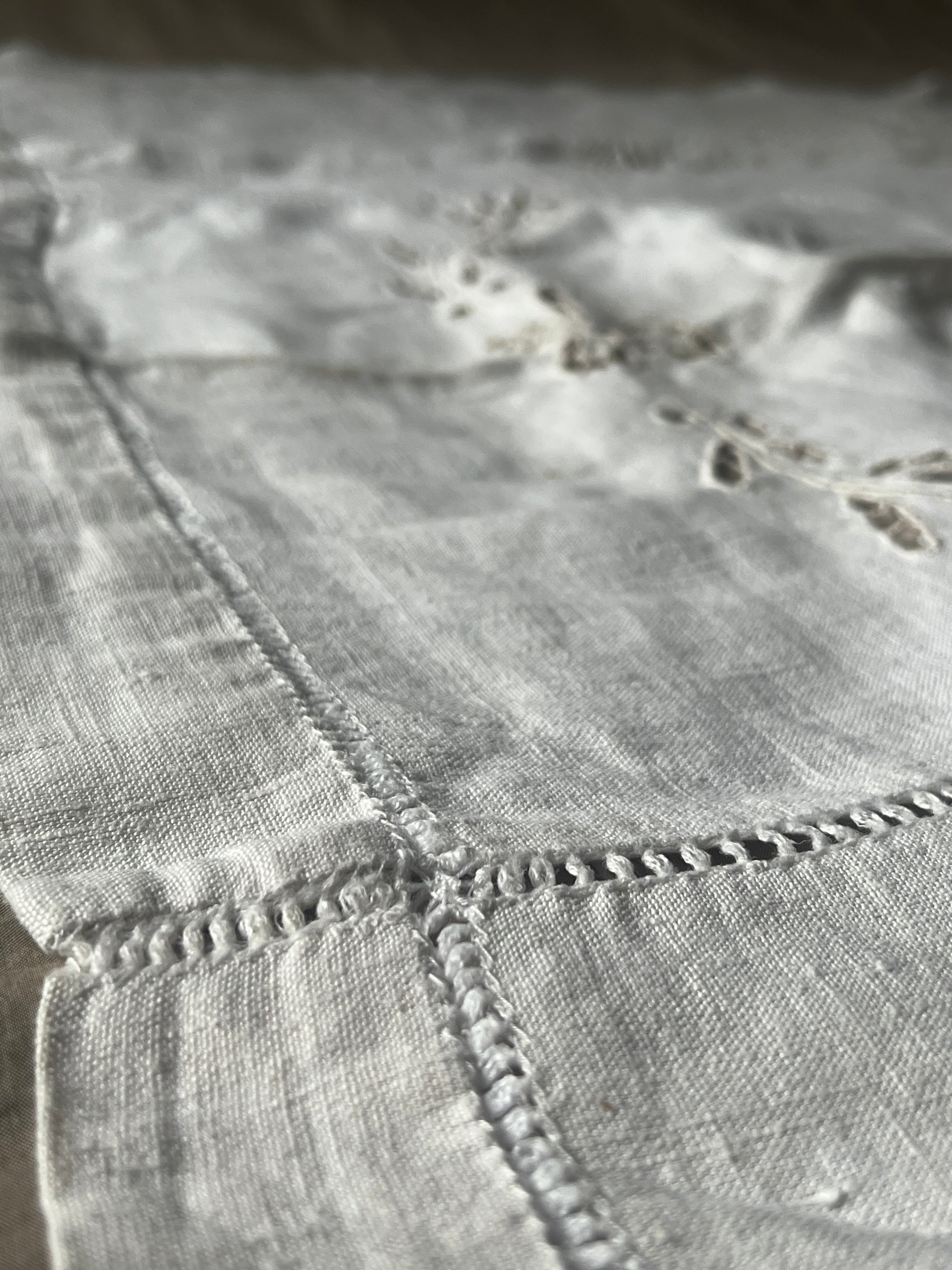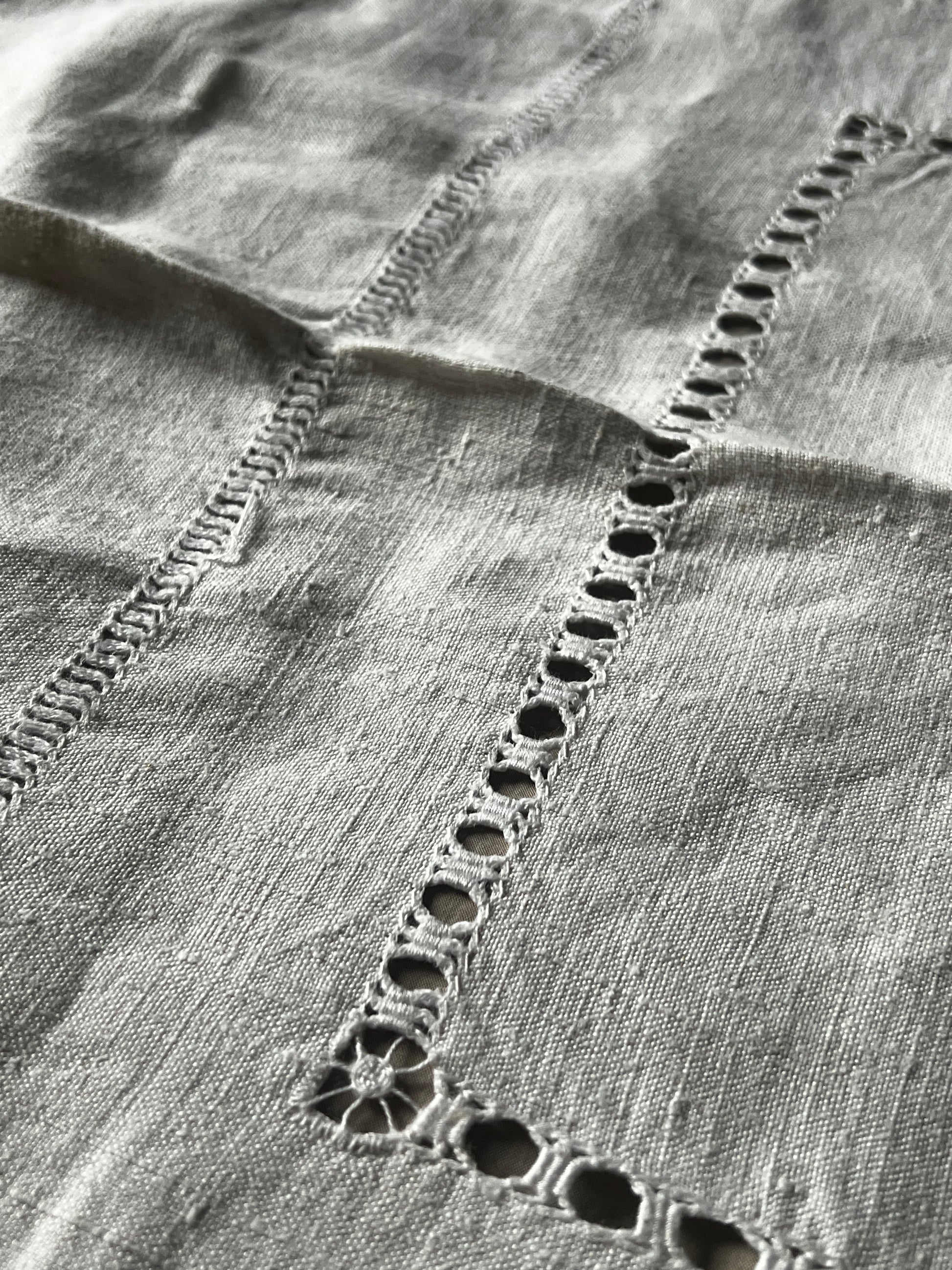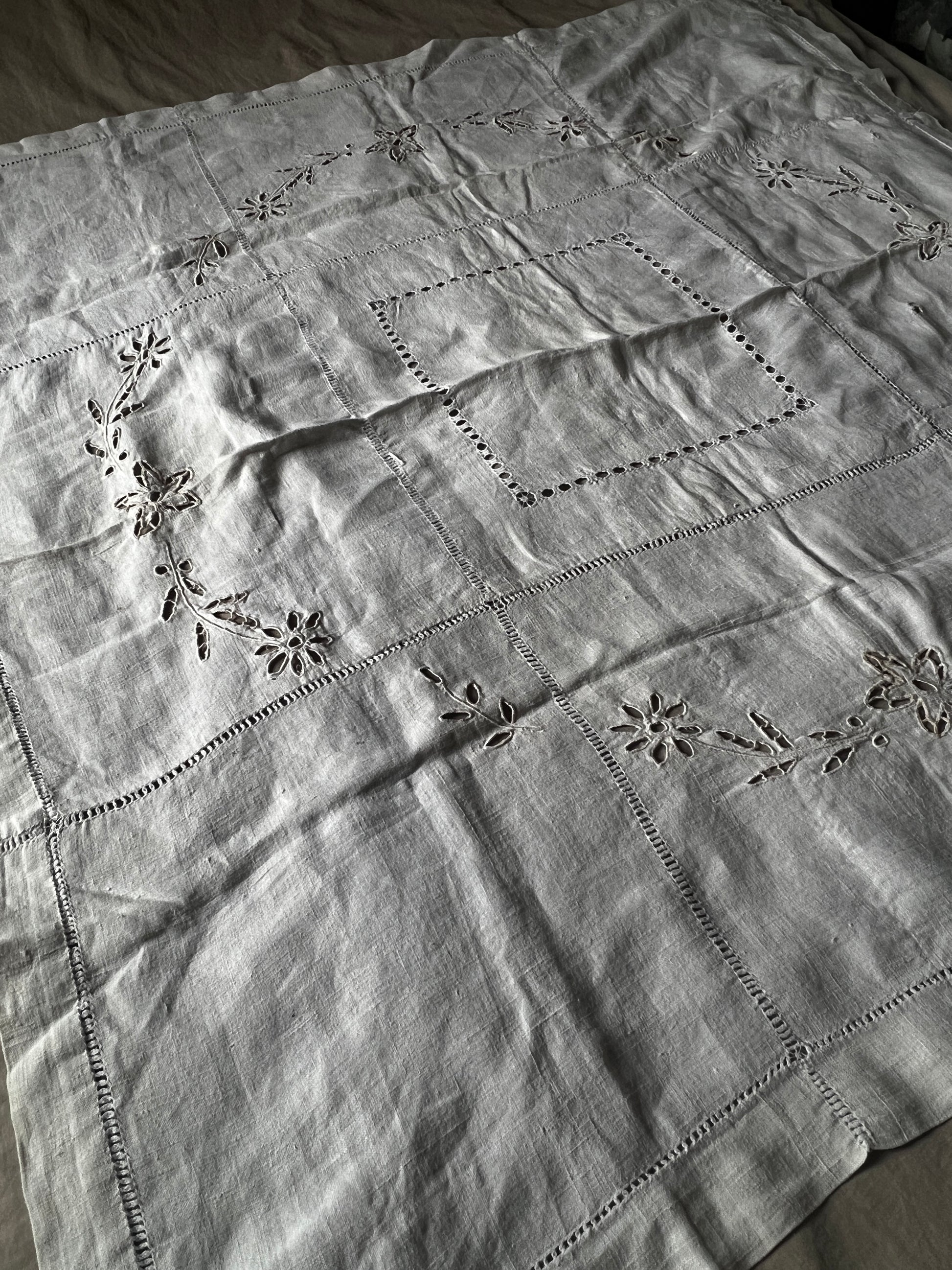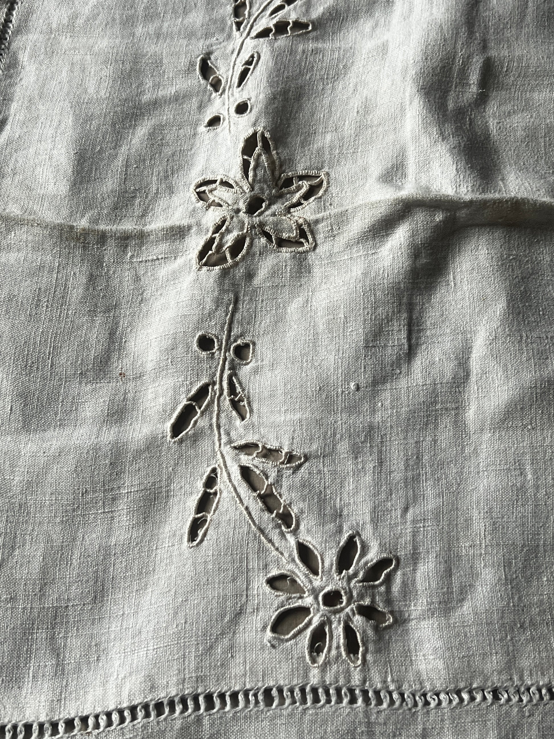 素朴で心地よい手触りのリネンクロスに、カットワーク刺繍とドロンワークが丁寧に施された一枚です