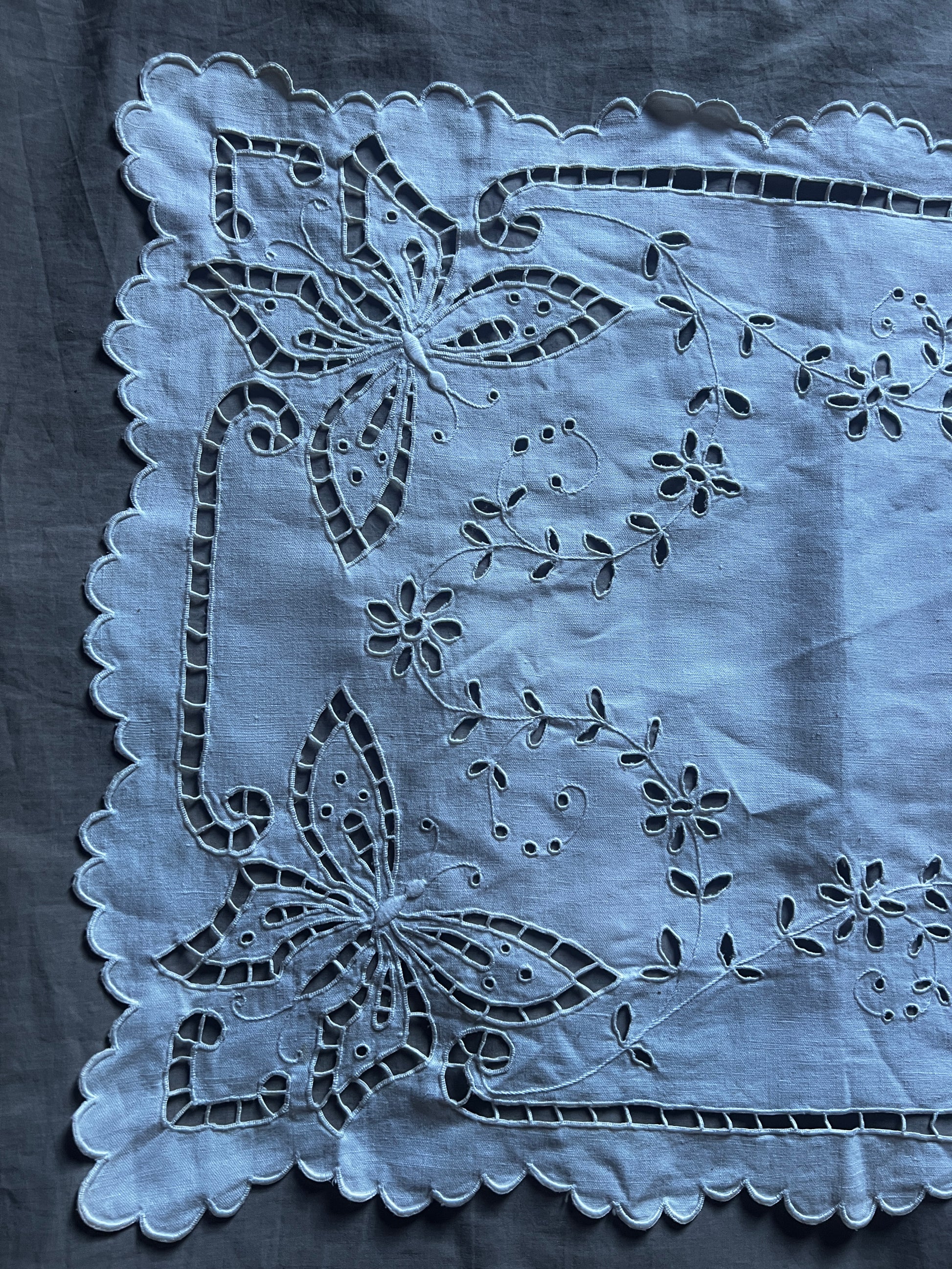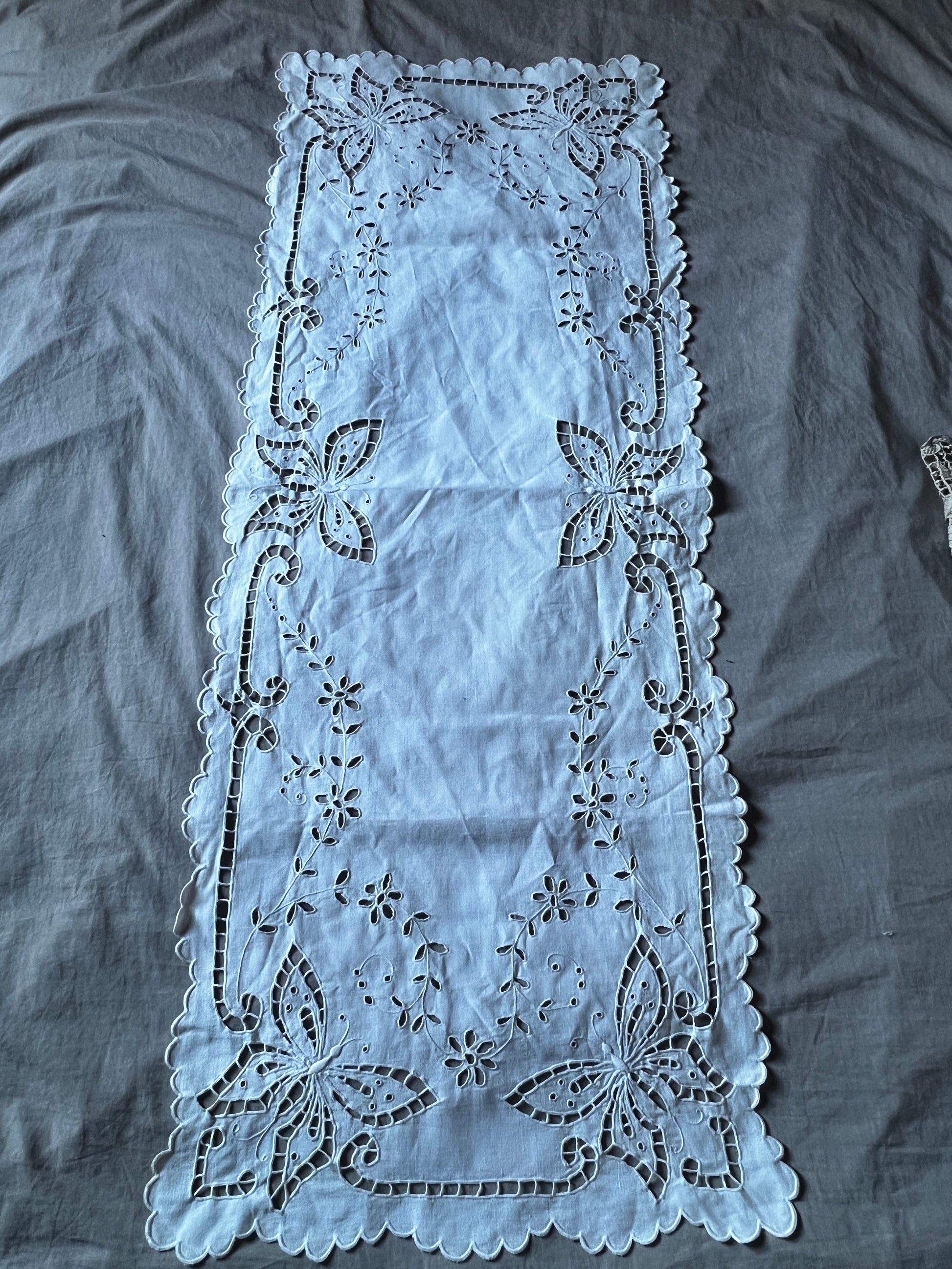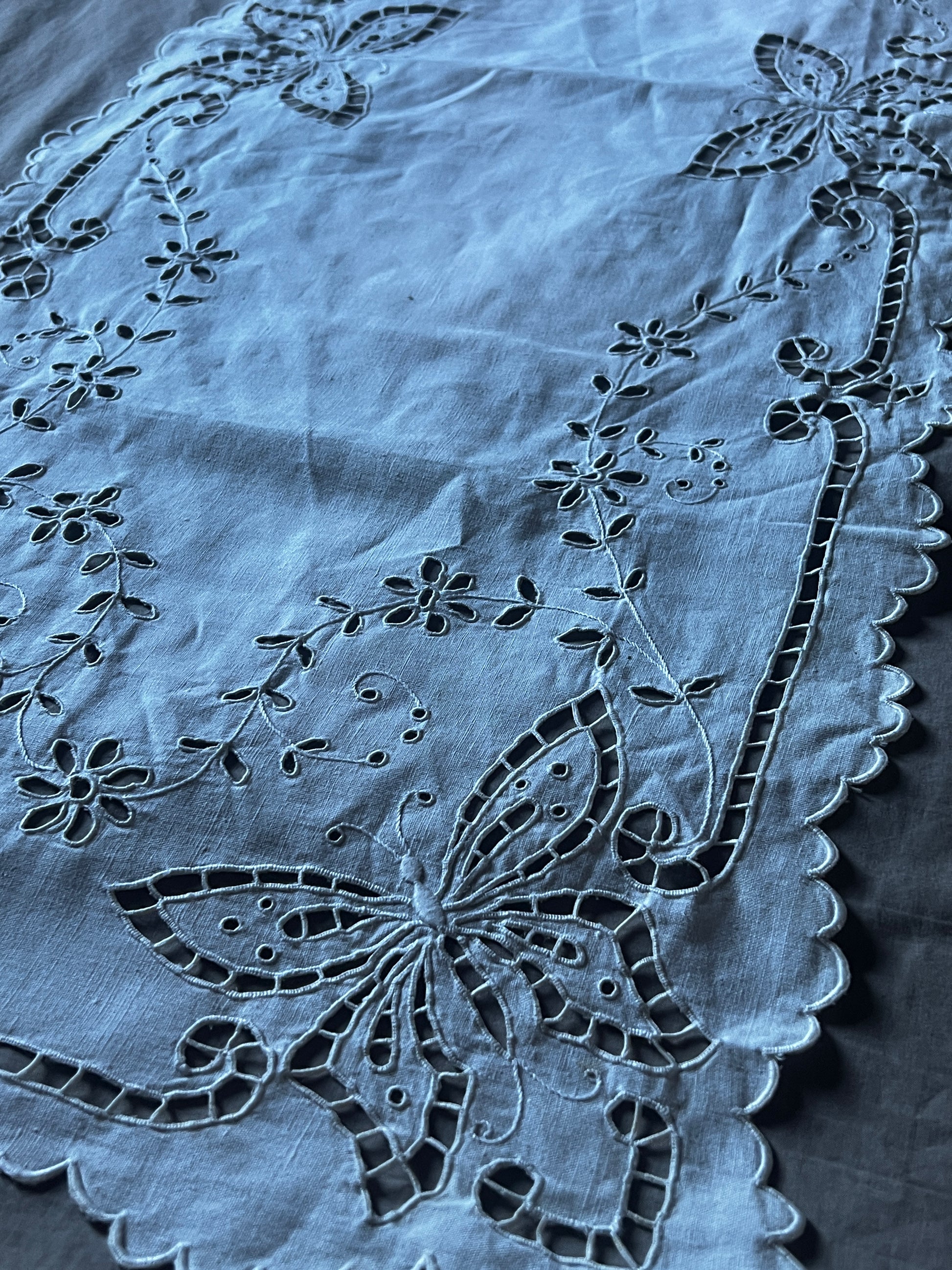 蝶のモチーフがカットワーク刺繍で丁寧に表現された長方形のクロスです