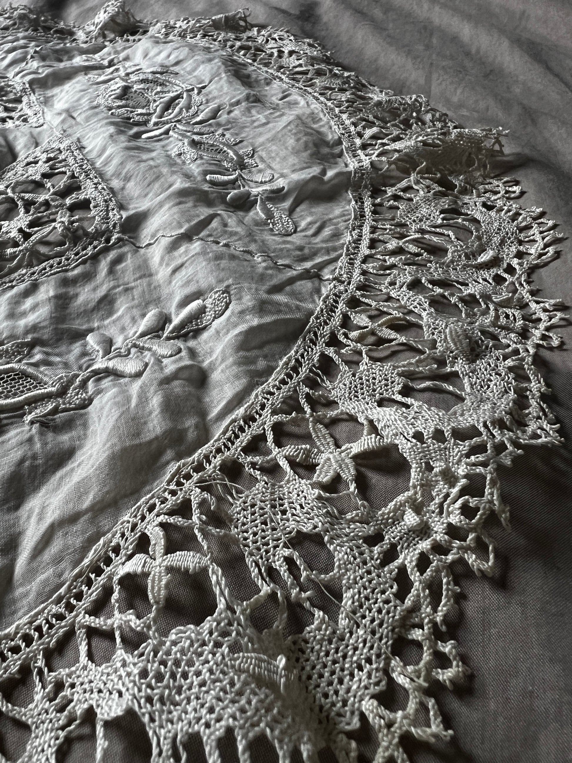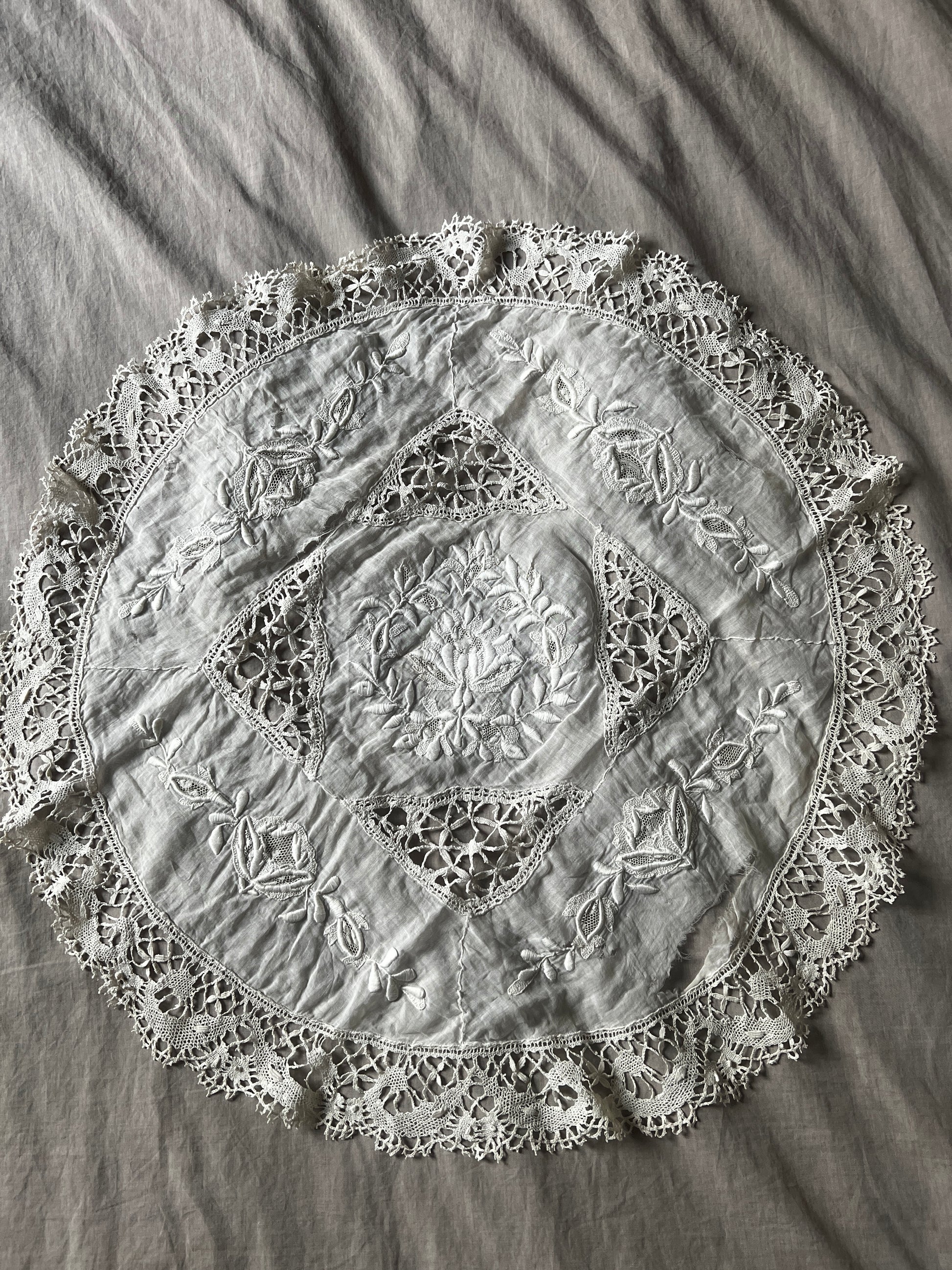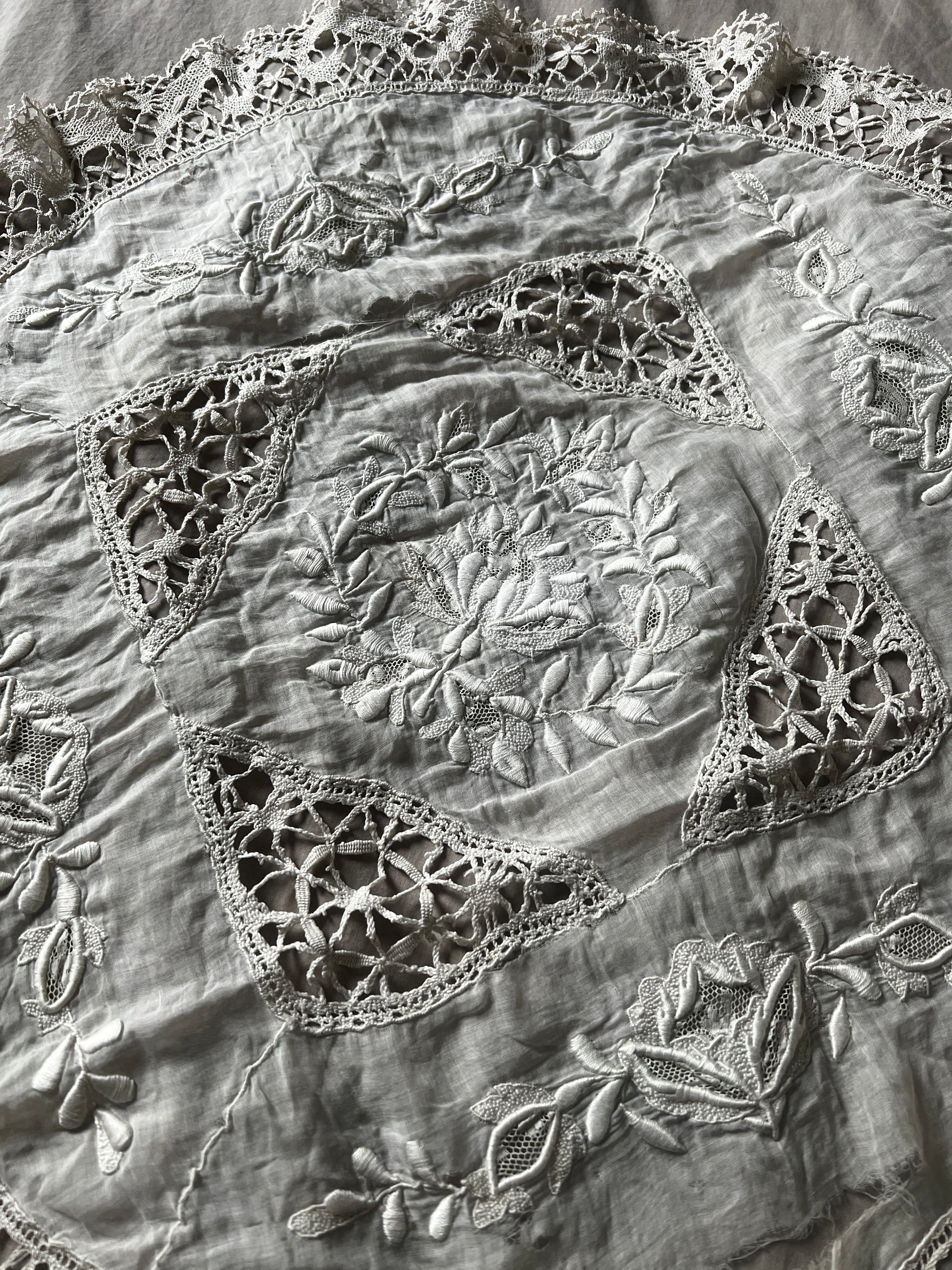 薄く柔らかなコットンローン地に、ボリュームのあるステッチで施された白刺繍とボビンレースが組み合わされた、優雅な円形クロスです