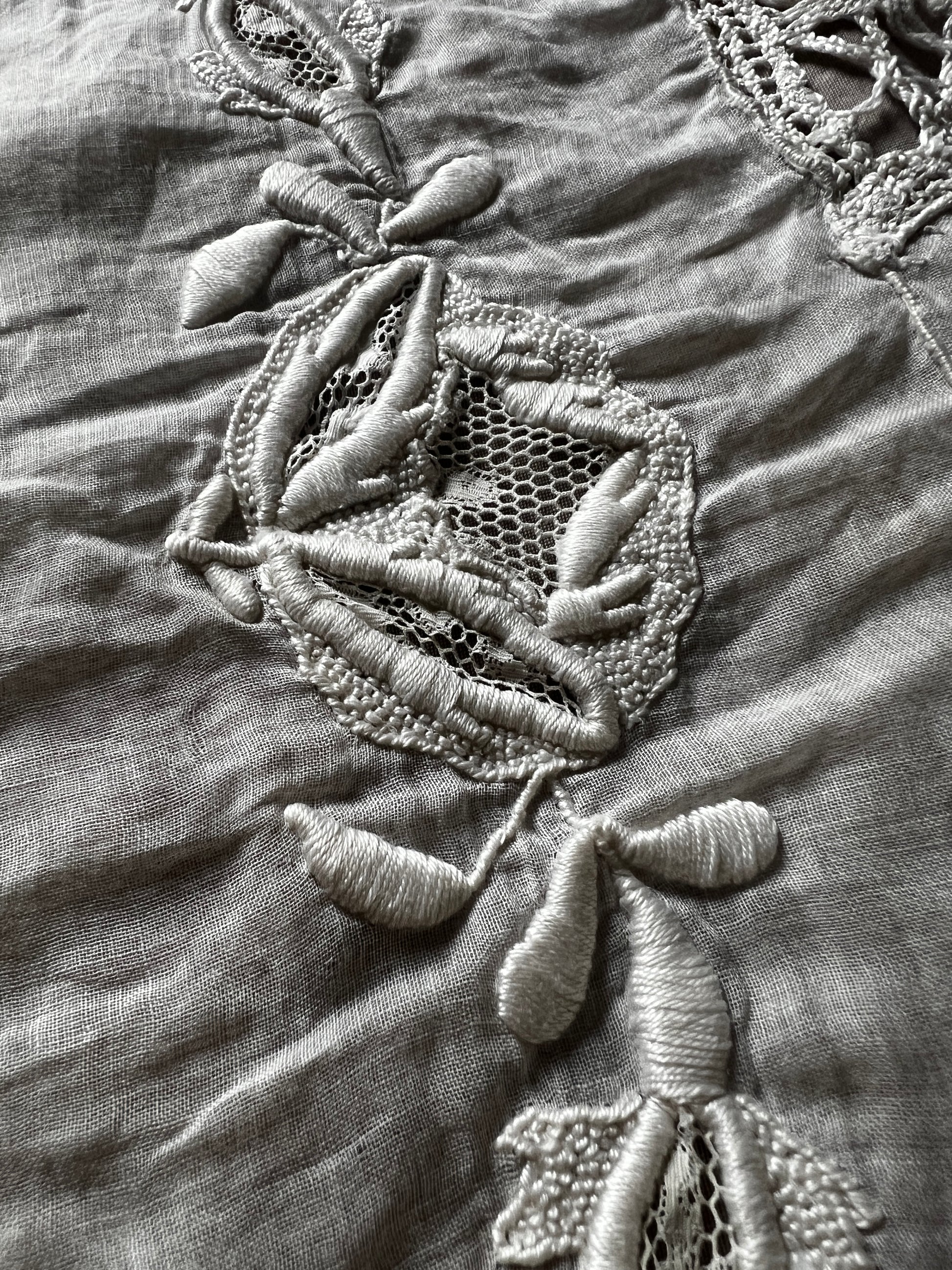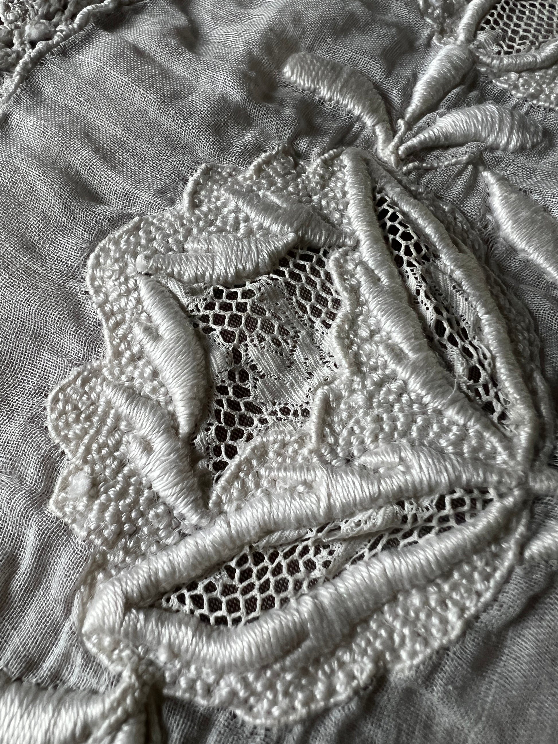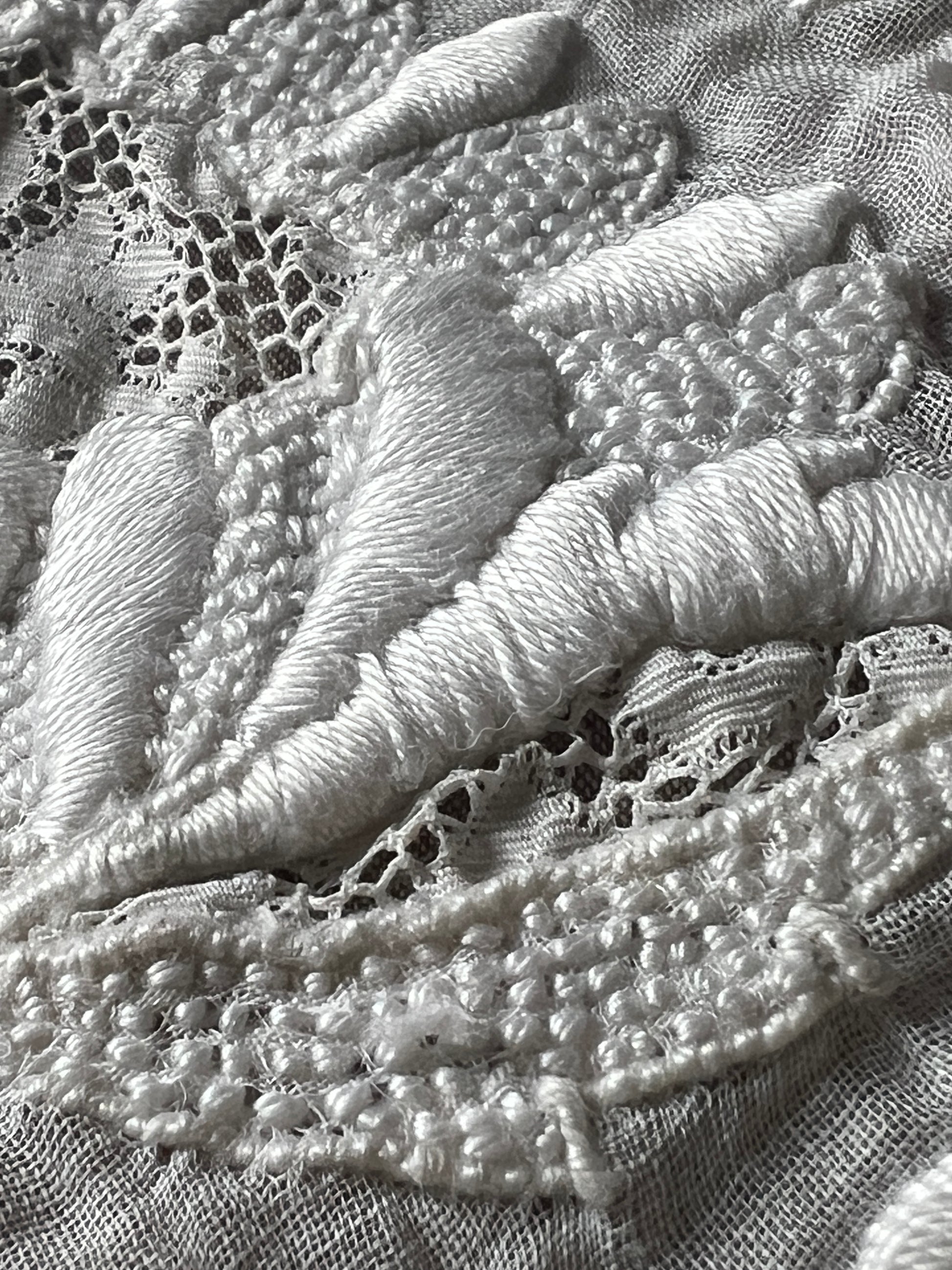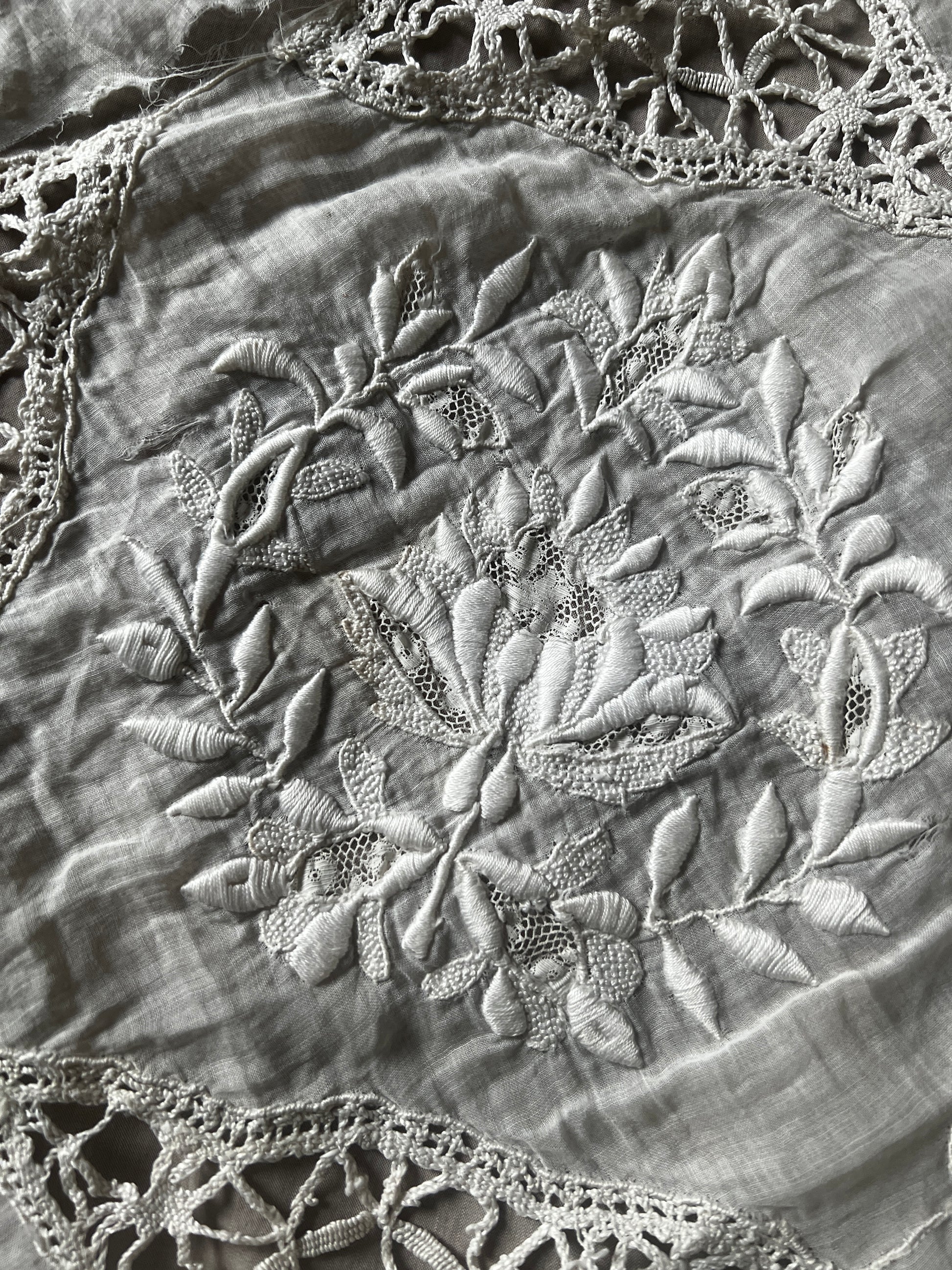 薄く柔らかなコットンローン地に、ボリュームのあるステッチで施された白刺繍とボビンレースが組み合わされた、優雅な円形クロスです
