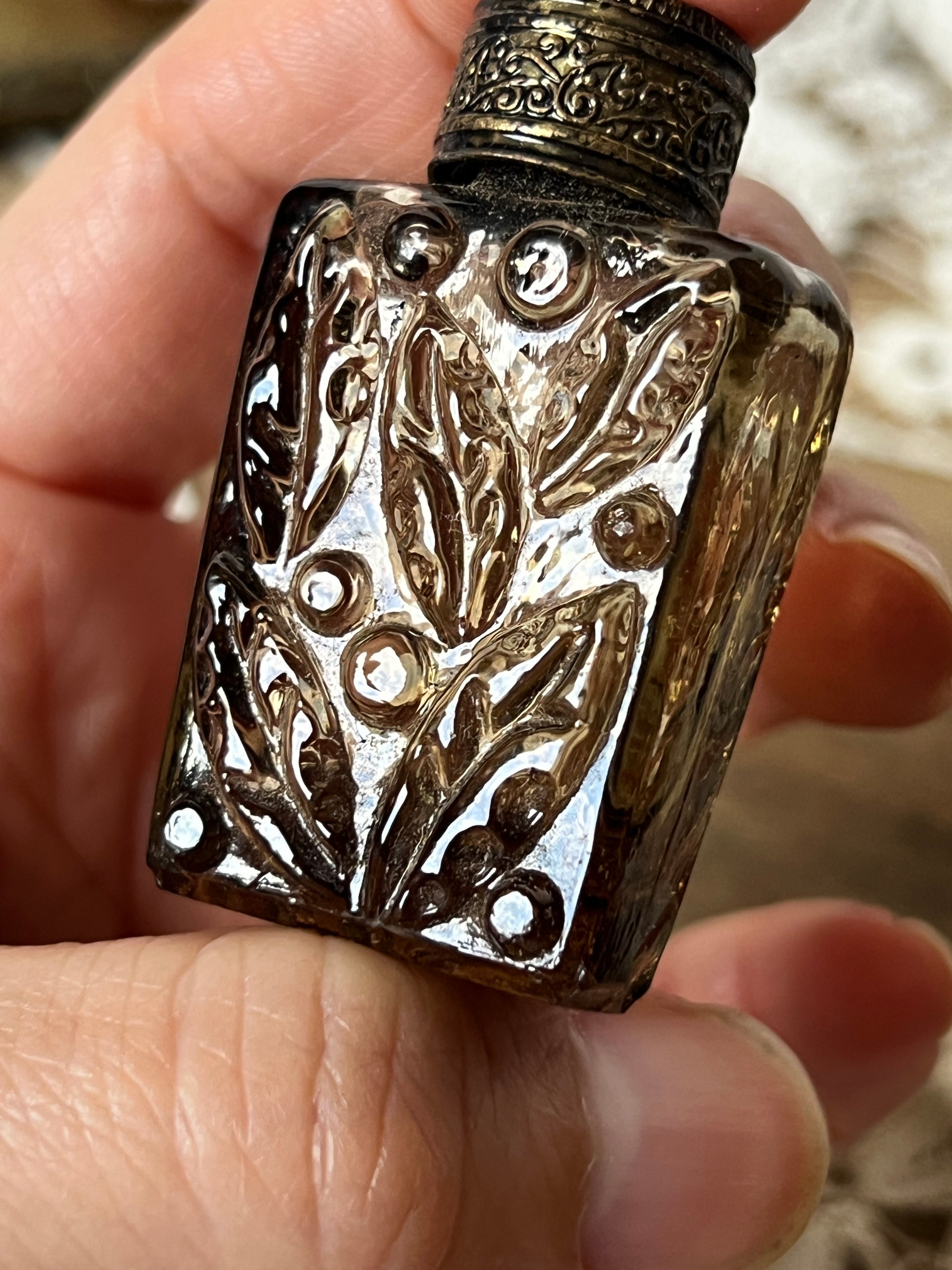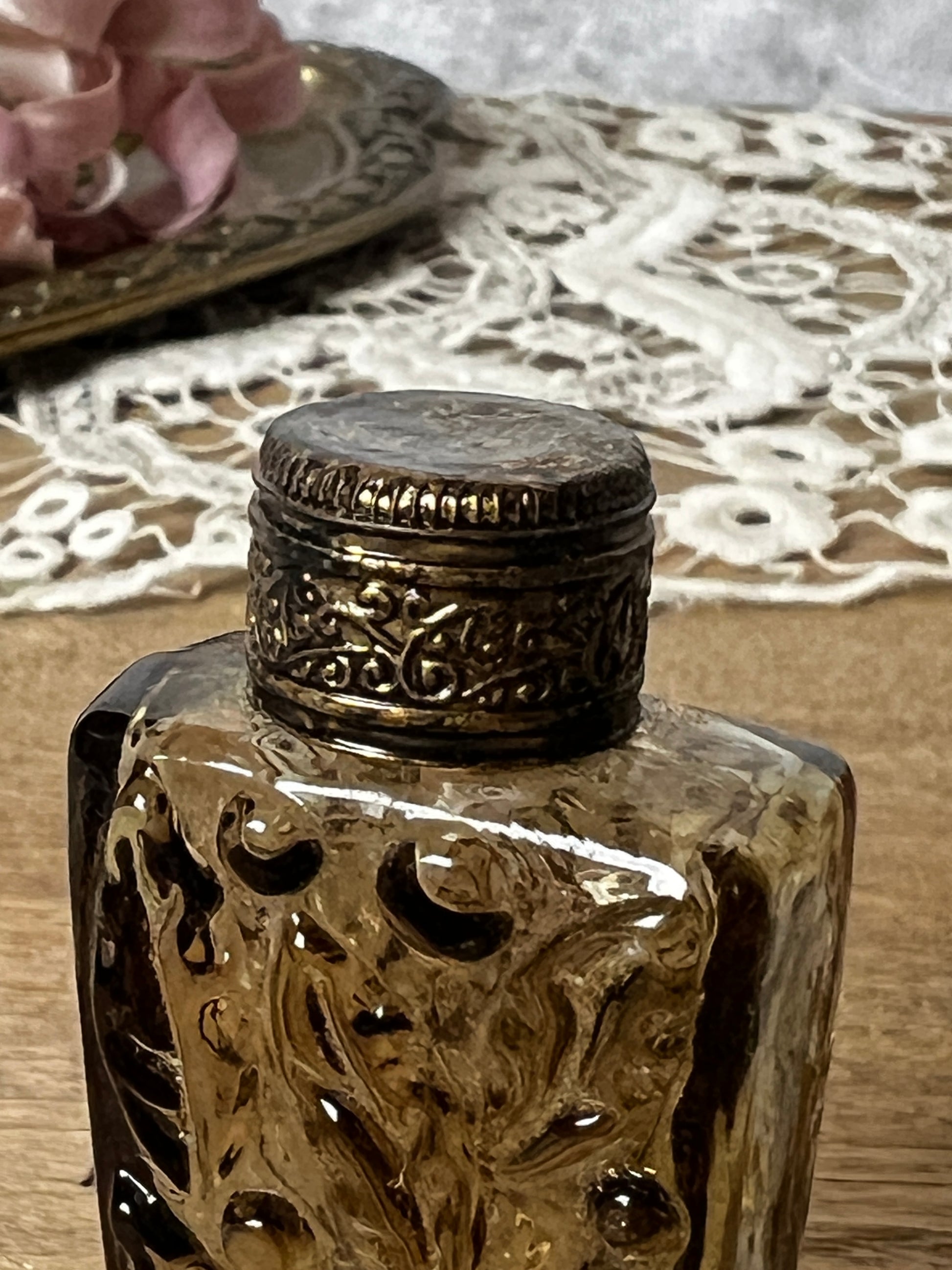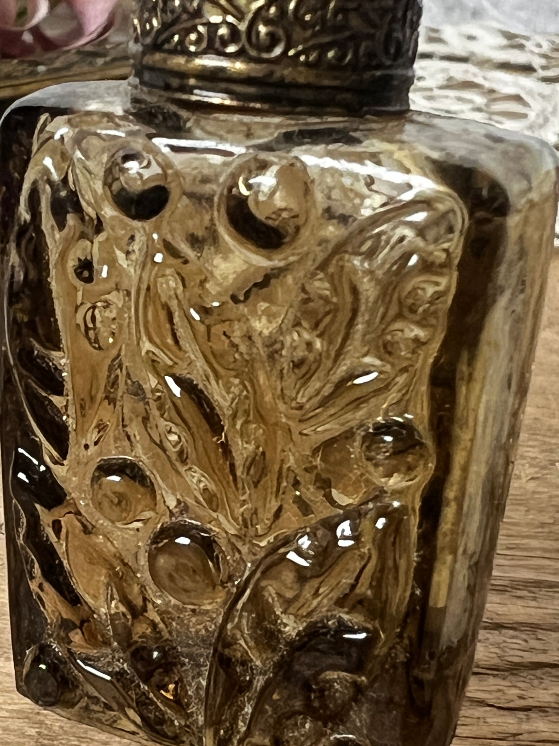 アンバーカラーのガラス表面全体に施された細工模様が美しく蓋の装飾も印象的