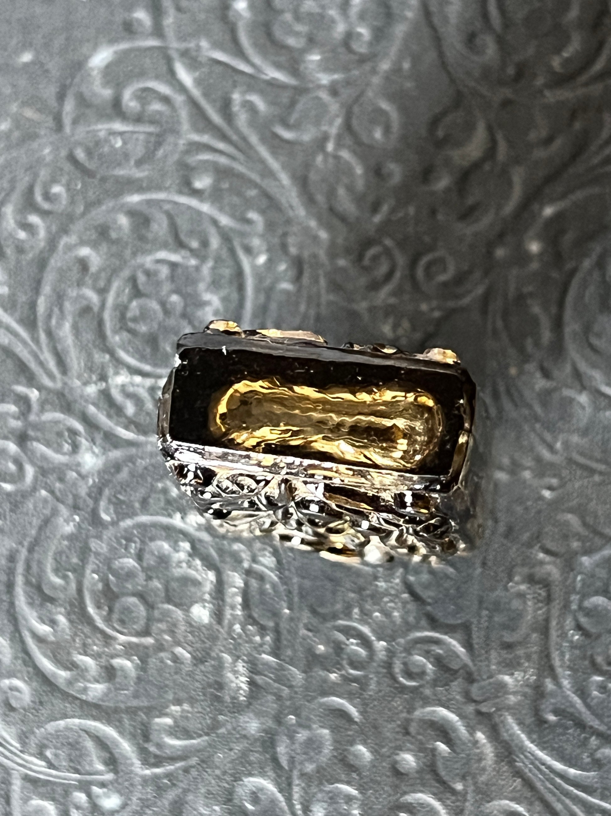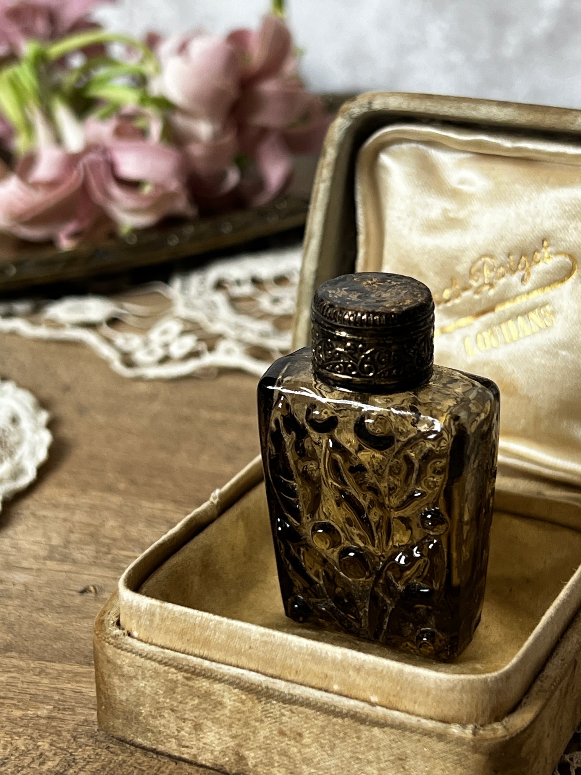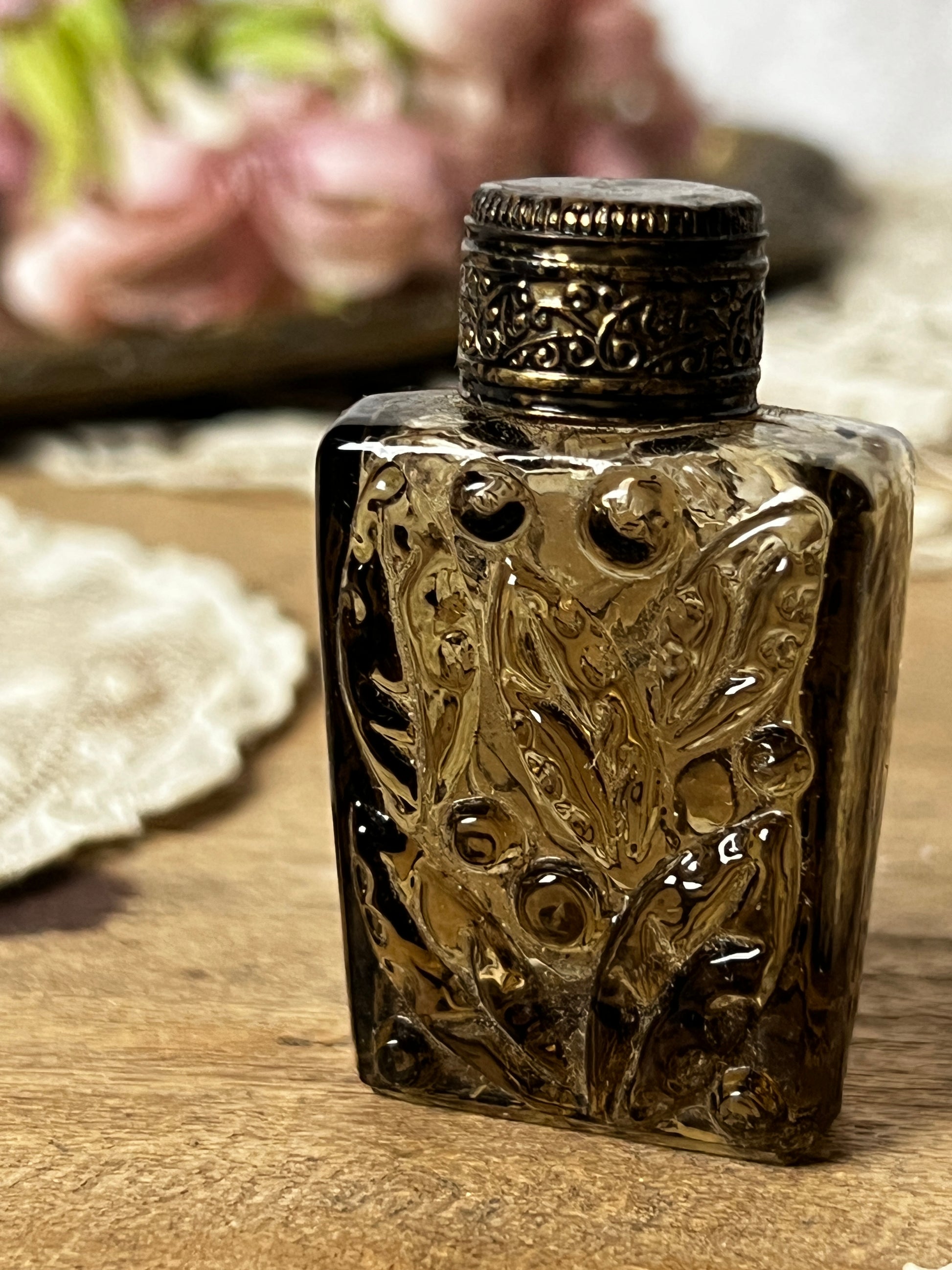 アンバーカラーのガラス表面全体に施された細工模様が美しく蓋の装飾も印象的