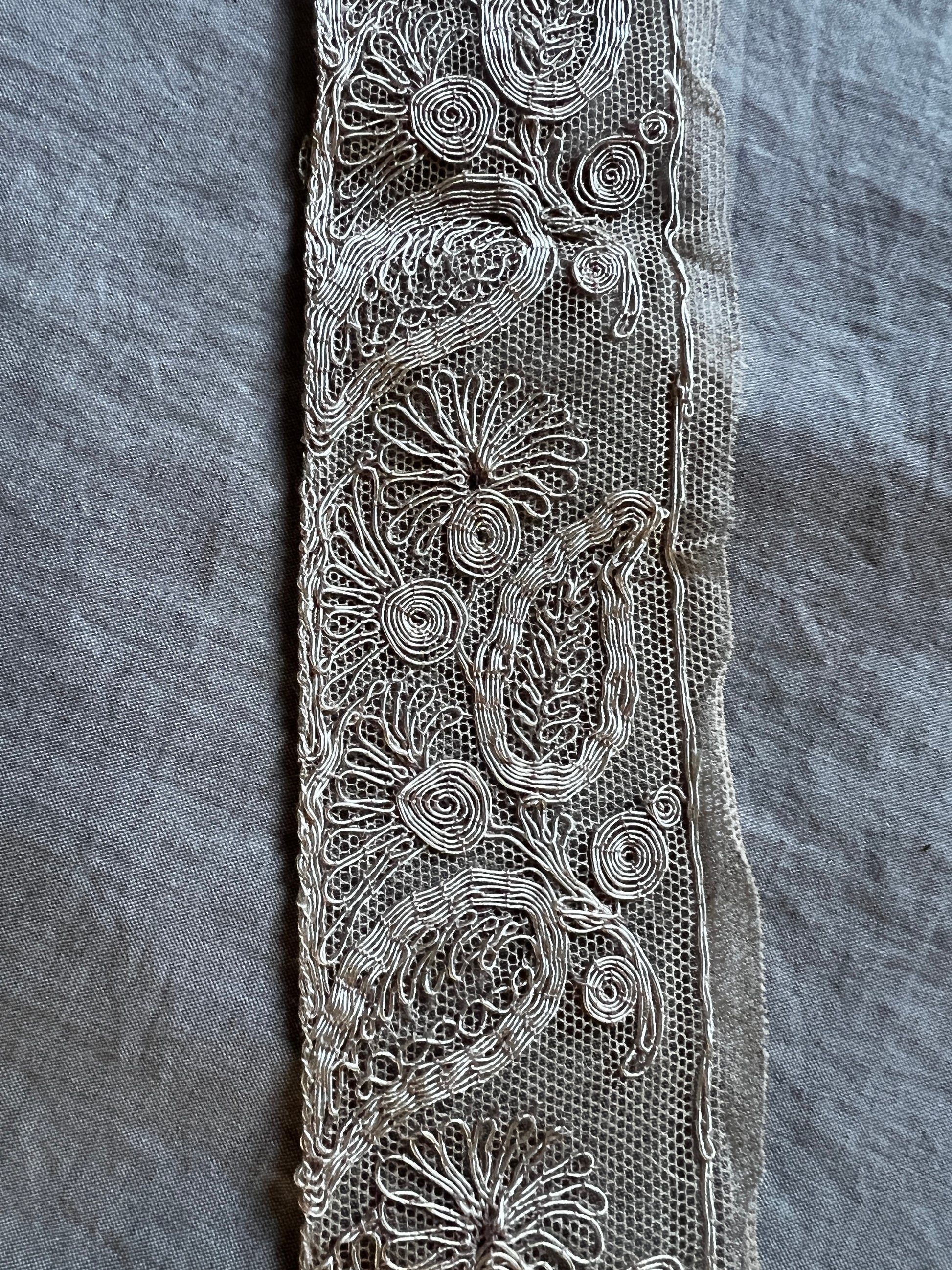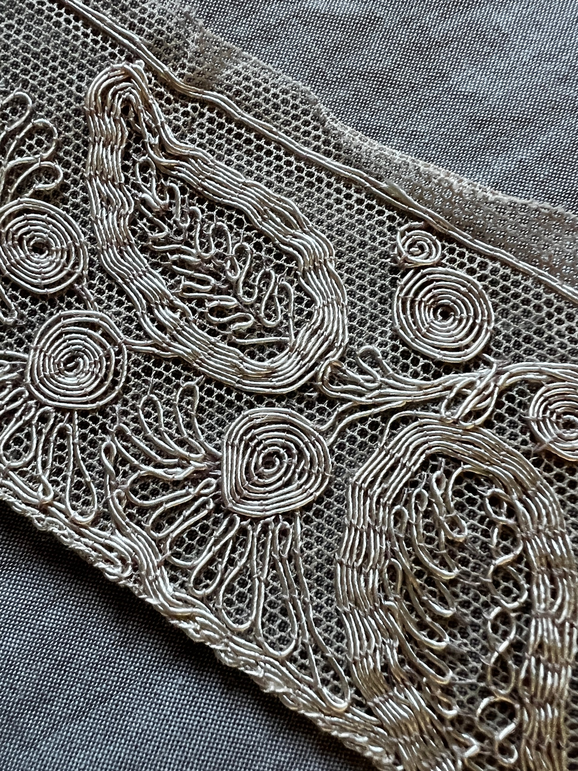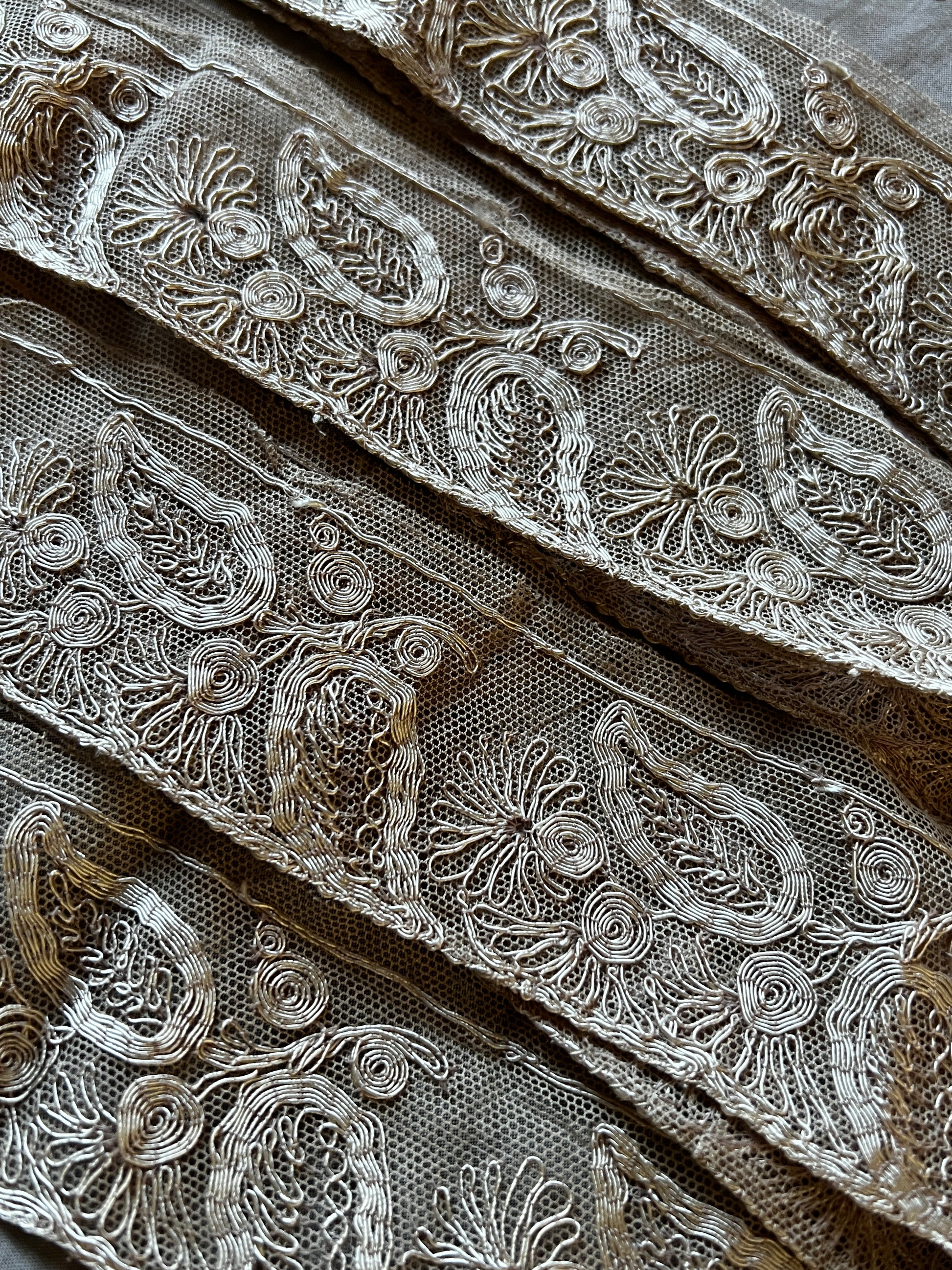 ほんのりとカフェオレ色に染まったチュール地に、やや光沢を帯びた糸で繊細な刺繍が施されたレースです
