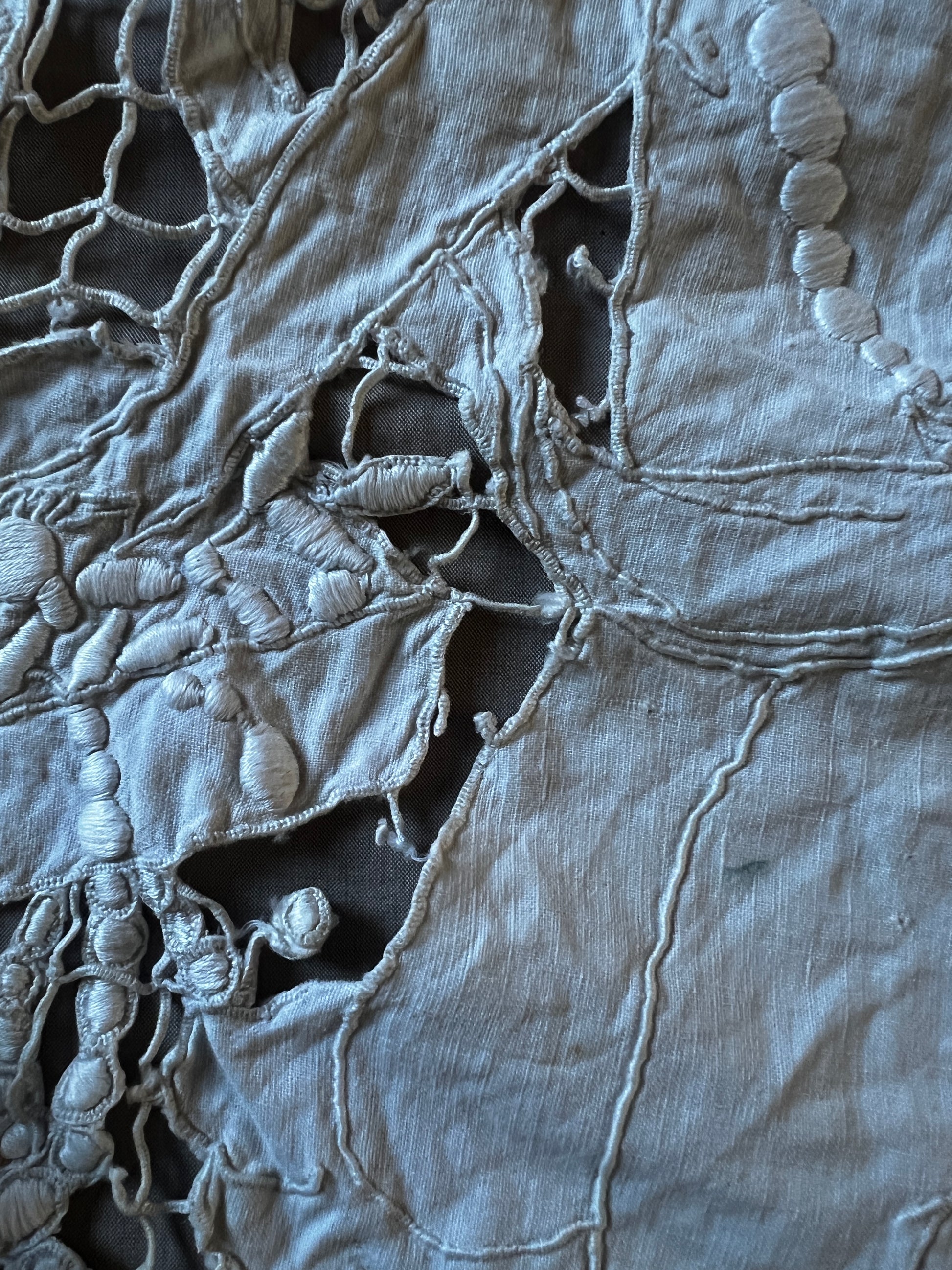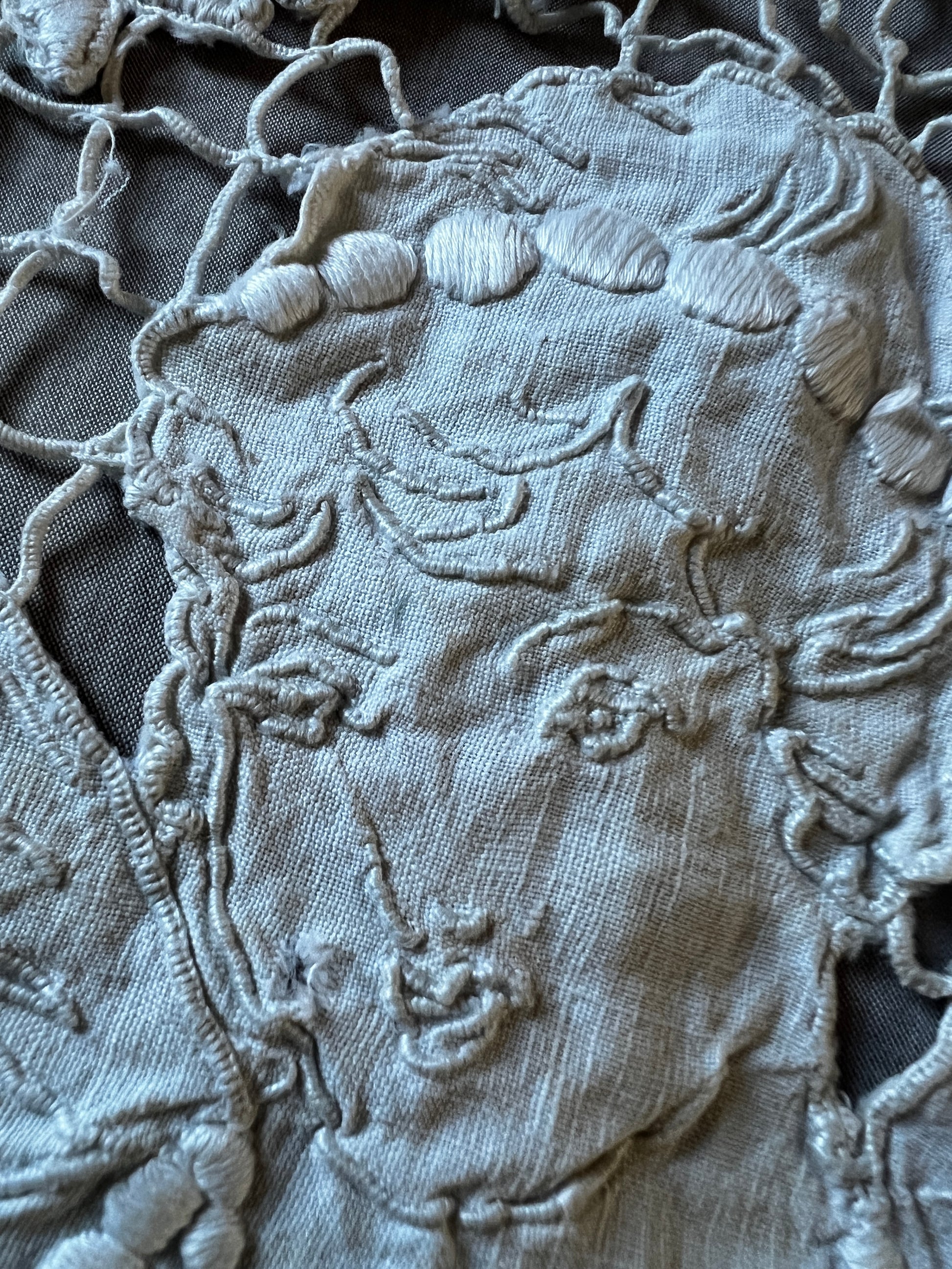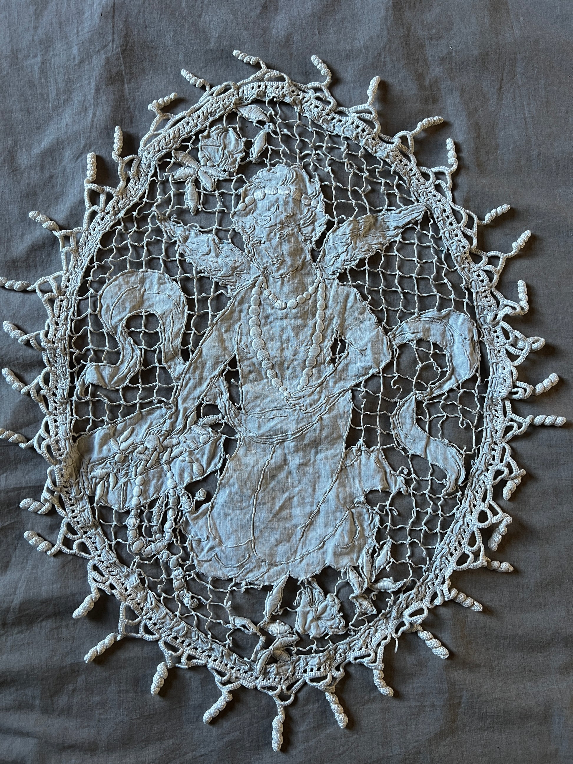 カットワーク刺繍で愛らしい天使の姿を描いた楕円形のクロスです