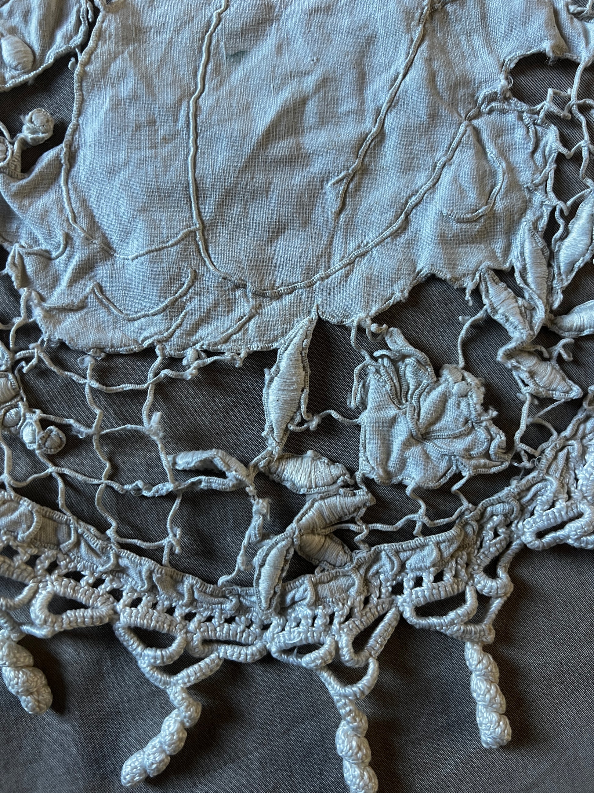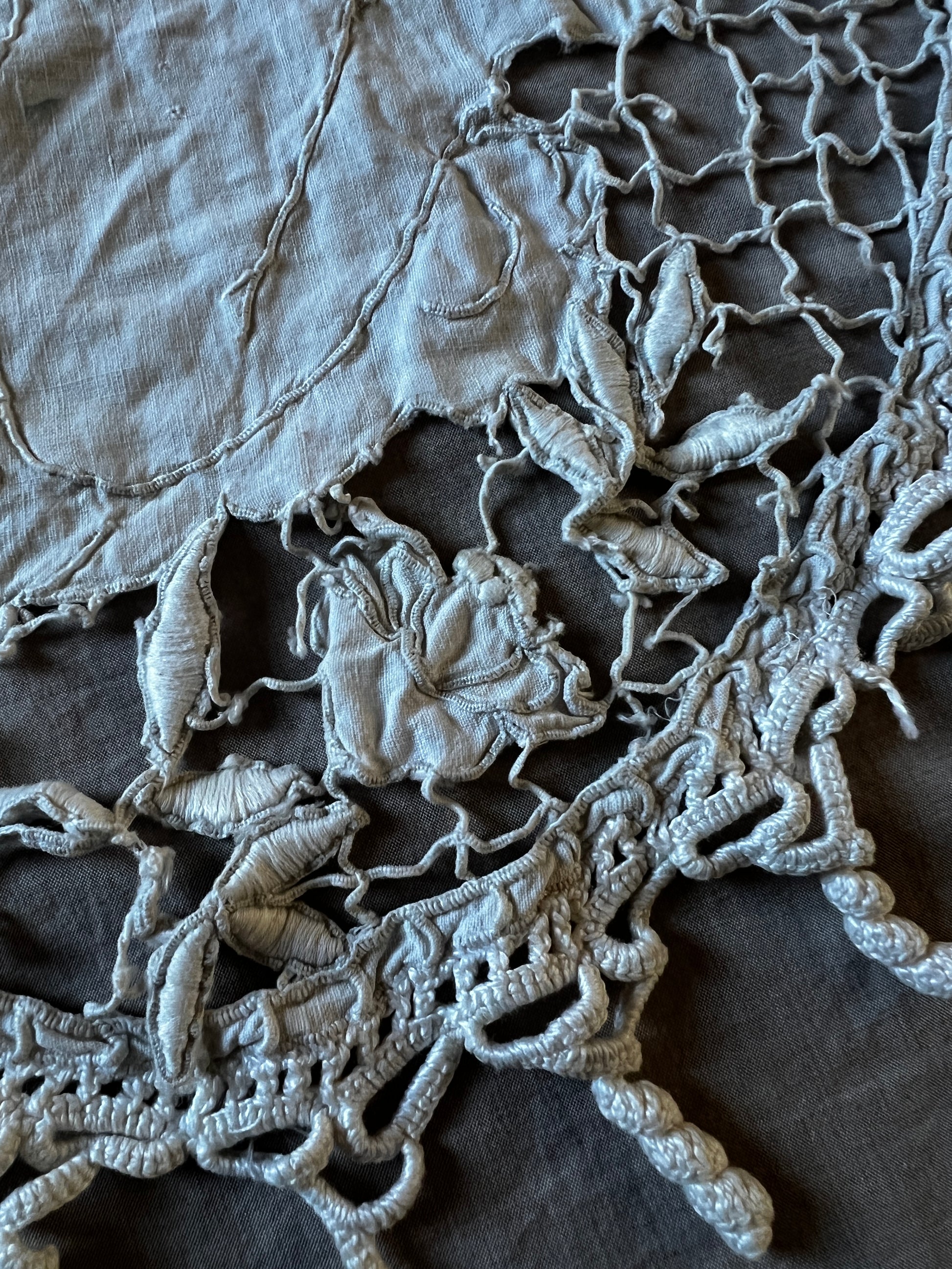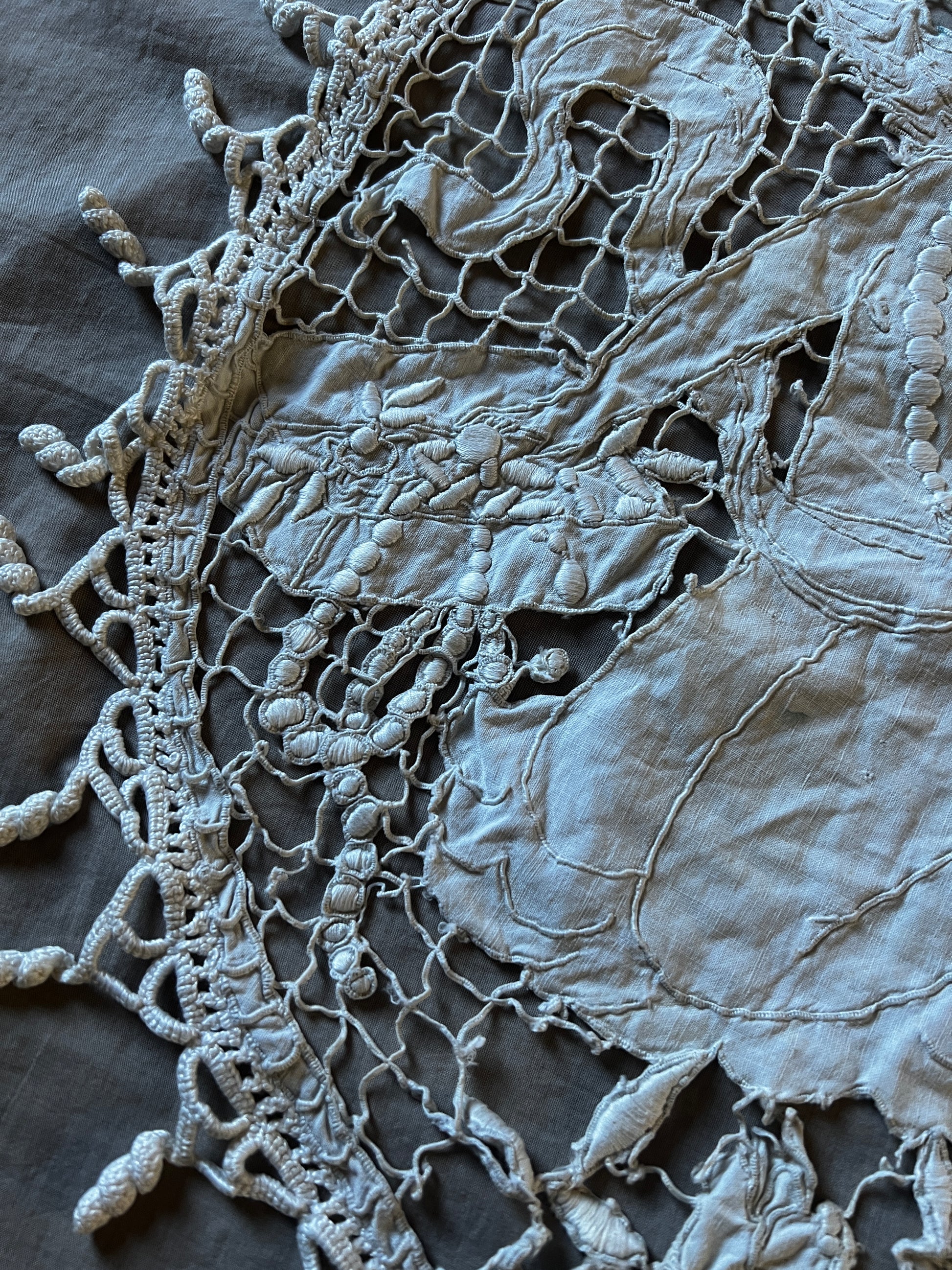 縁はクロシェ編みのコイル状の房飾りで優雅に縁取られています