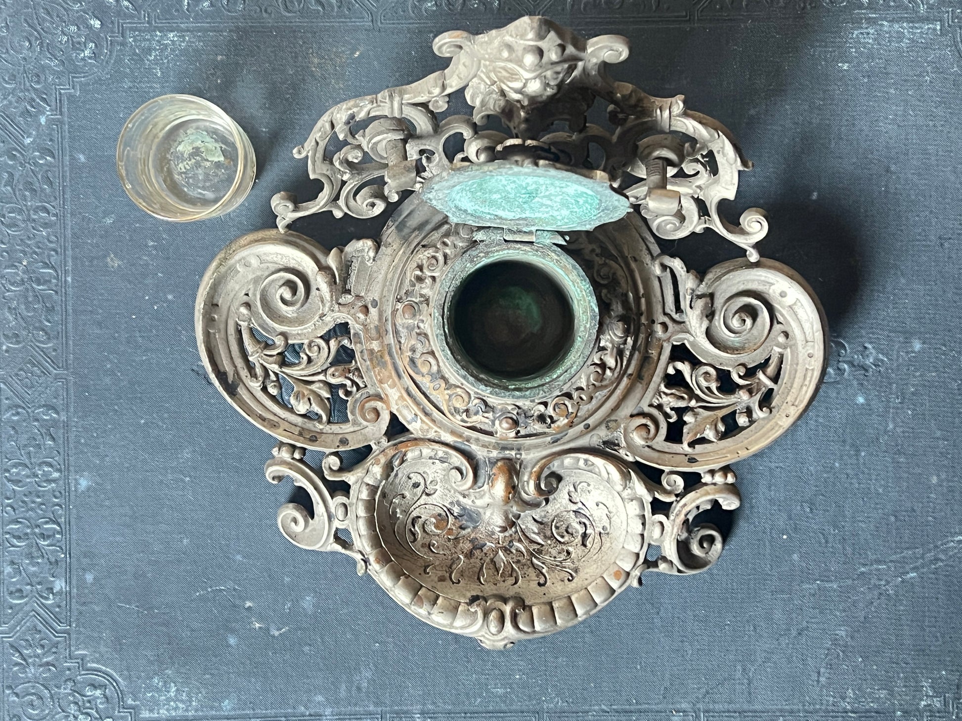 蓋裏に緑青、全体的にインクの染みのような変色が見受けられますのでフォトでご確認ください