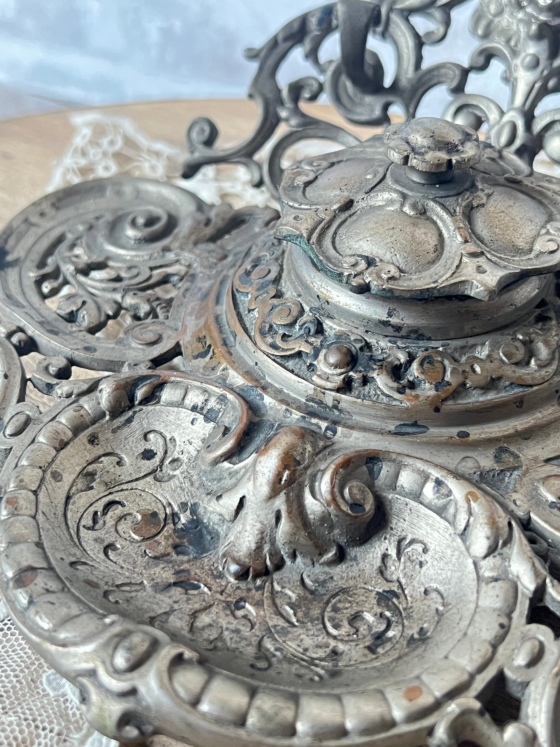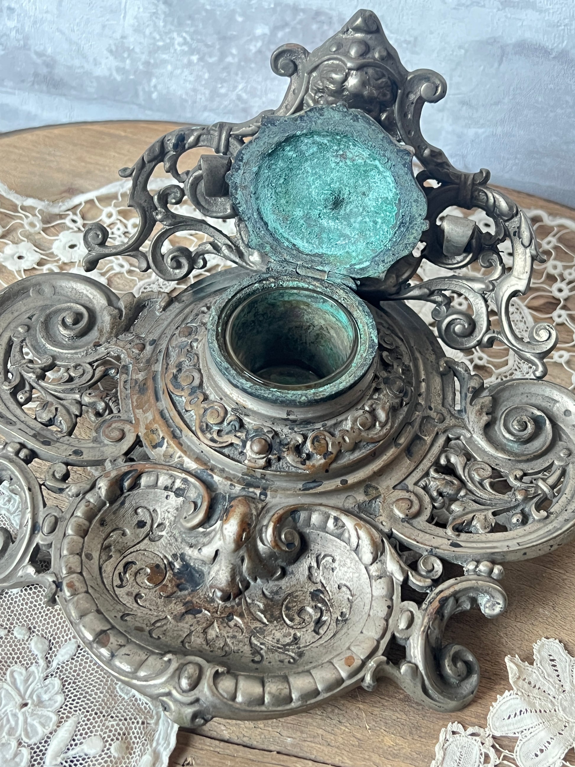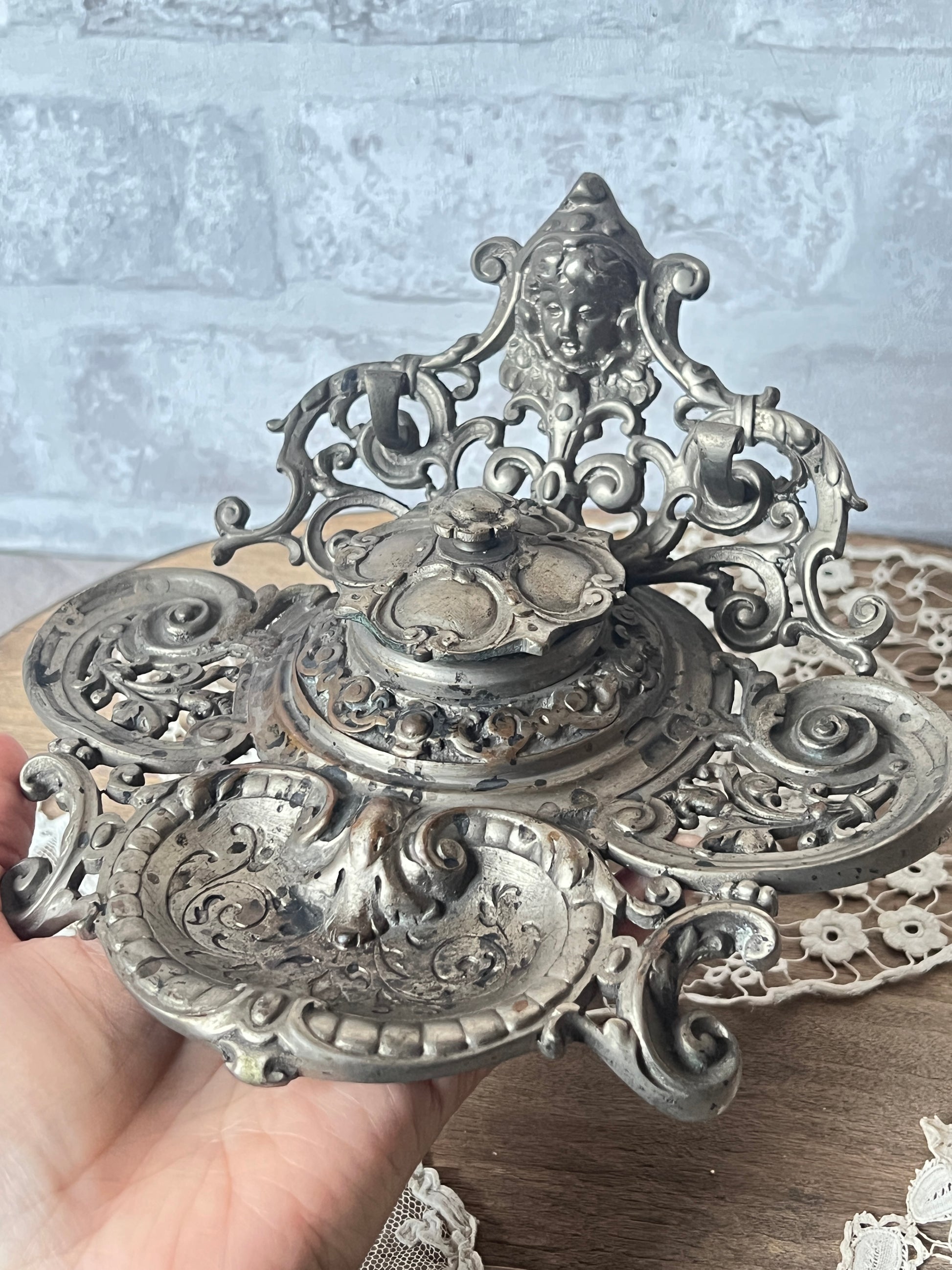 天使の装飾が美しいメタル製のインク壺トレイです