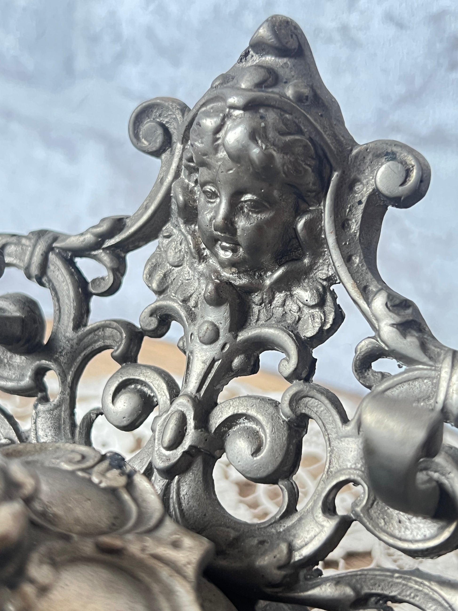 フレーム全体には、流麗なロココ様式のスクロール装飾や植物モチーフが立体的に細工されており、背面中央に配された天使のレリーフがデスク周りに愛らしさを添えています