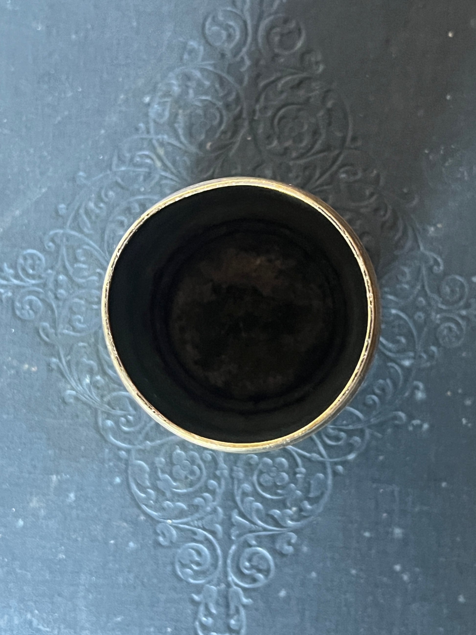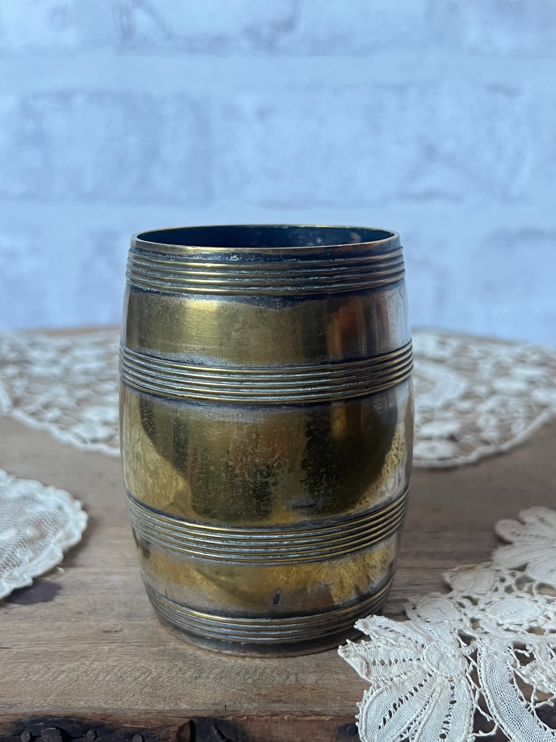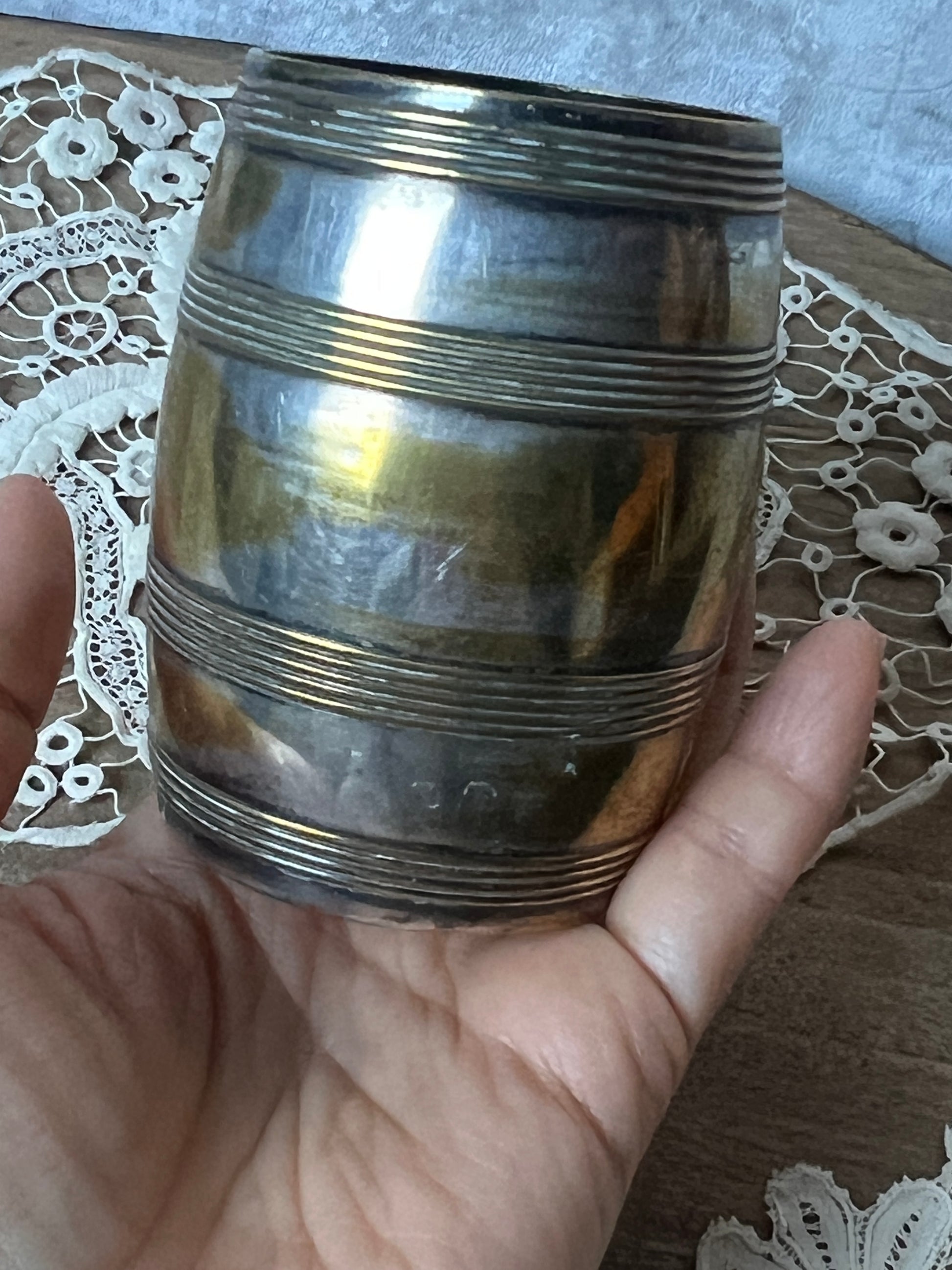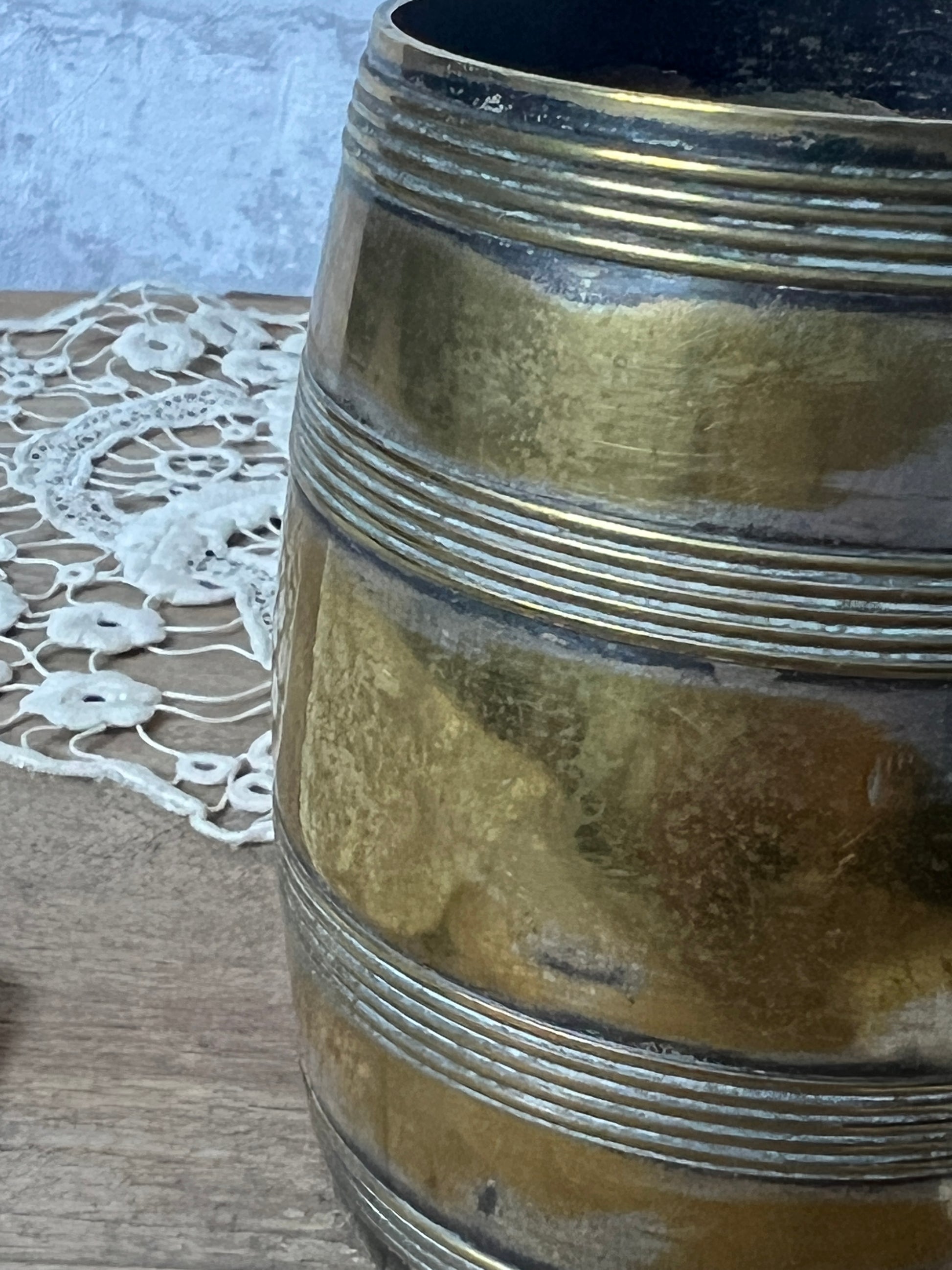 樽を思わせる丸みを帯びたフォルムに、等間隔に施された繊細なラインの装飾が美しく、使い込まれたことで現れた真鍮の地金と銀の輝きが絶妙なグラデーションとなって、重厚な佇まいを醸し出しています