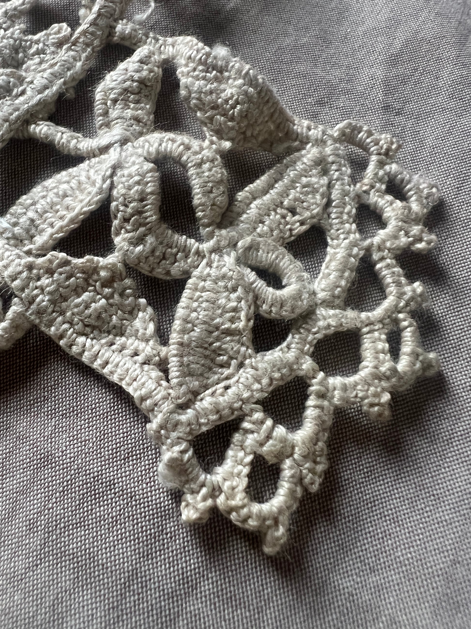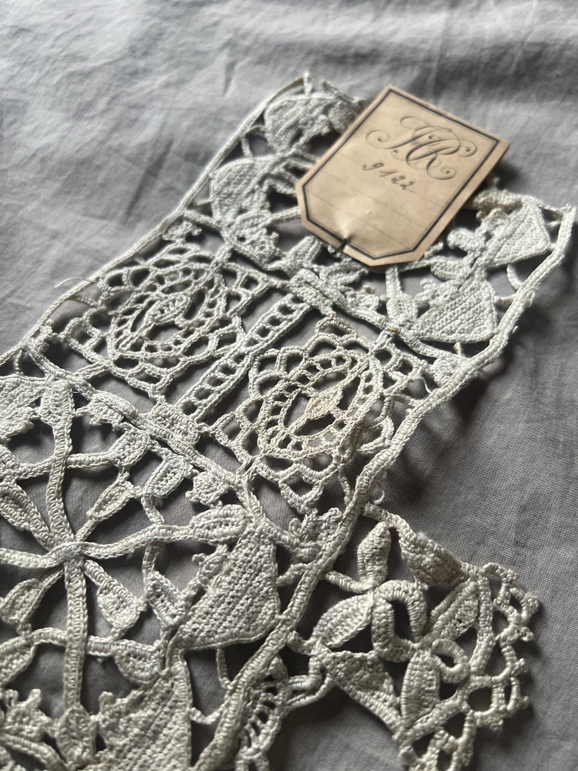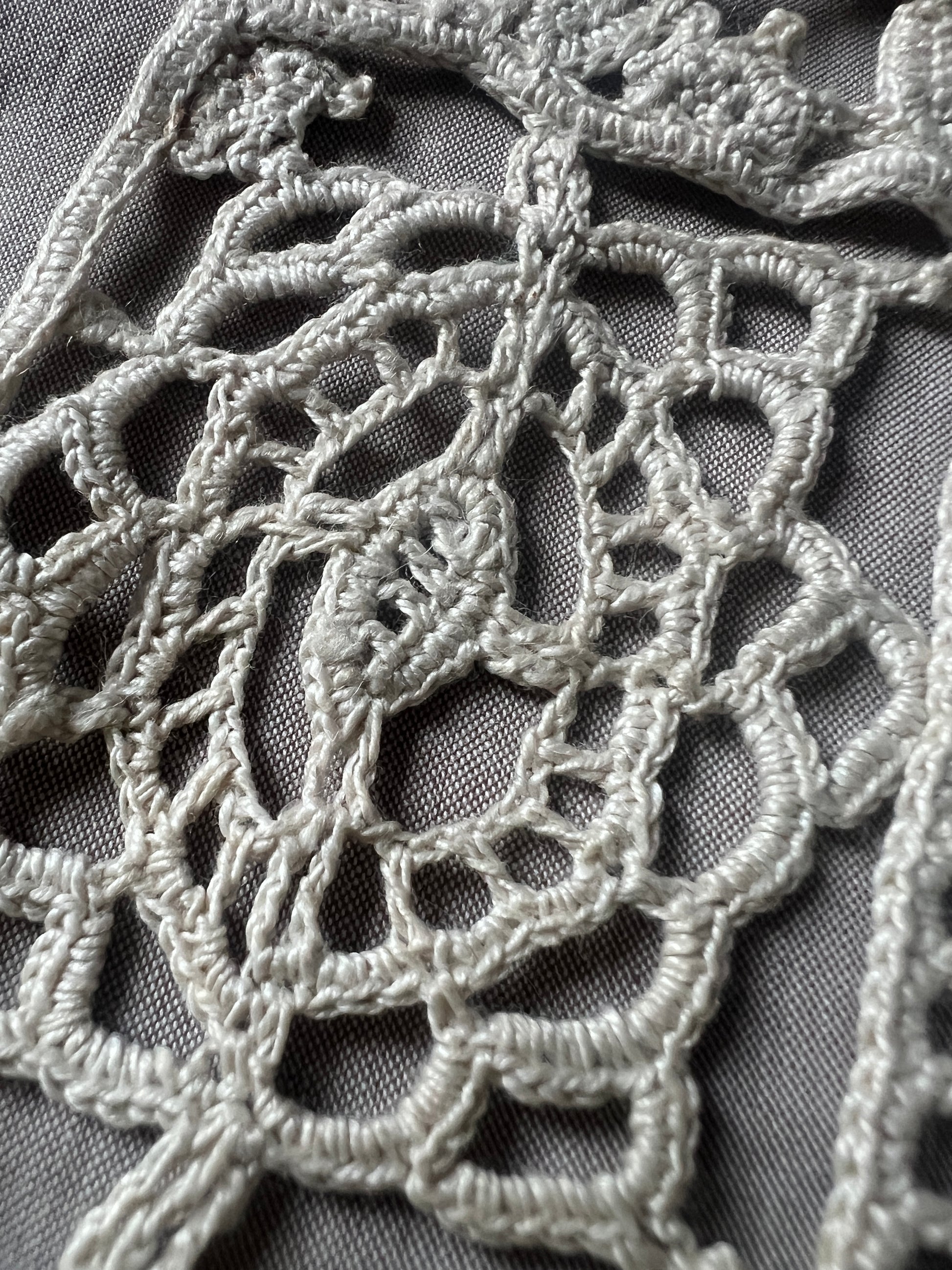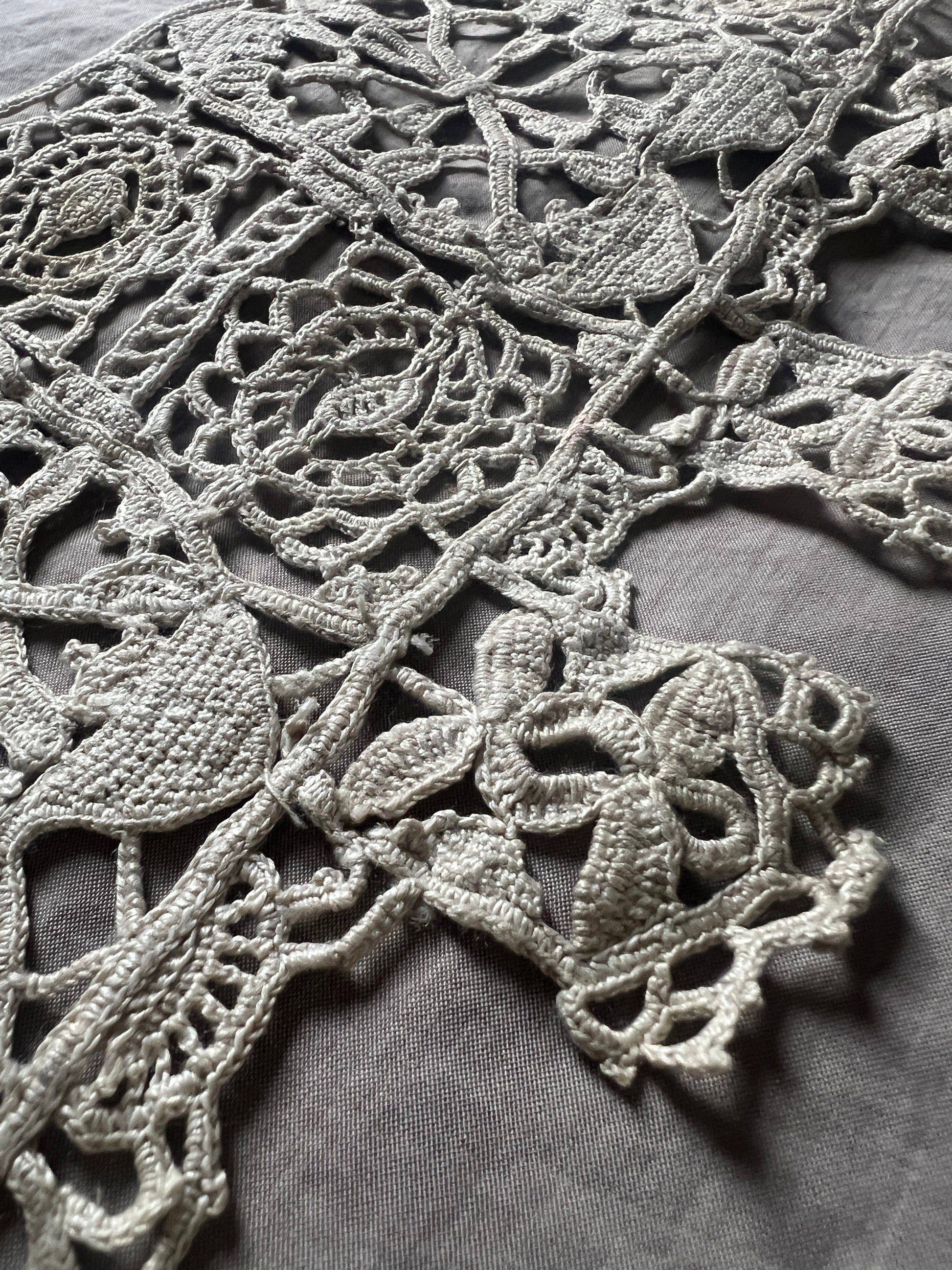 細やかなクロシェ編みで花や植物のモチーフを表現した、アンティークのレース見本ピースです