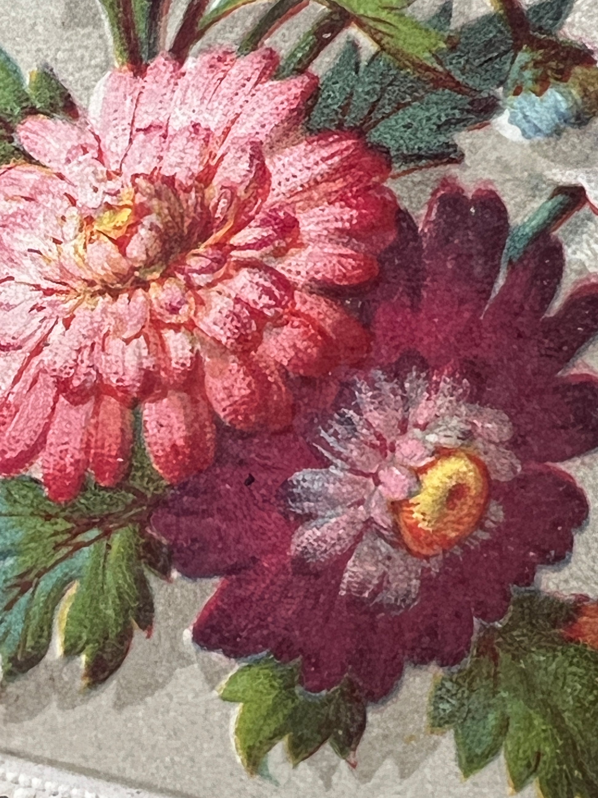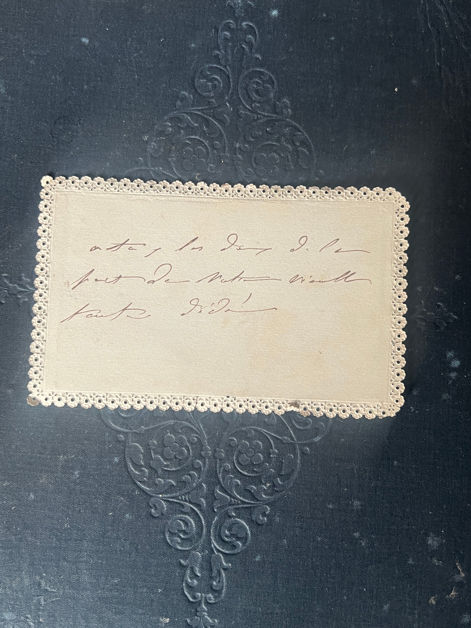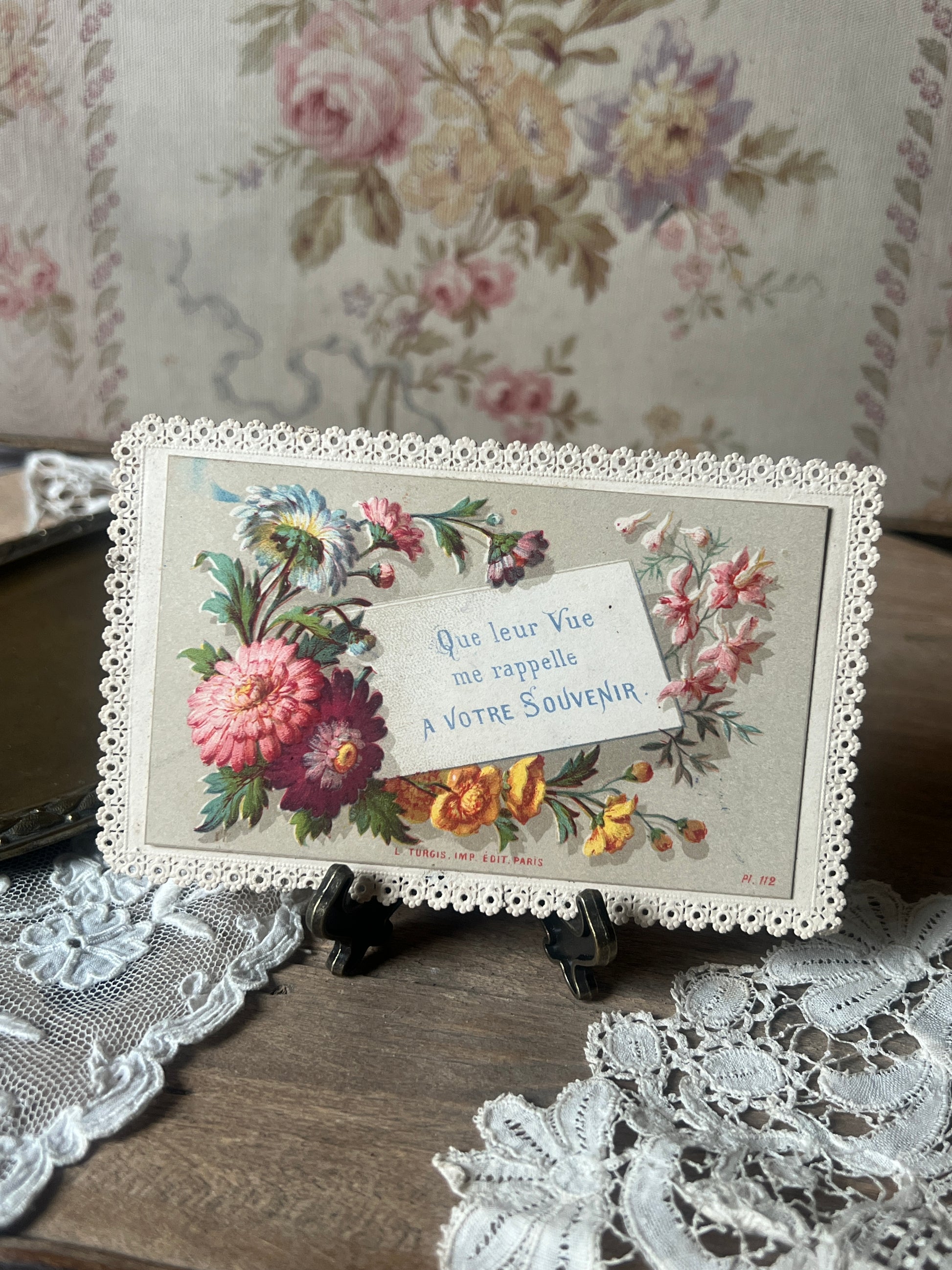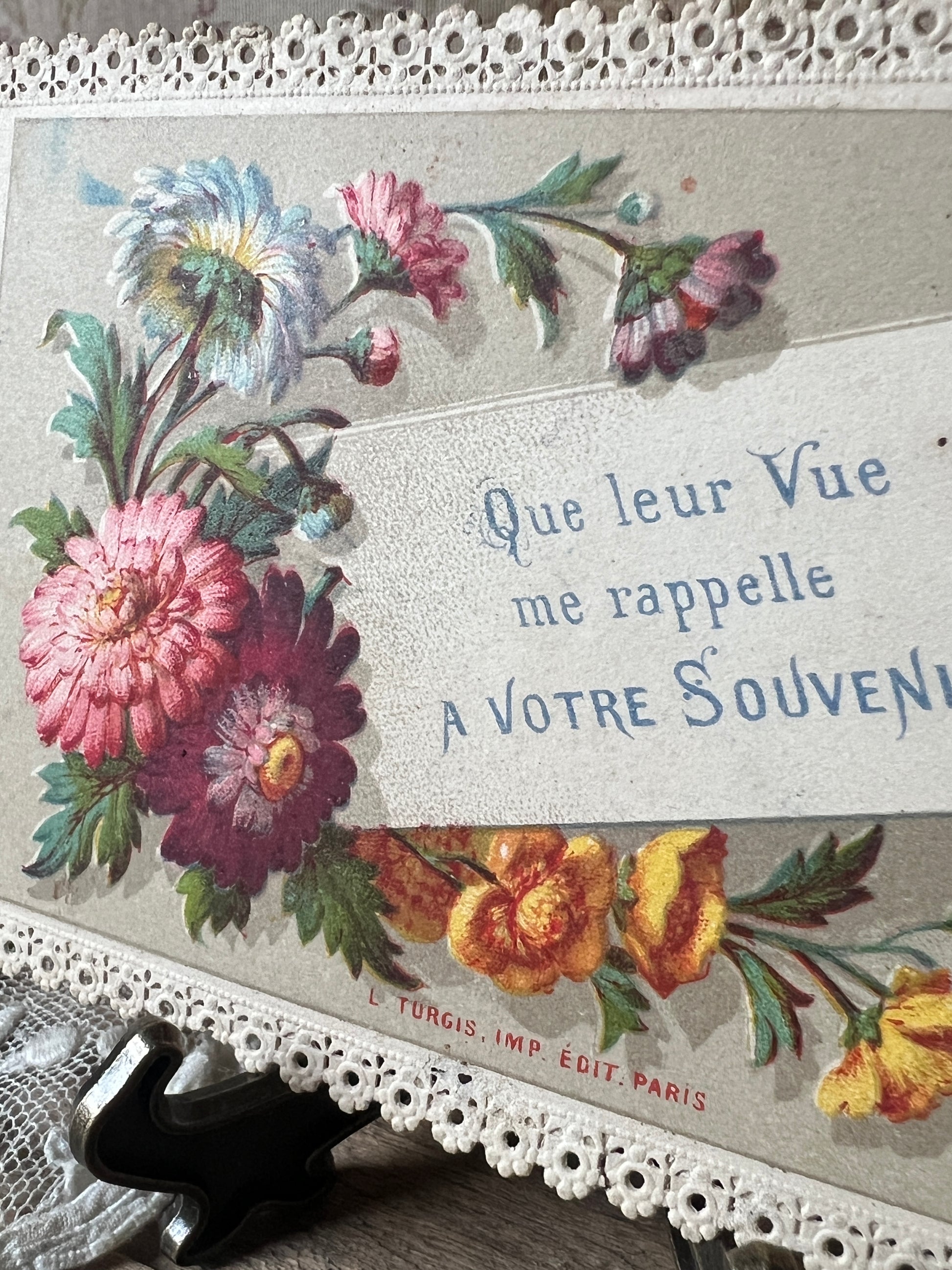 ブーケとともに「あなたの思い出に(A VOTRE SOUVENIR)」という優しいメッセージが添えられ、裏面には当時の持ち主による手書きのサインが残っています