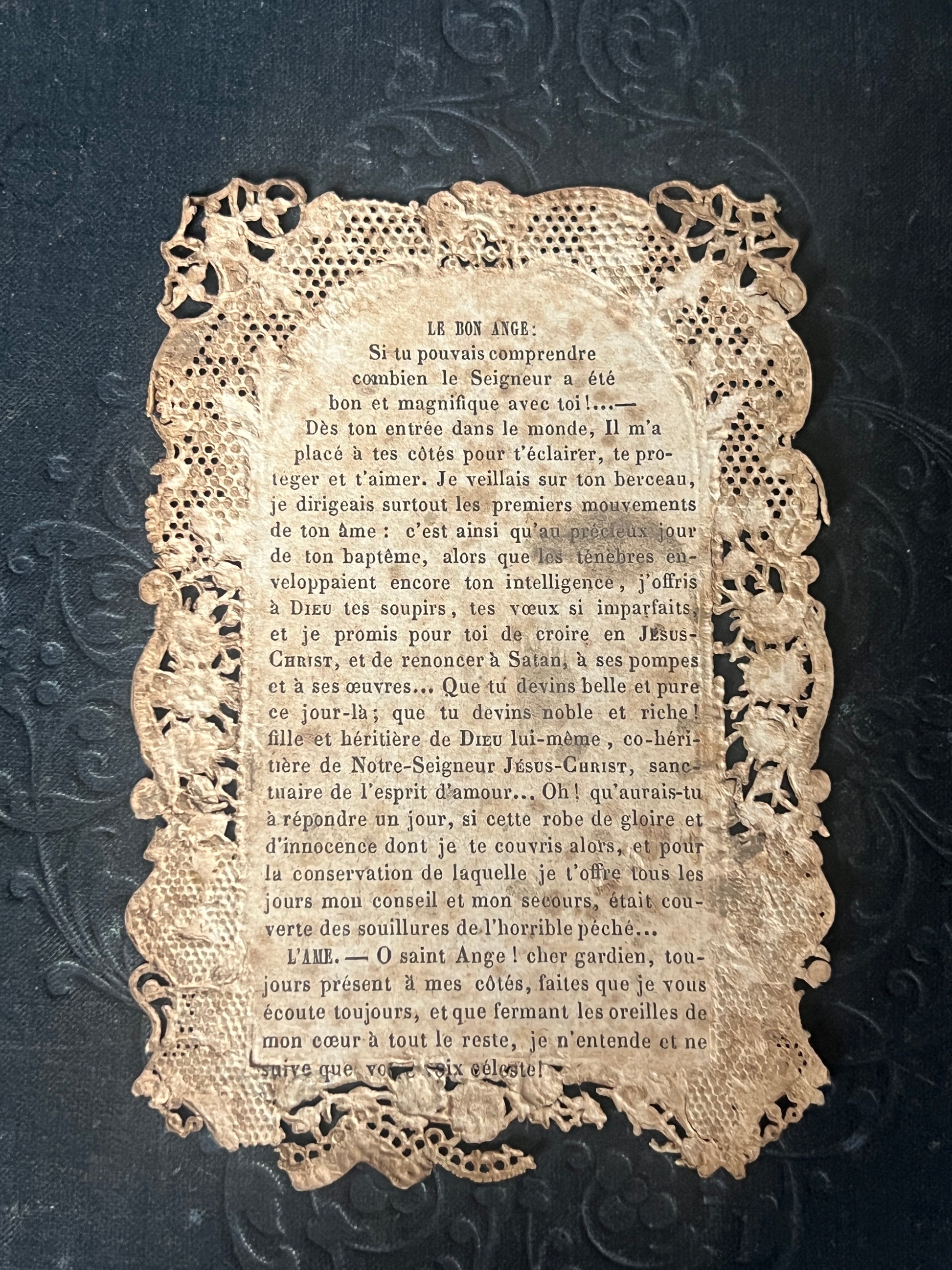 「CONDUITE DU BON ANGE(善き天使の導き)」と題されたこの一枚は、裏面にも信仰にまつわるフランス語のテキストがびっしりと記されており、当時の人々が大切に持っていた信心具としての背景が伺えます