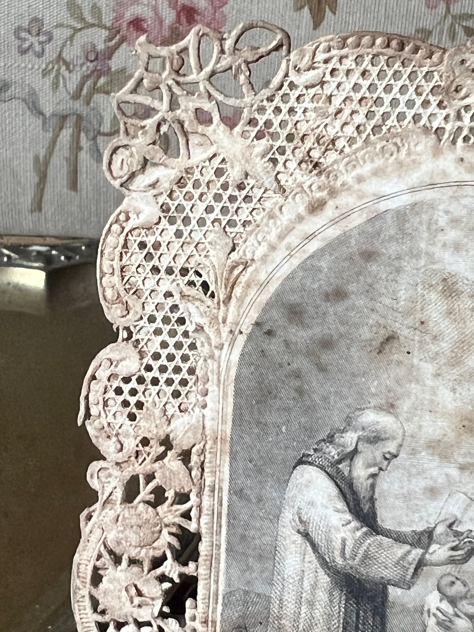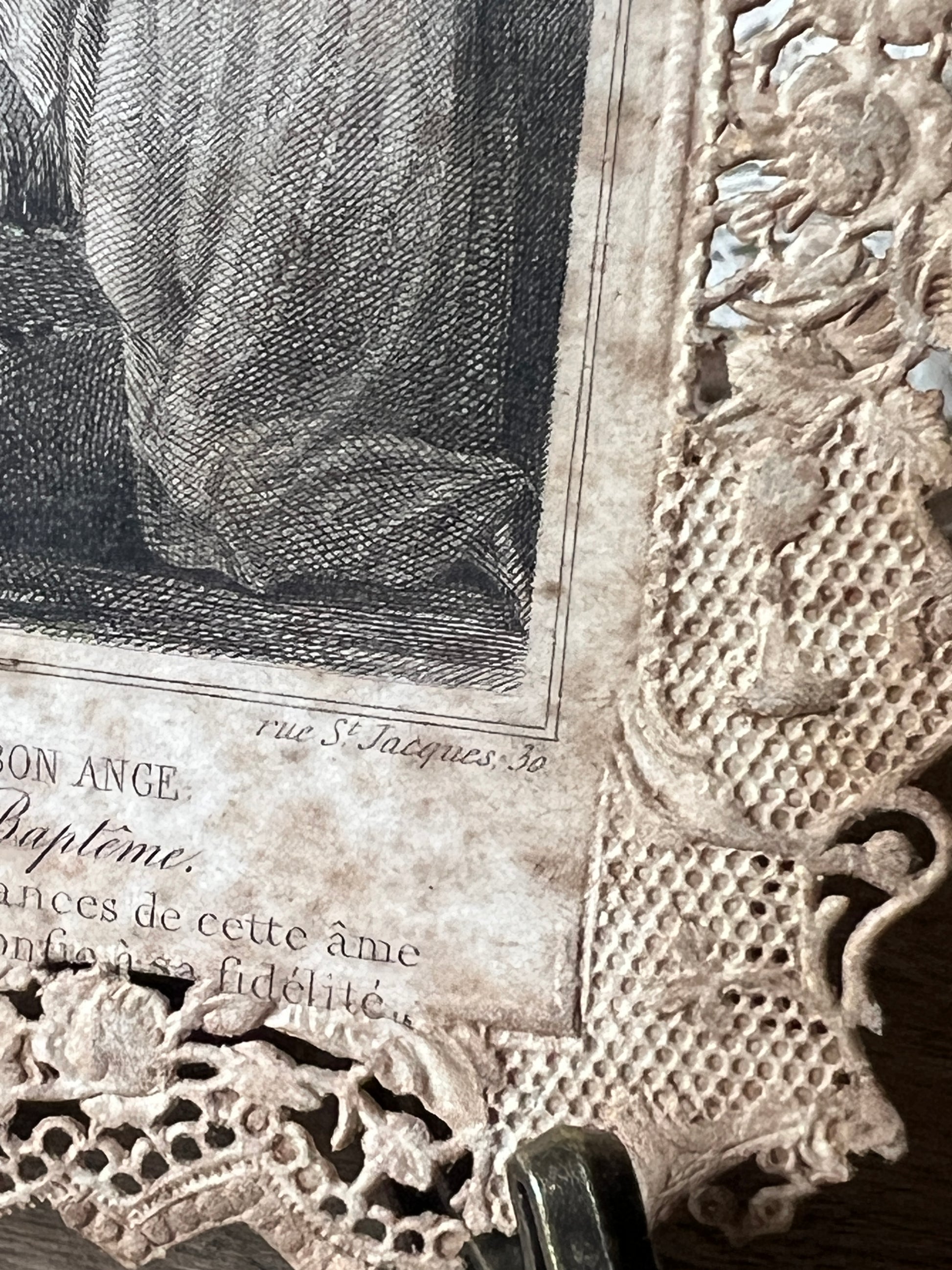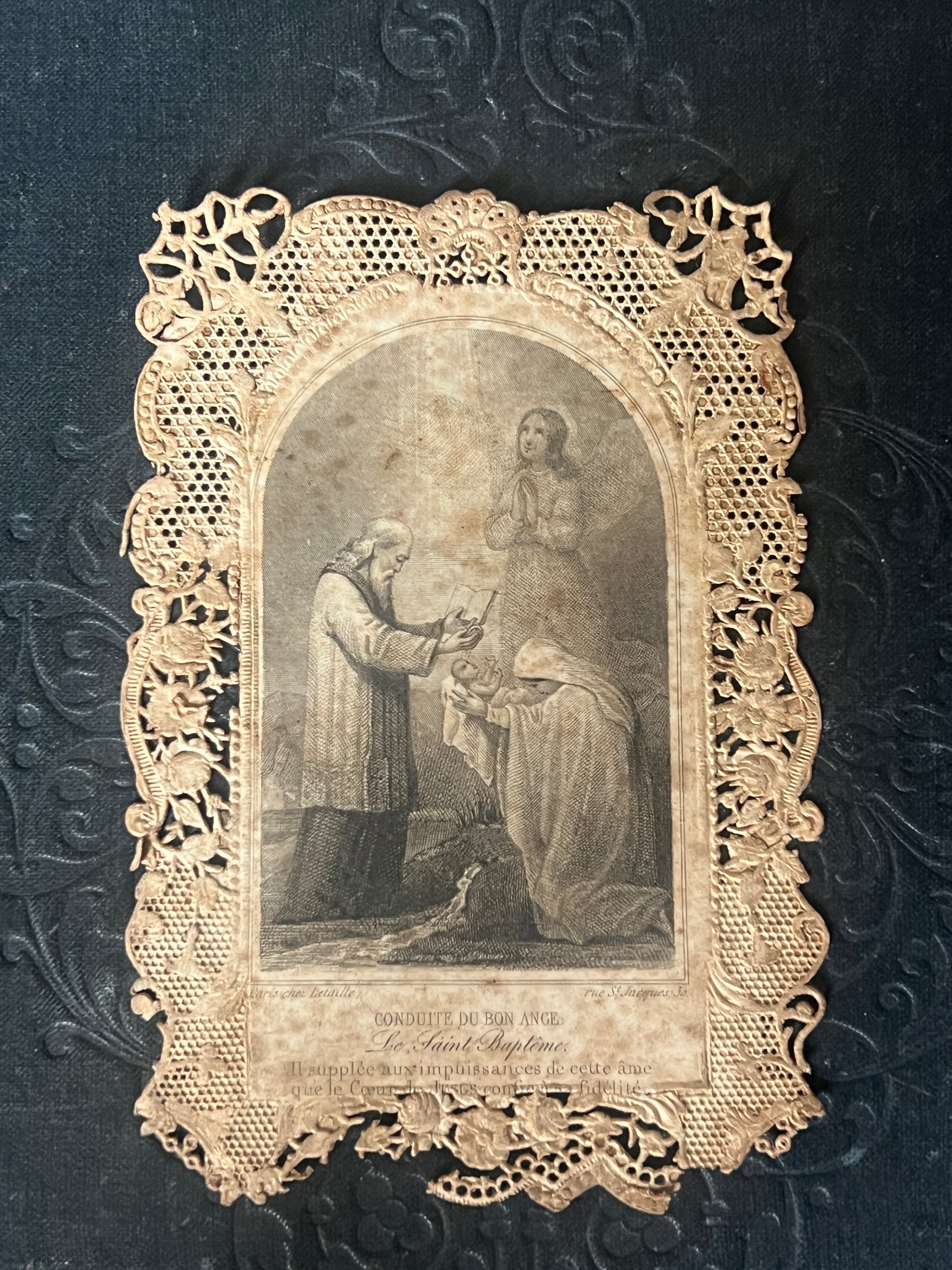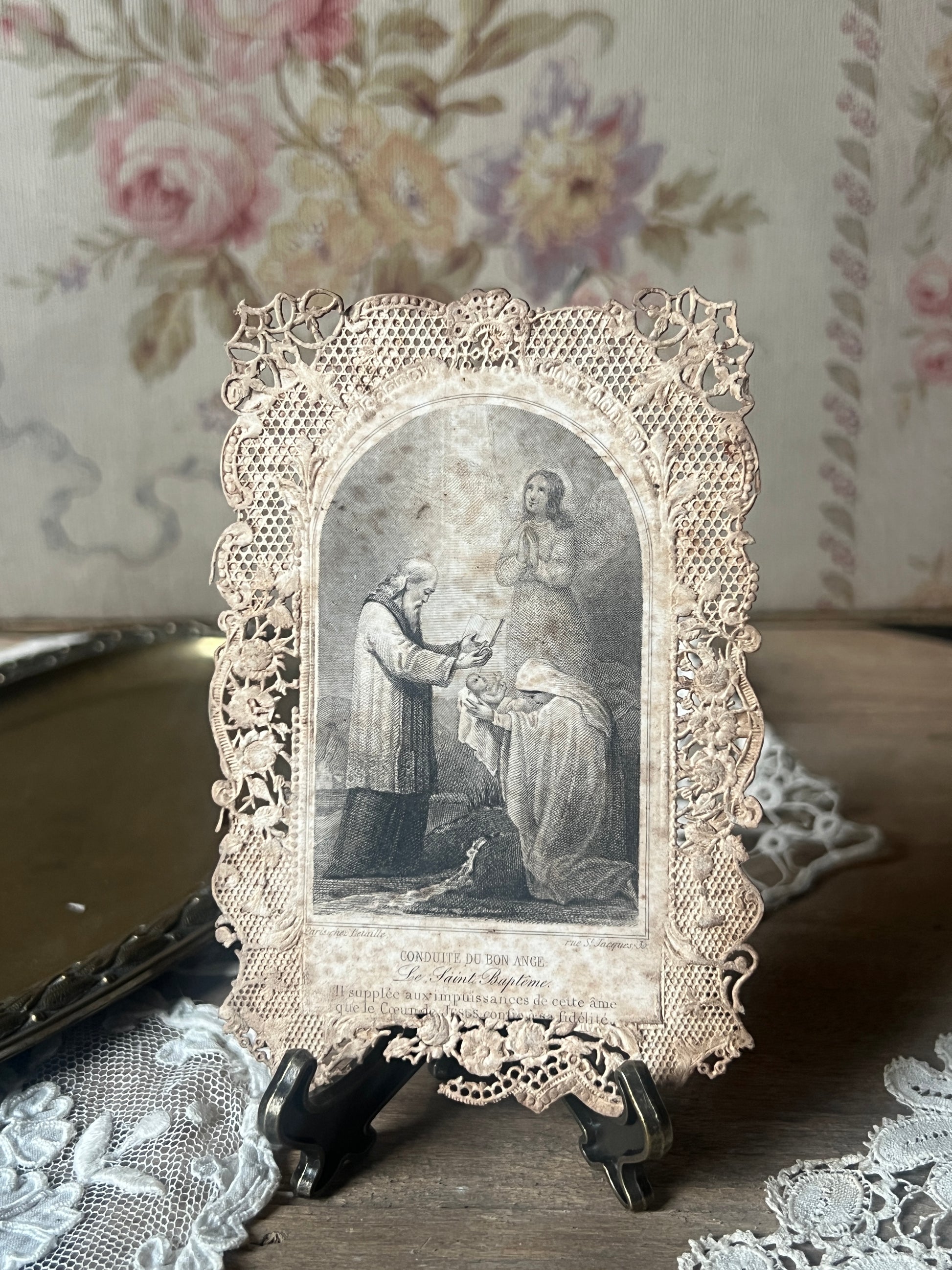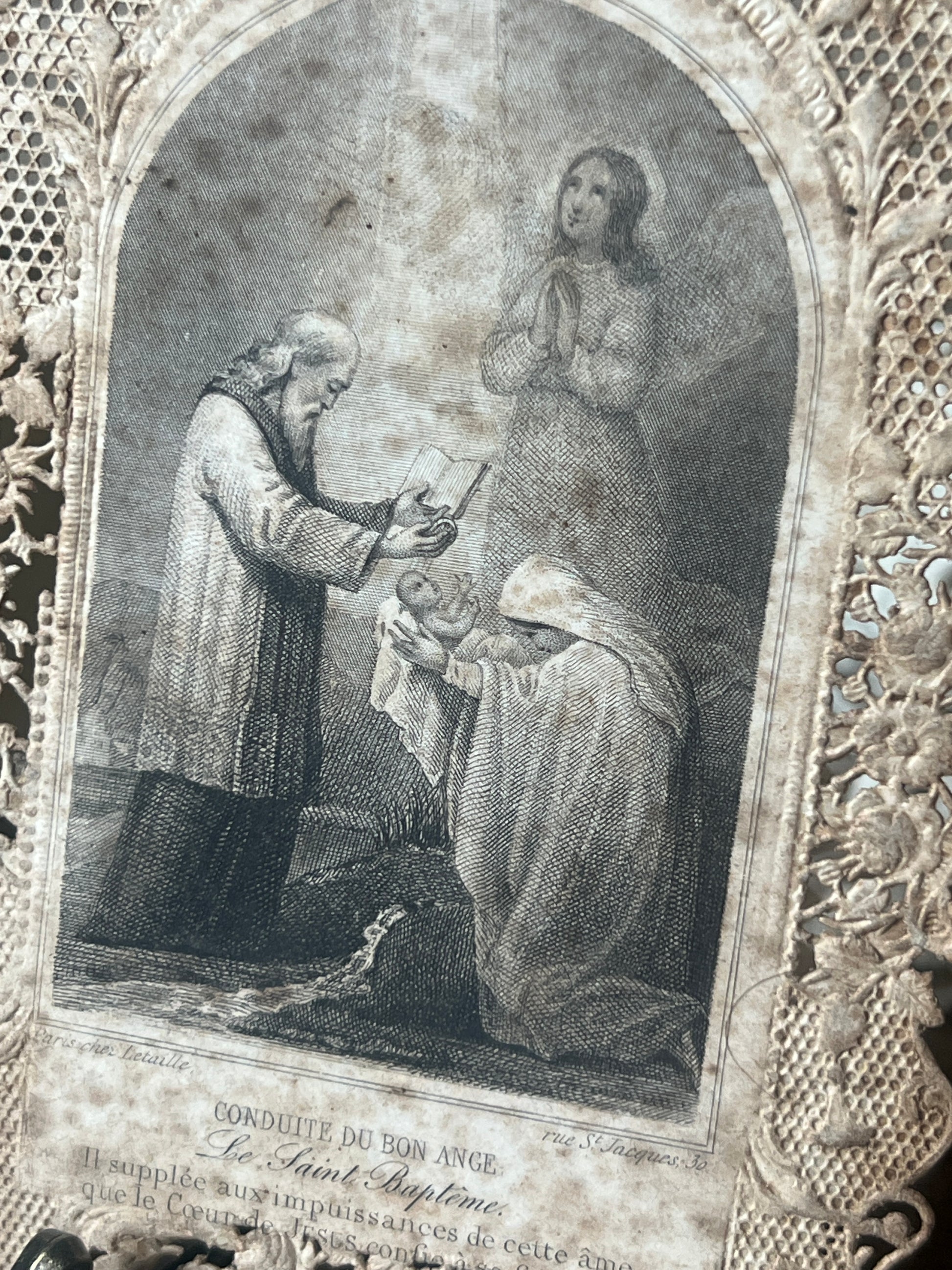 驚くほど繊細な透かし細工が施されたレースペーパーの中央には、幼子の洗礼を優しく見守る守護天使の姿が銅版画で描かれています