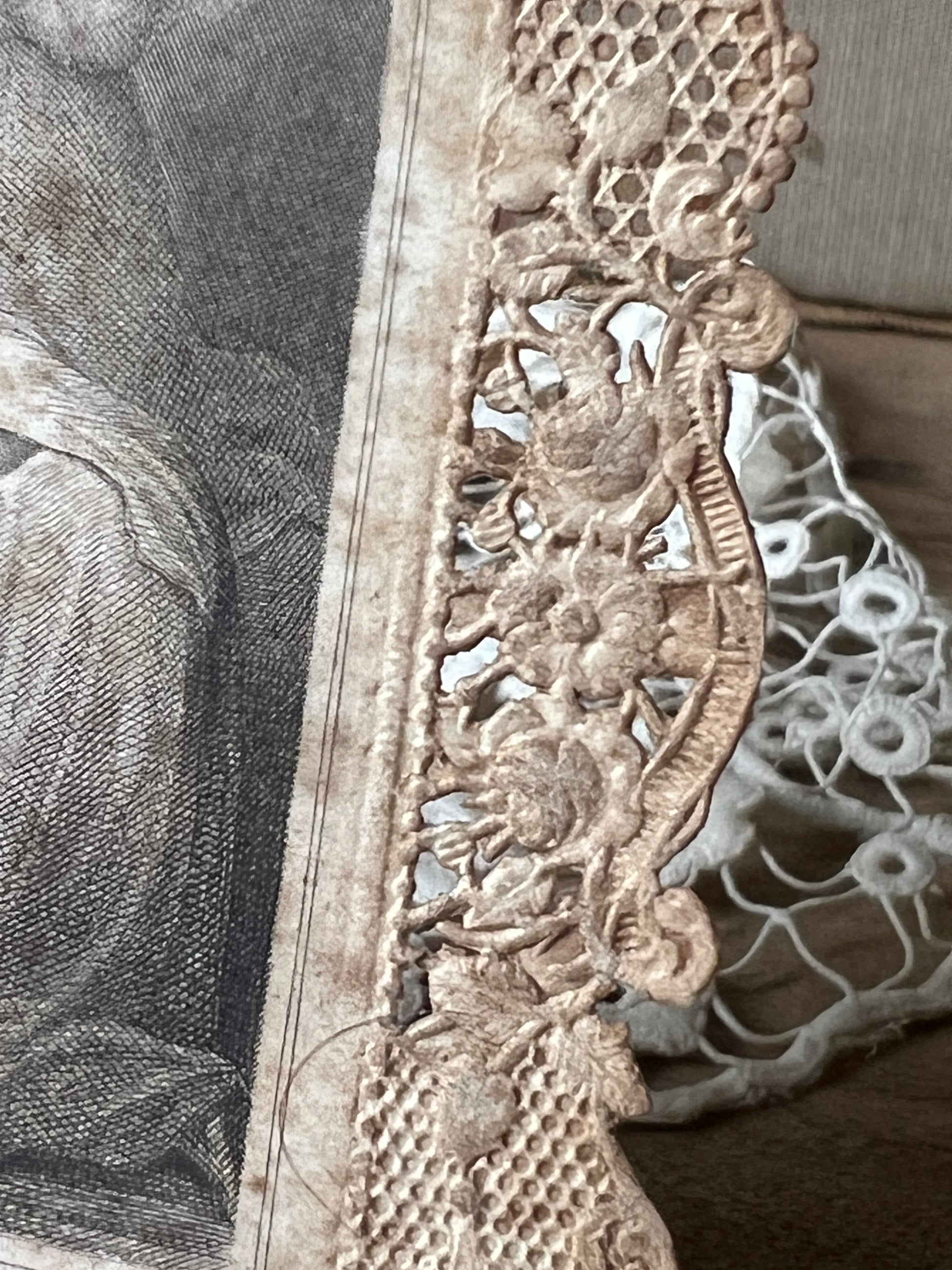 経年によるセピア色の色づきや、紙の端のわずかな擦れがアンティークならではの深い味わいを生んでおり、光を透かすとレース模様がより一層美しく浮かび上がります