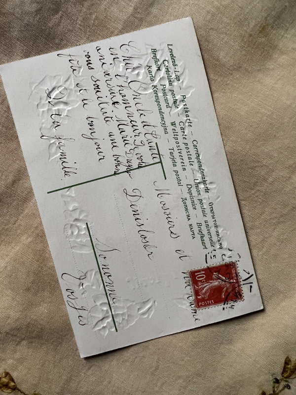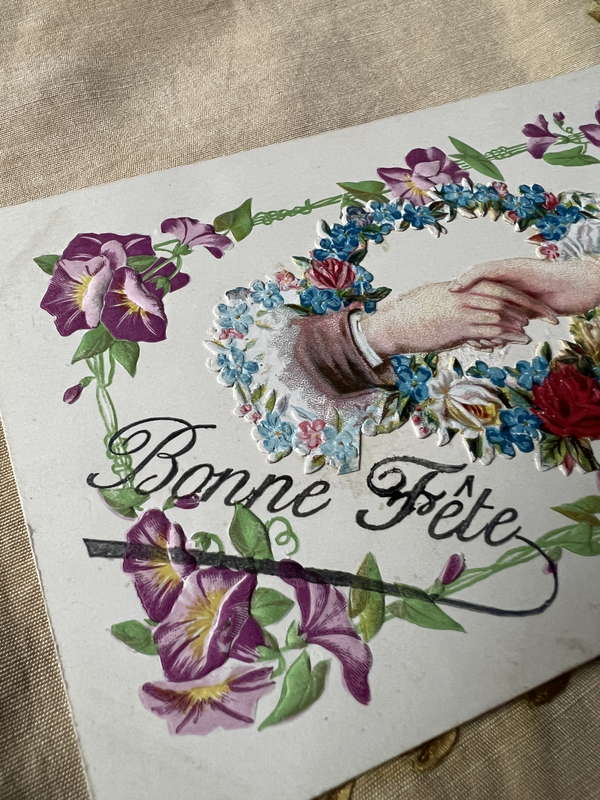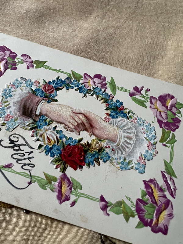 エンボスの美しいカードにクロモスが配置された大変デザイン性の高いアンティークポストカードです。
