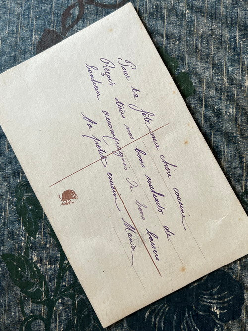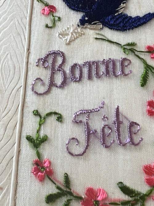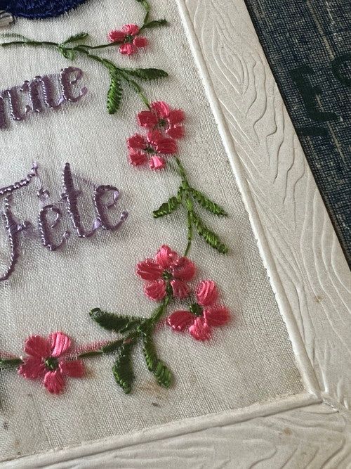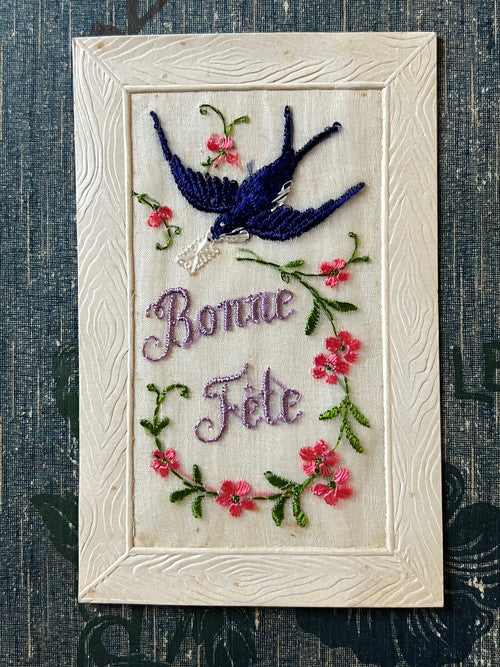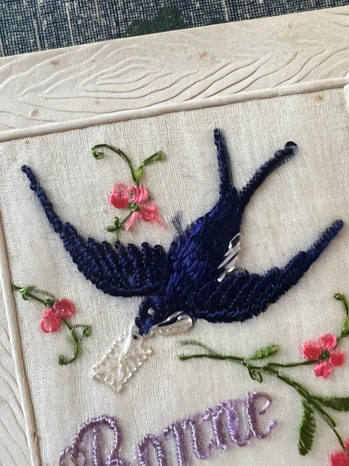 つばめや春の草花のデザインの刺繍が装丁されたポストカードです。 裏面の流れる自体のメッセージも素敵です。