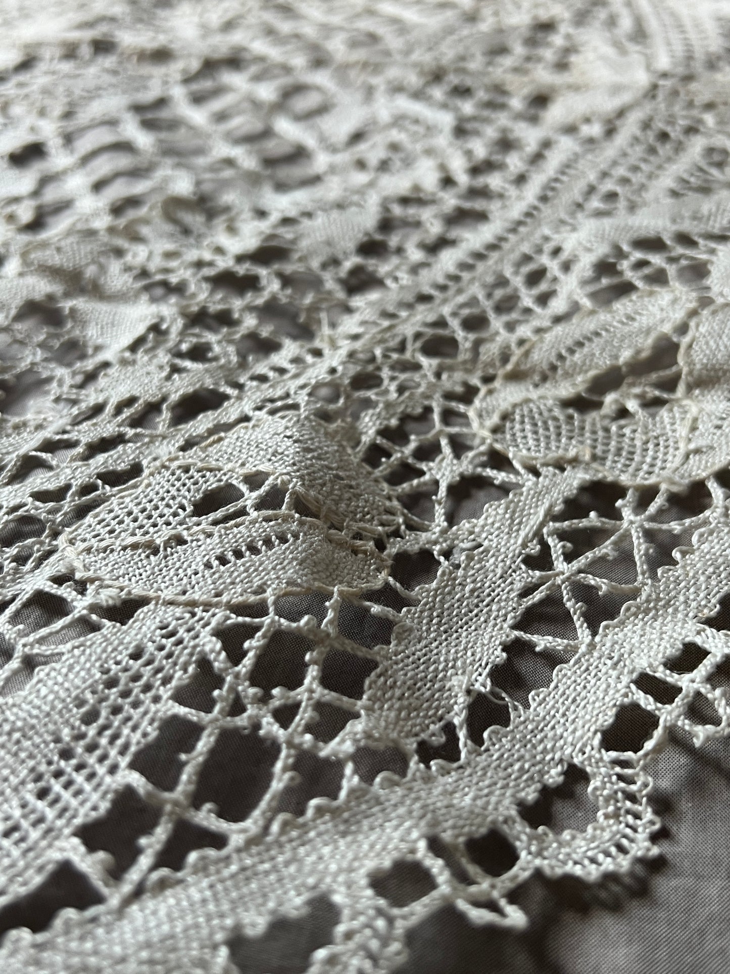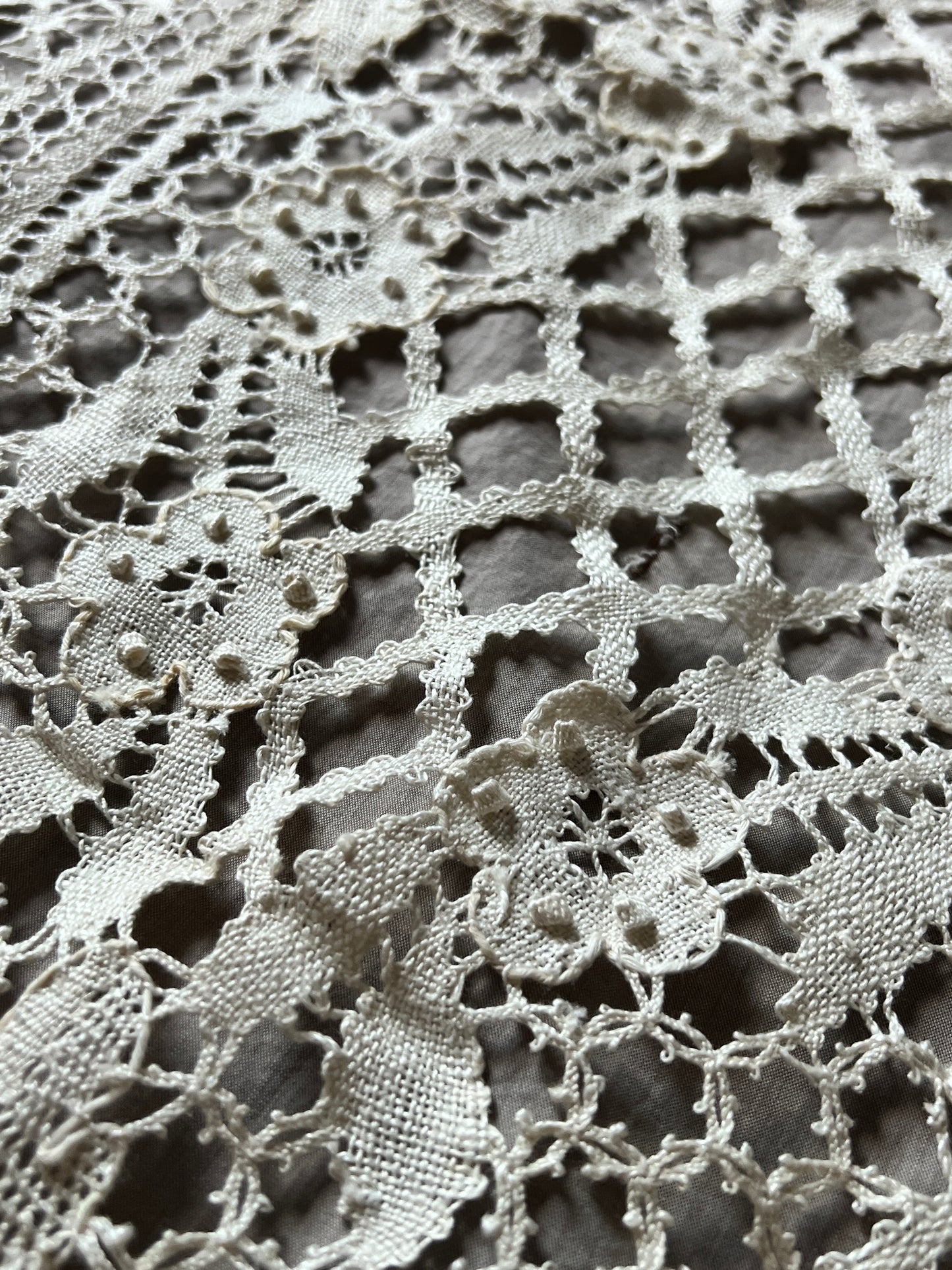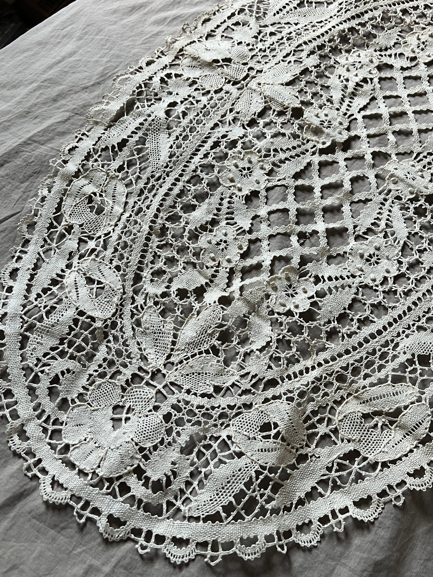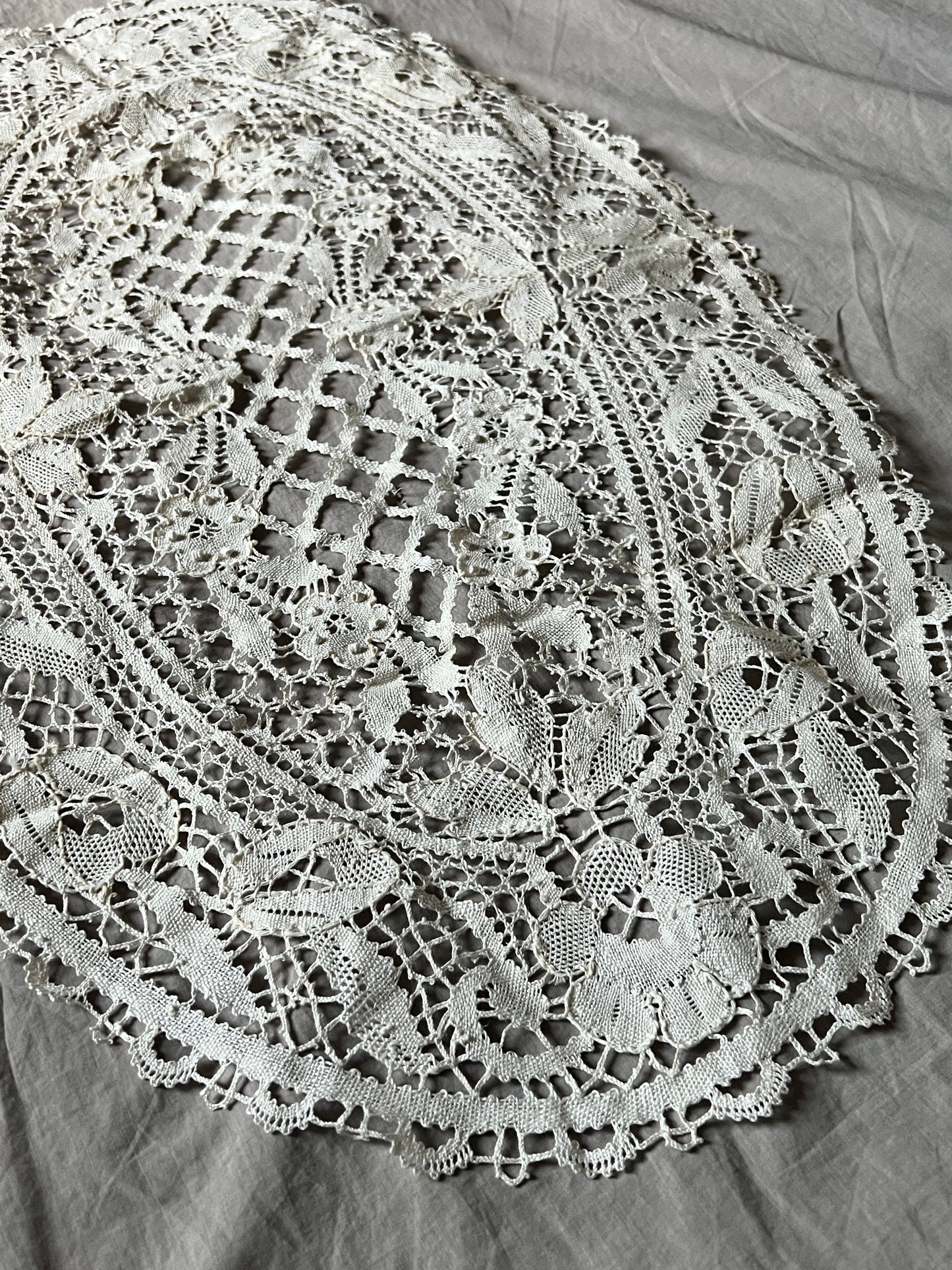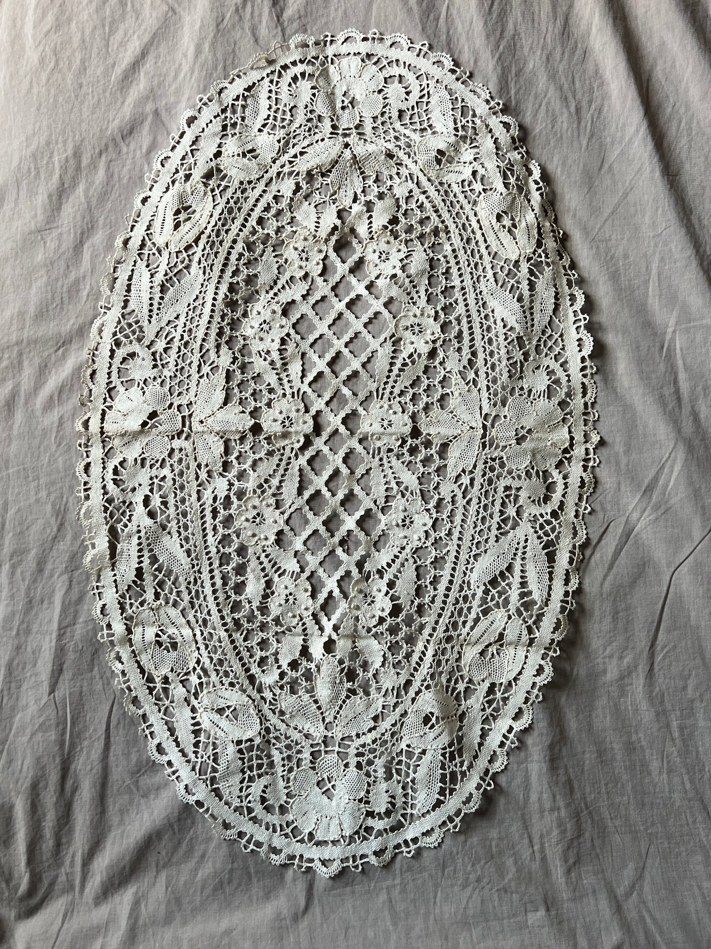 中盤サイズのボビンレース楕円クロスです。 トラディショナルなデザインで飽きのこないお品。 汚れダメージの少ない美品です。