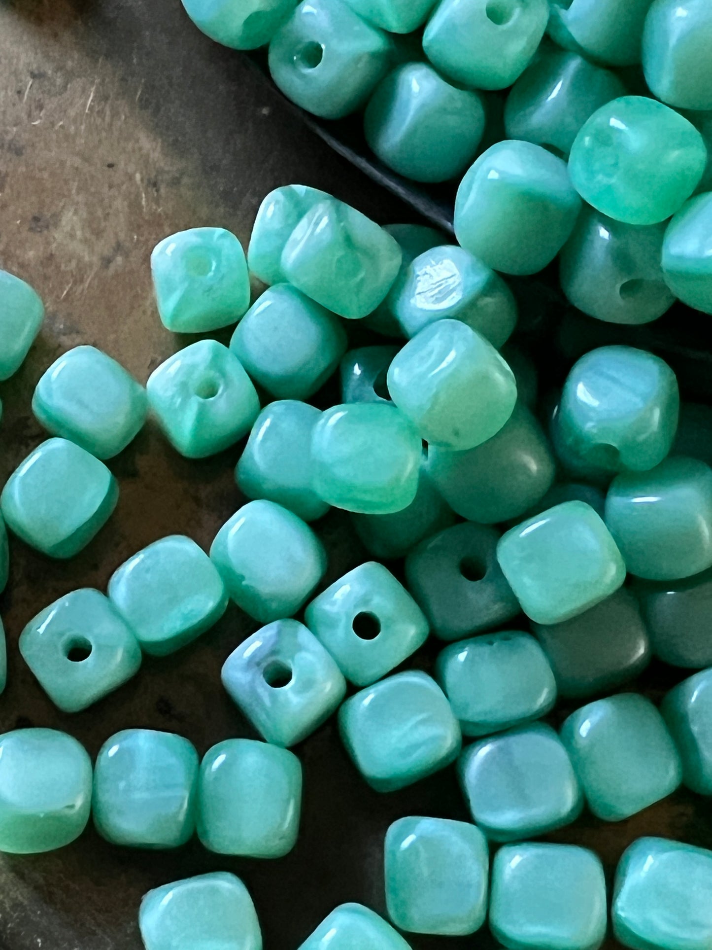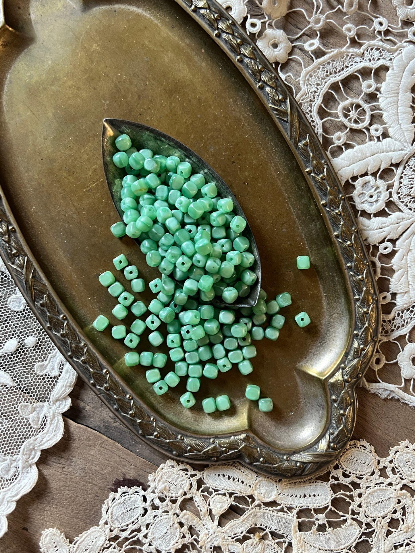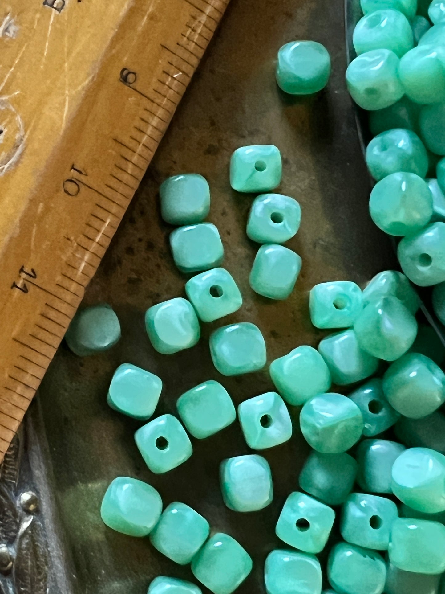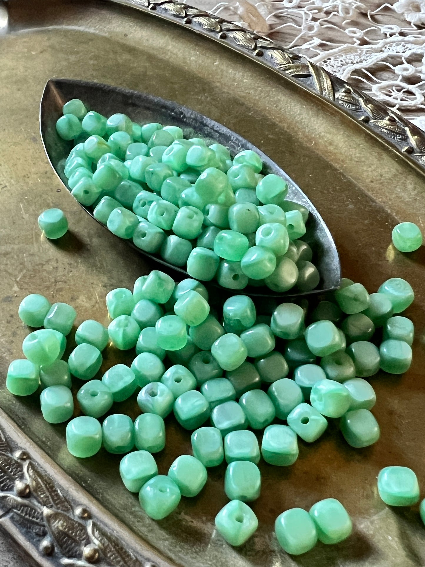 サイズ詳細省略 50g 約100粒程度 翡翠のような色味のロザリオ用ビンテージパーツです。 やや角ばった形。