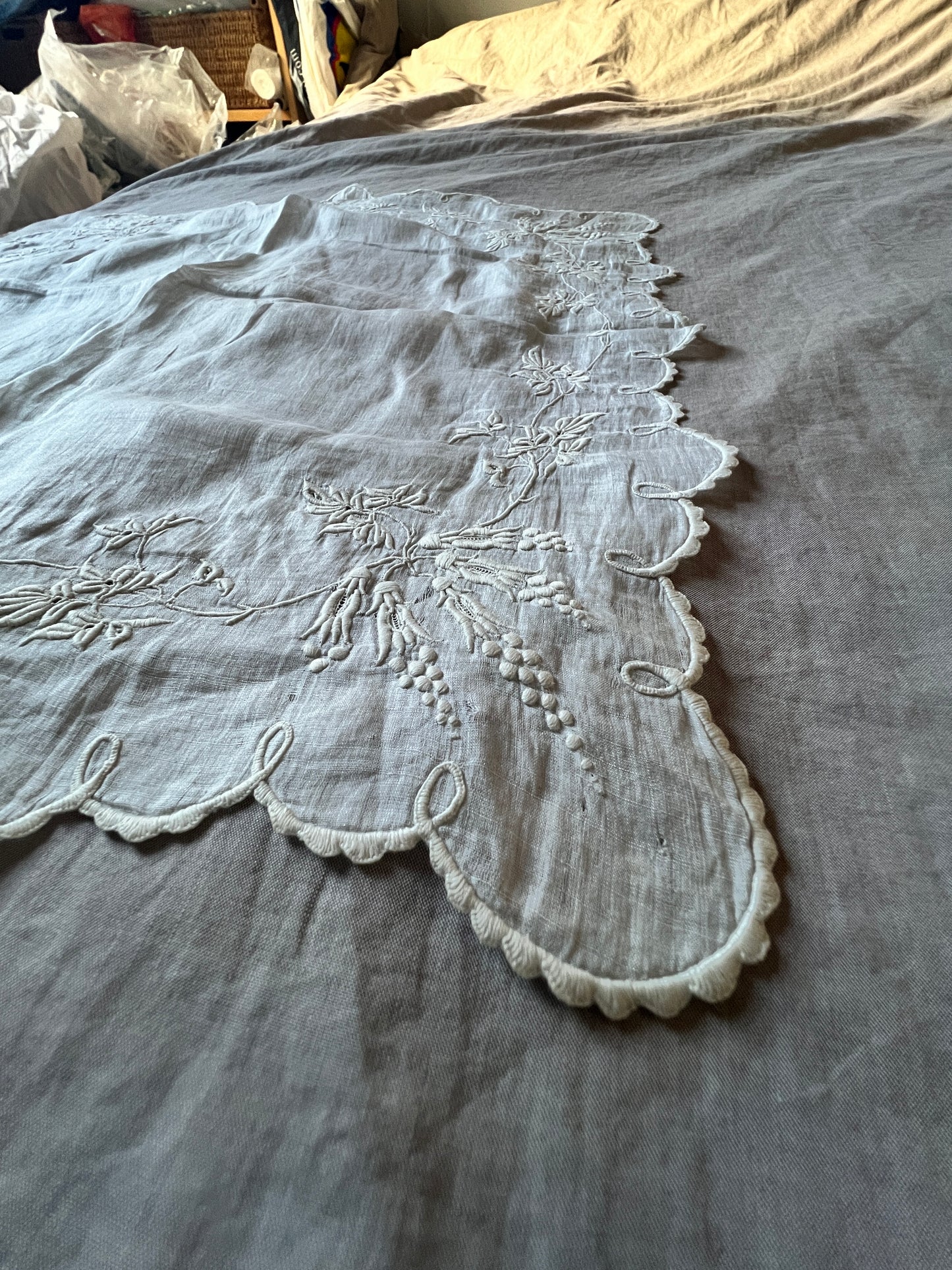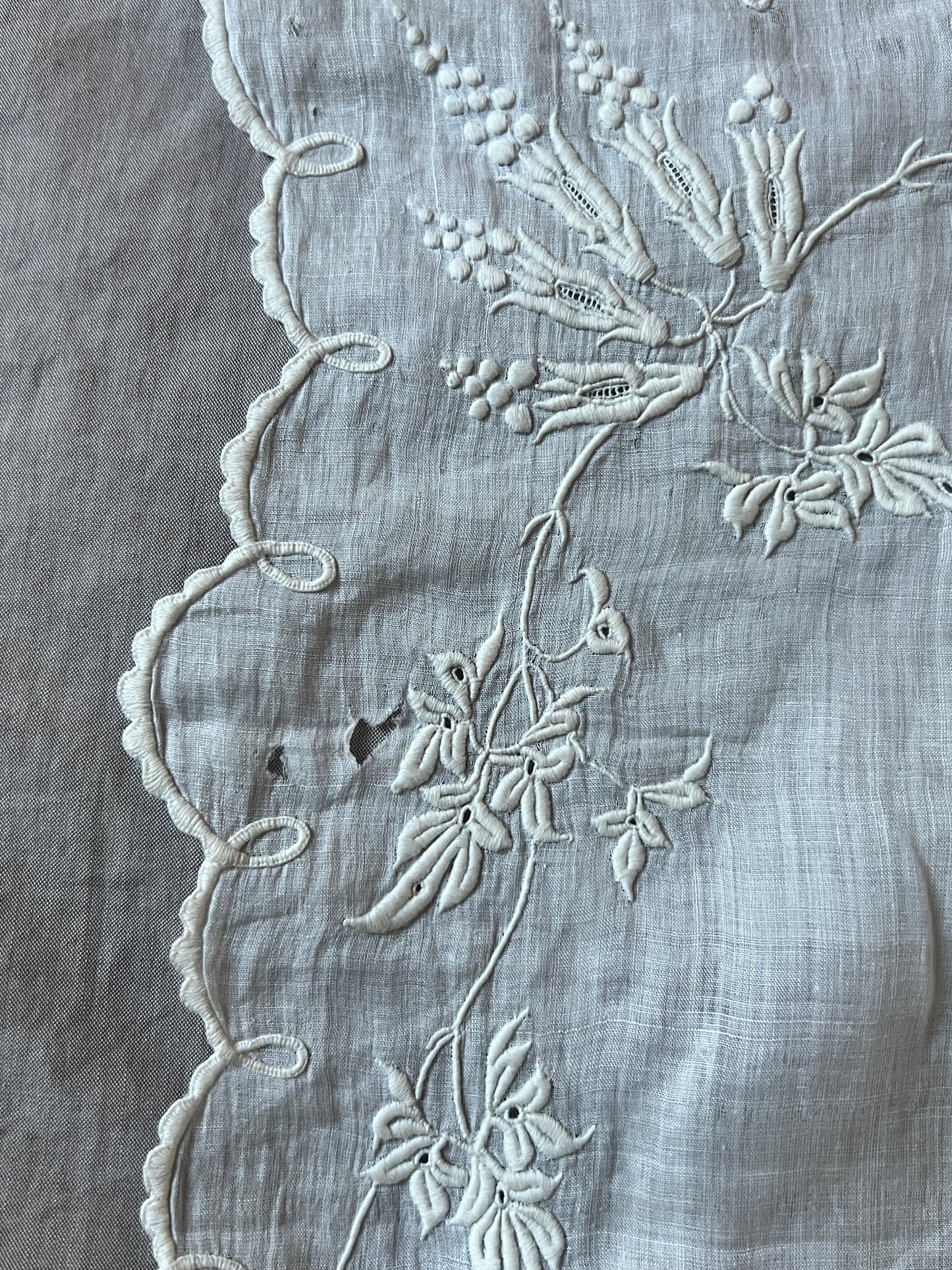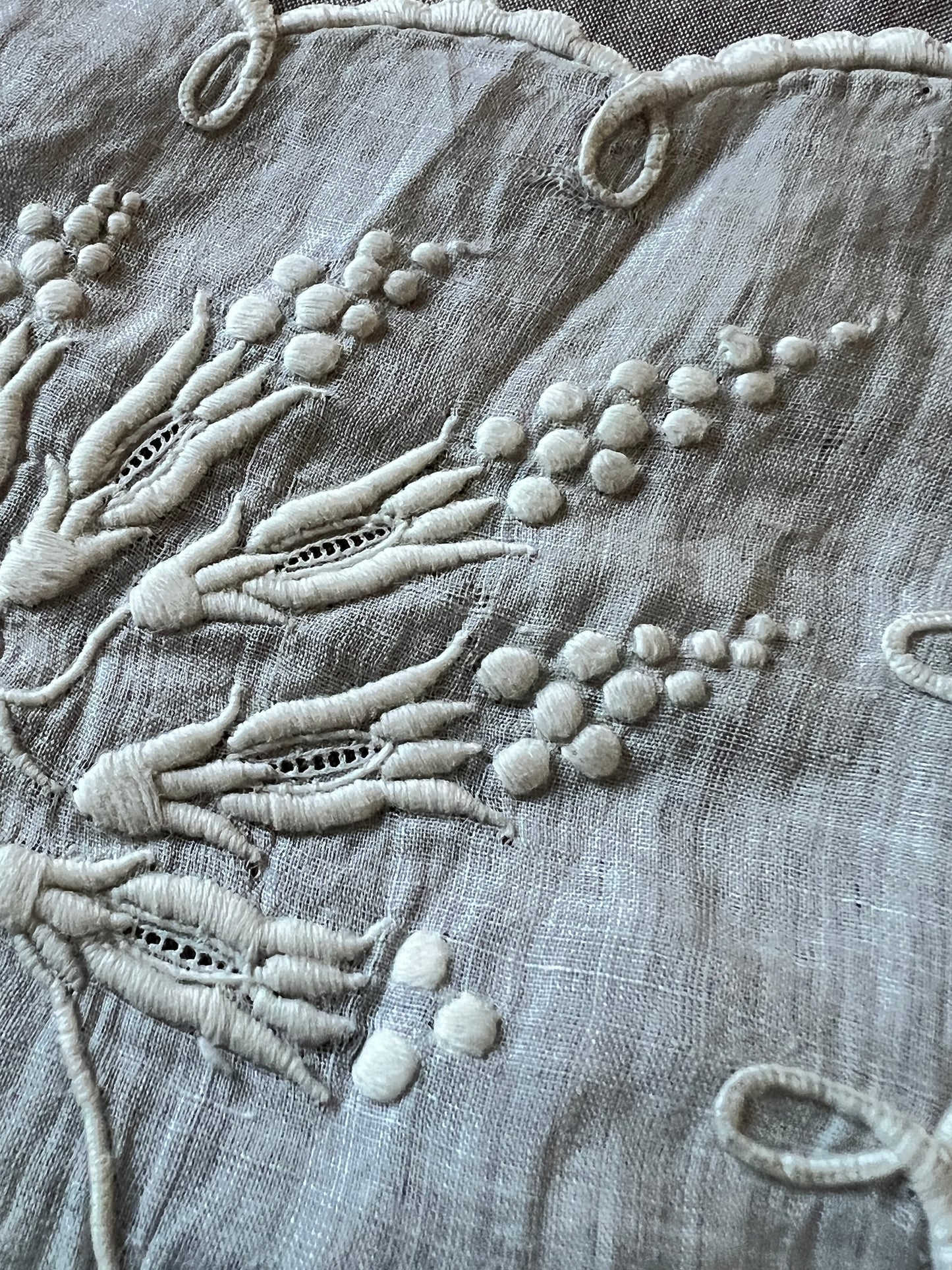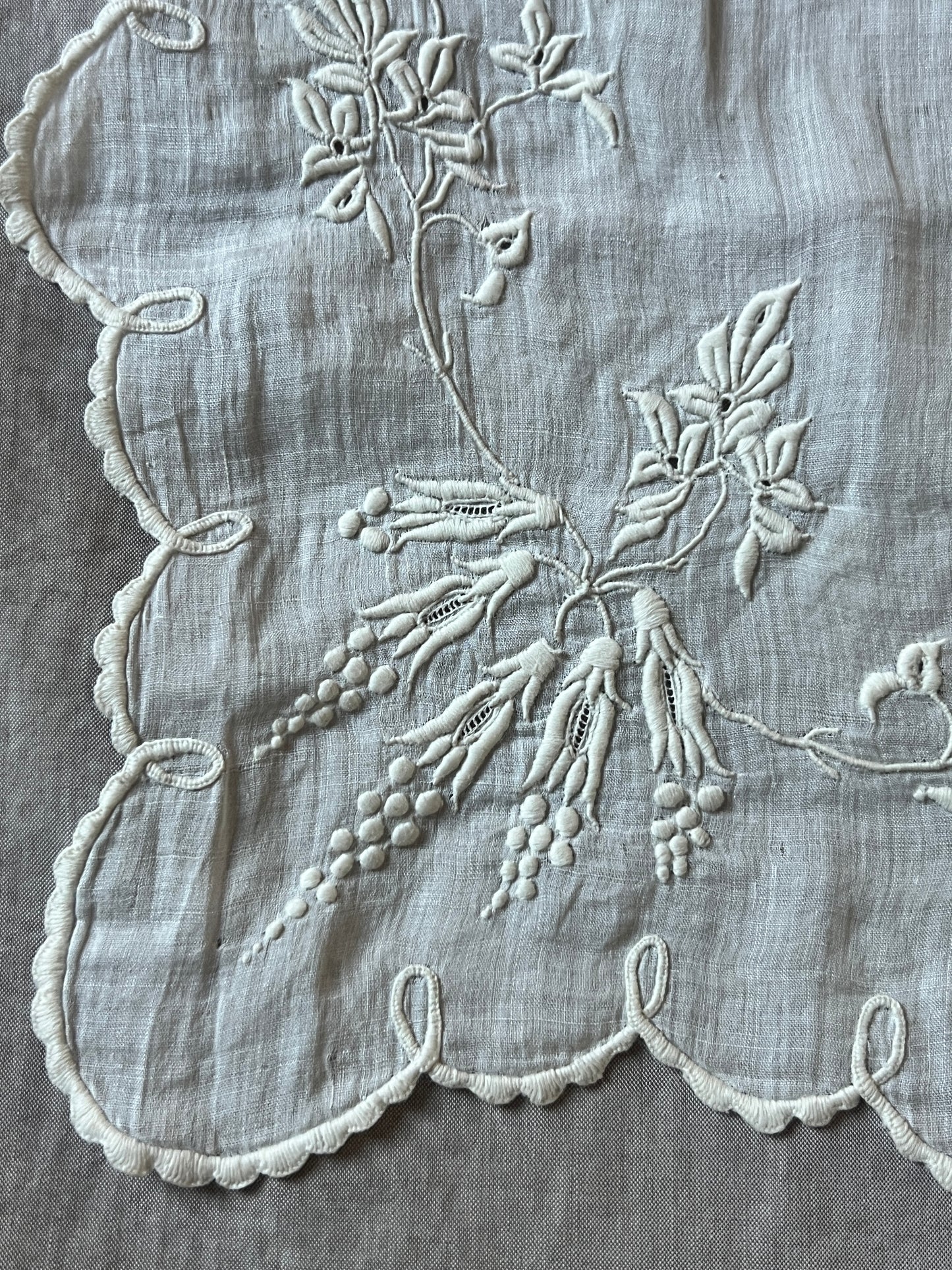 見事な刺繍でモチーフとスカラップの縁がステッチされています。