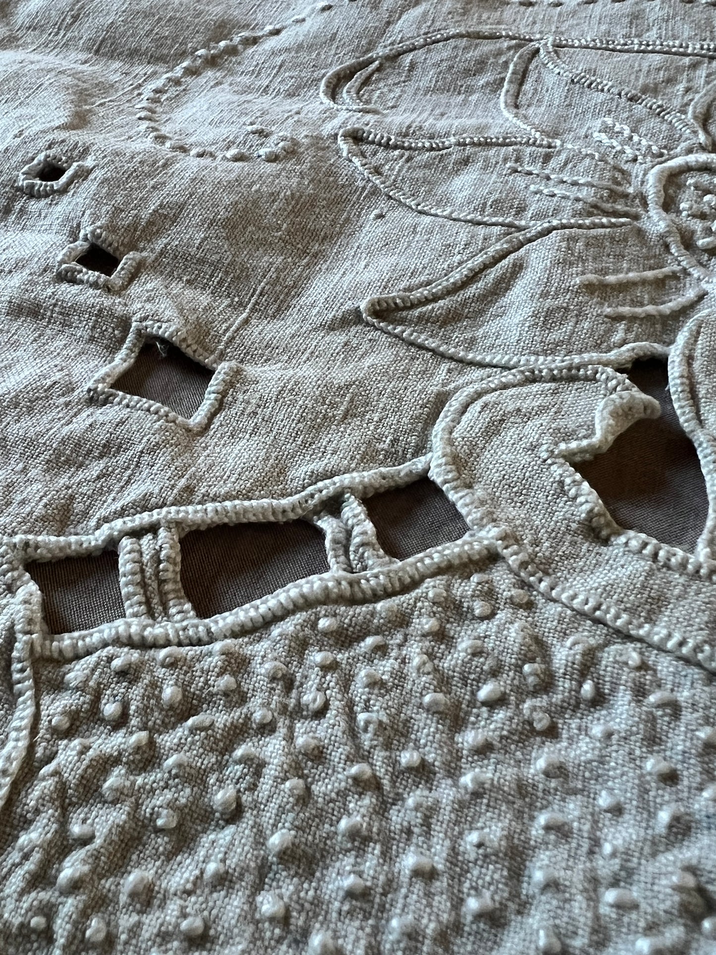 100cm×100cm 355g 未漂白カラーの素朴な風合いのリネンクロスです。 カットワーク刺繍が施されております。 布地にネップや小さな汚れがあります。