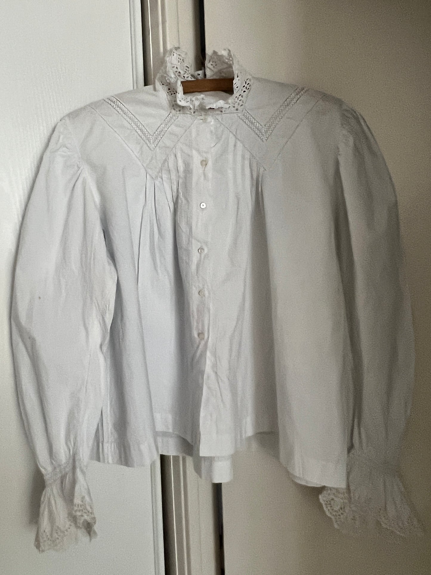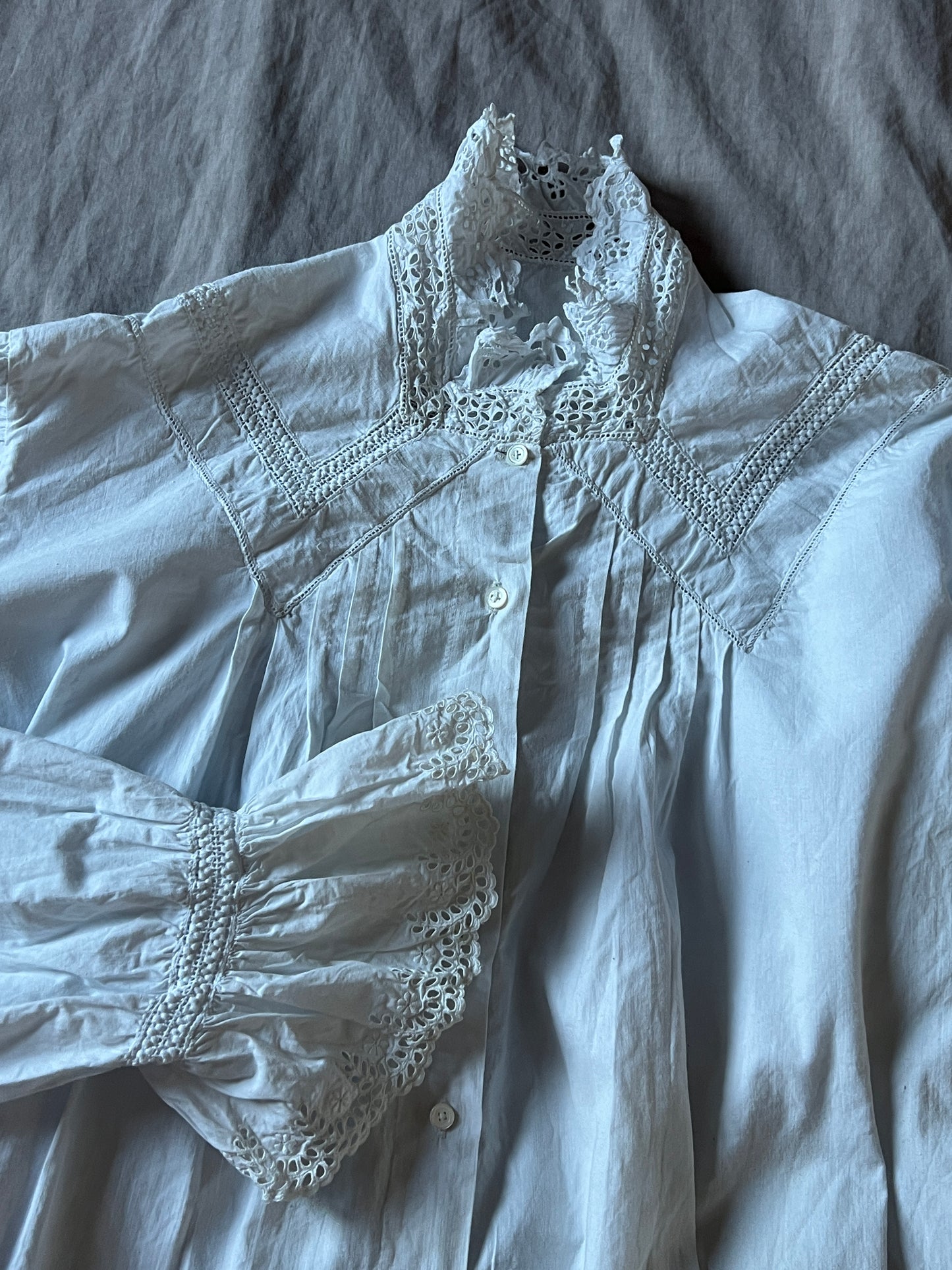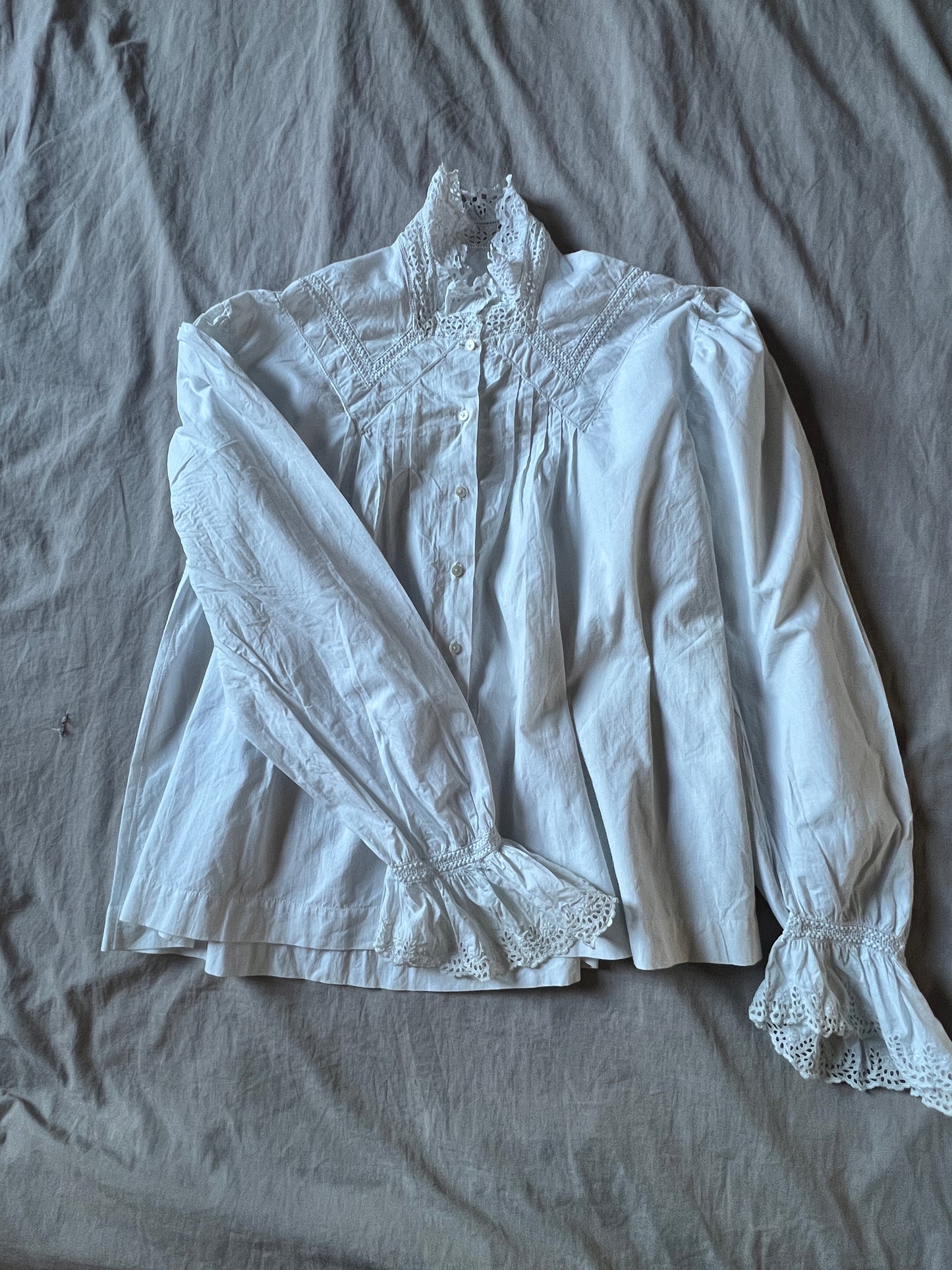 やや立ち上がり気味の襟と袖のフリルに刺繍トリムレースがあしらわれたデザインの長袖のアンティークブラウスです。