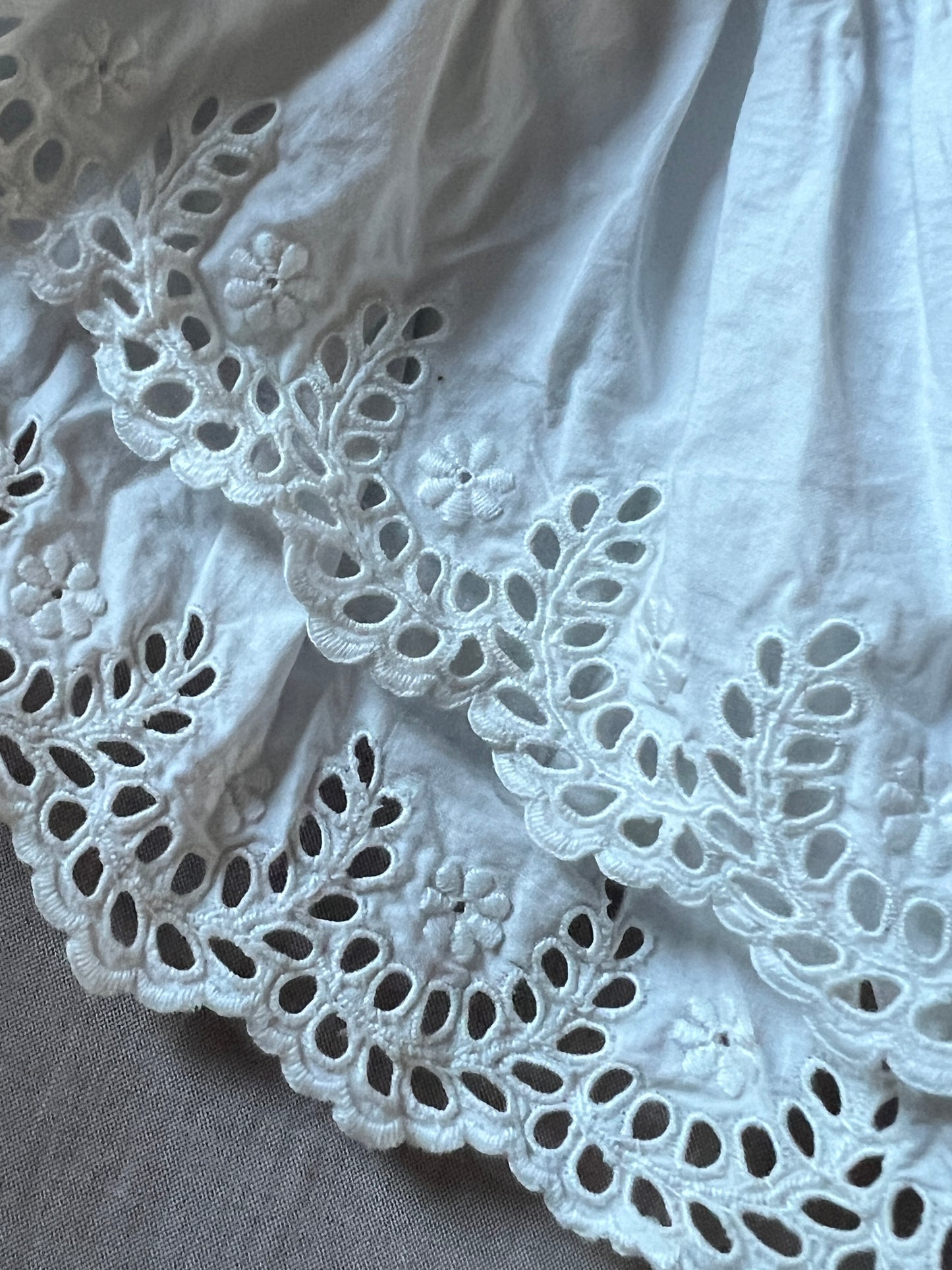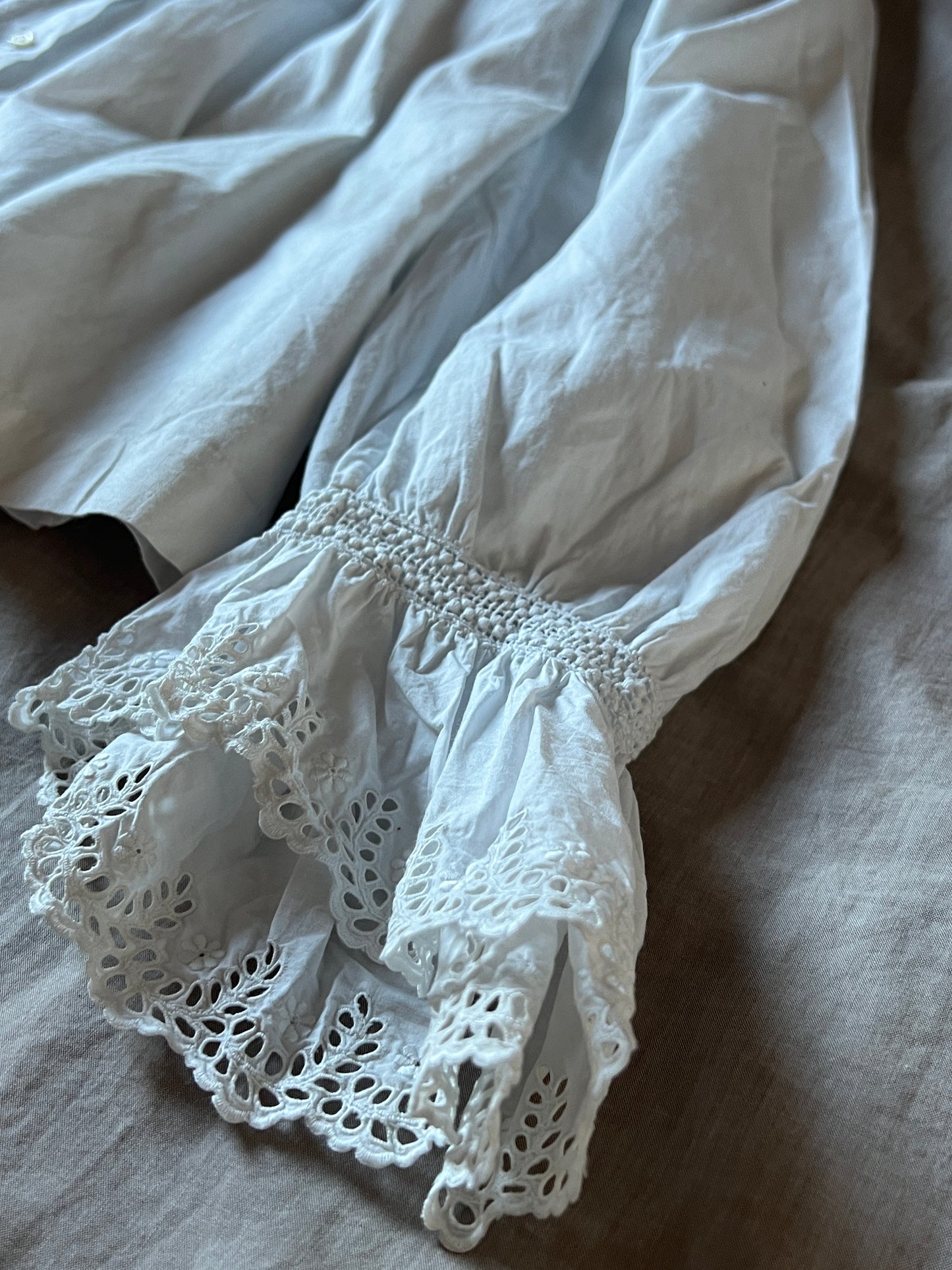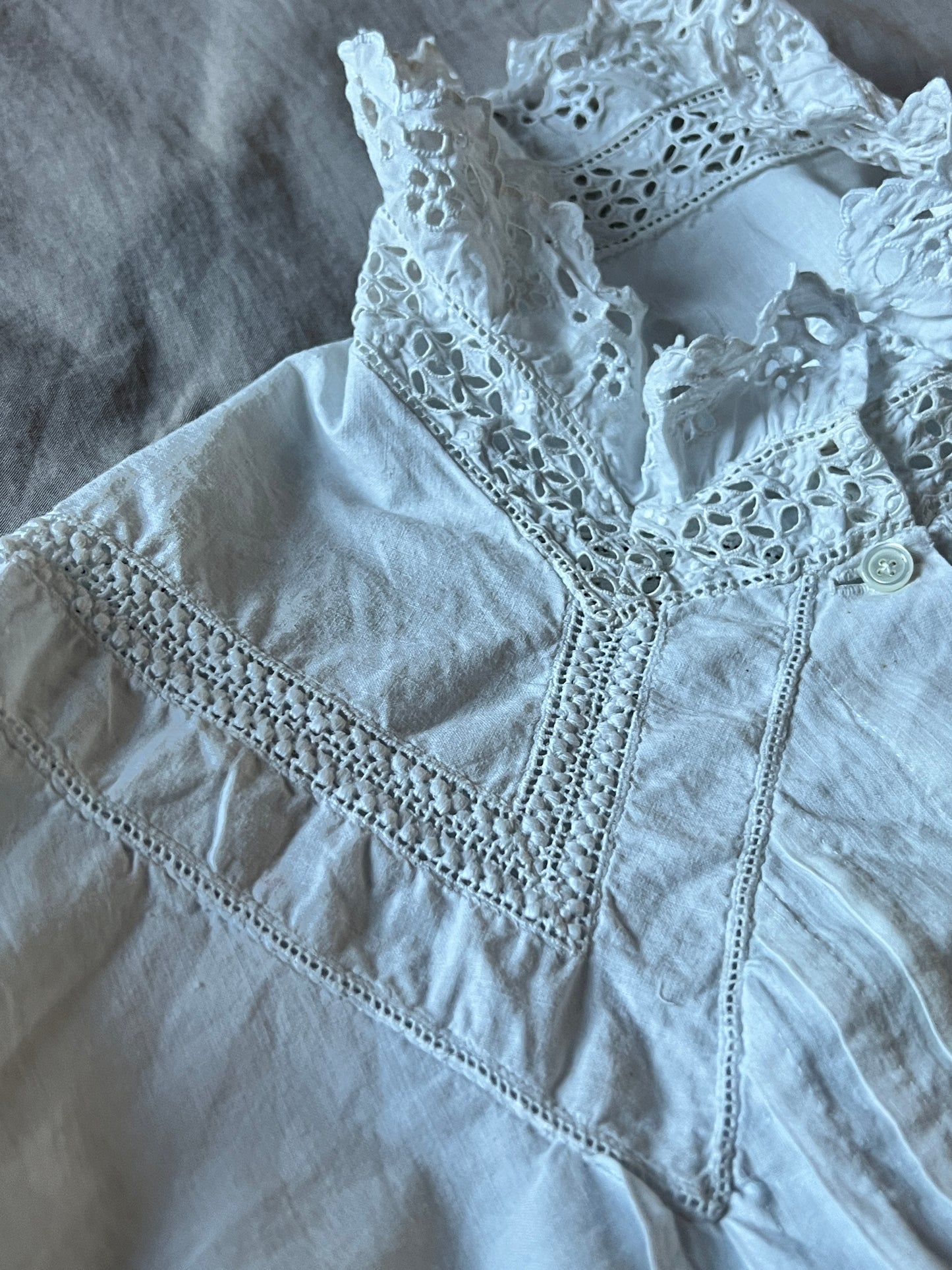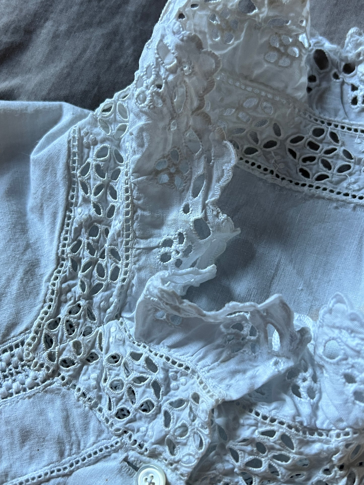 やや立ち上がり気味の襟と袖のフリルに刺繍トリムレースがあしらわれたデザインの長袖のアンティークブラウスです。