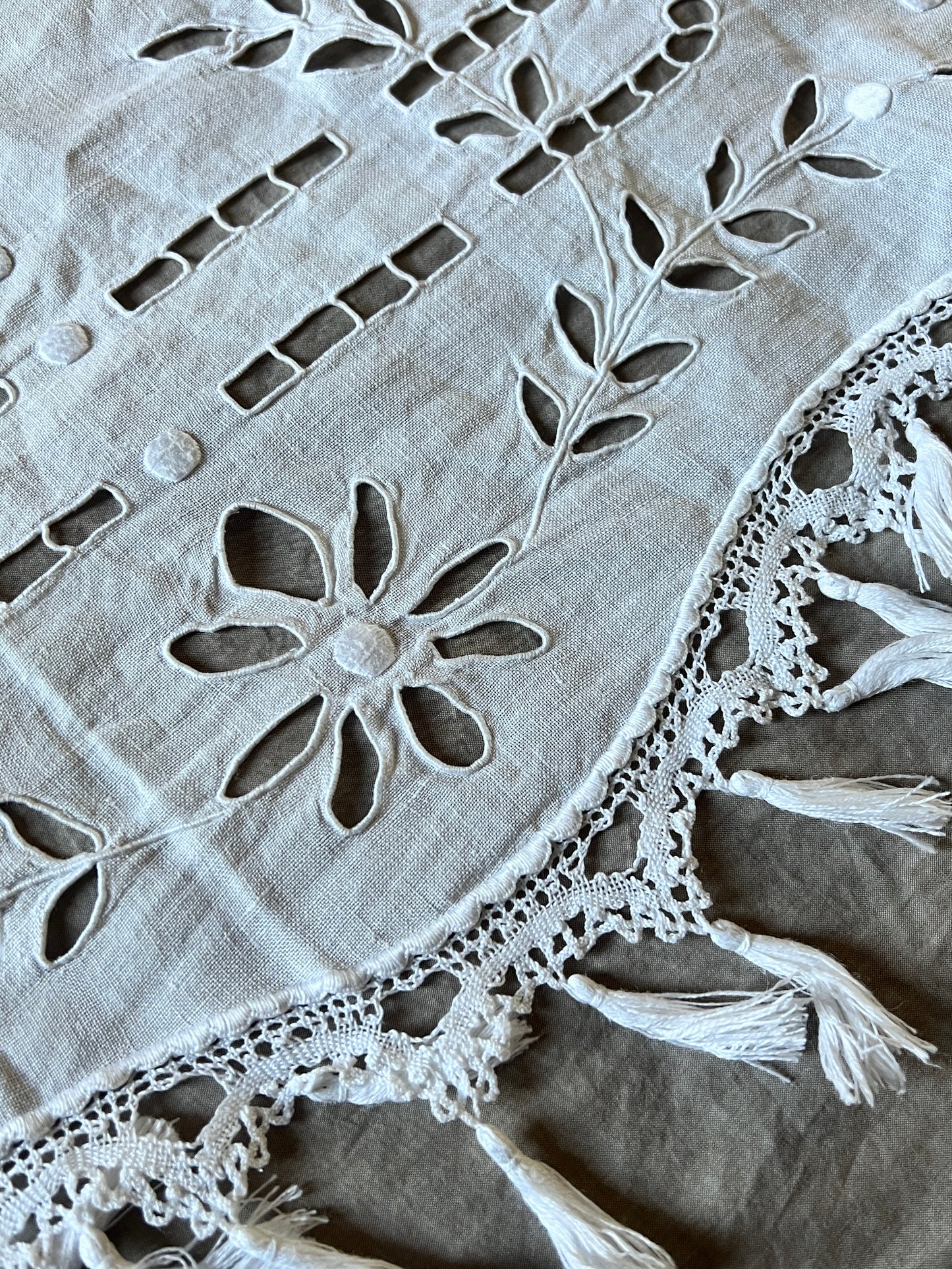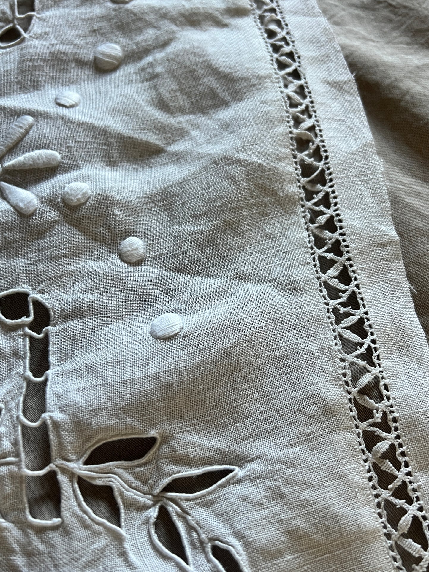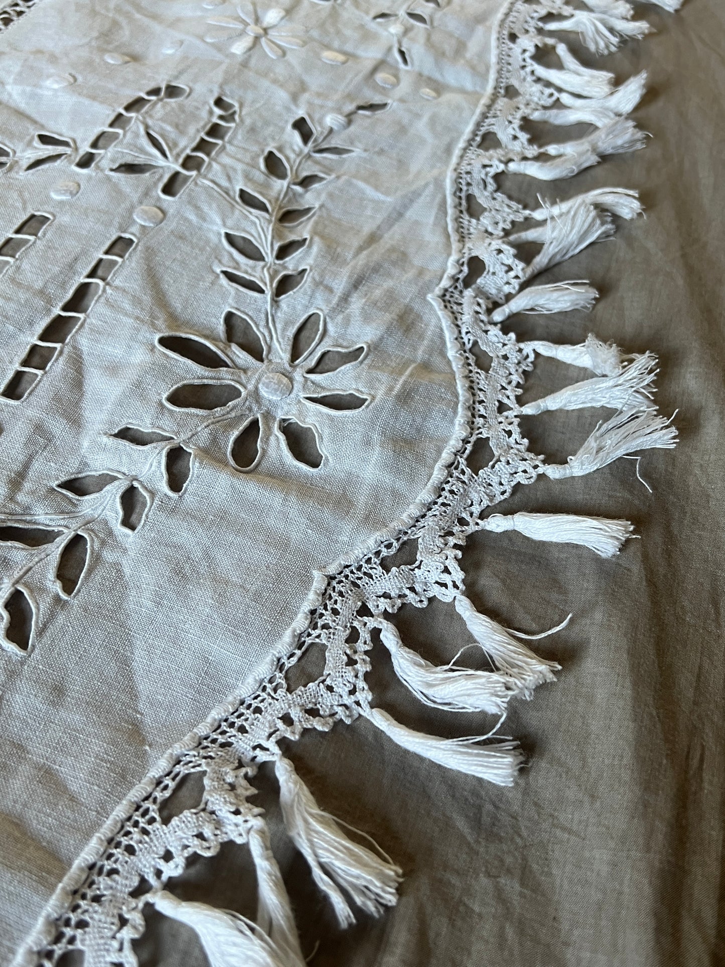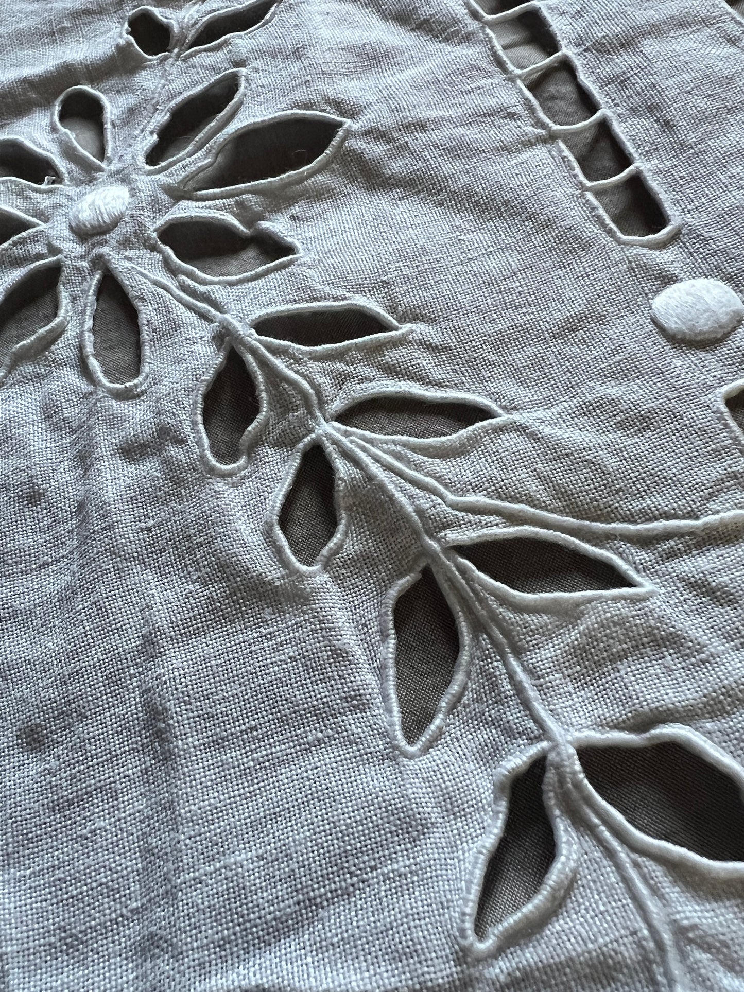 カットワーク刺繍と白刺繍でデザインされた飾り布です