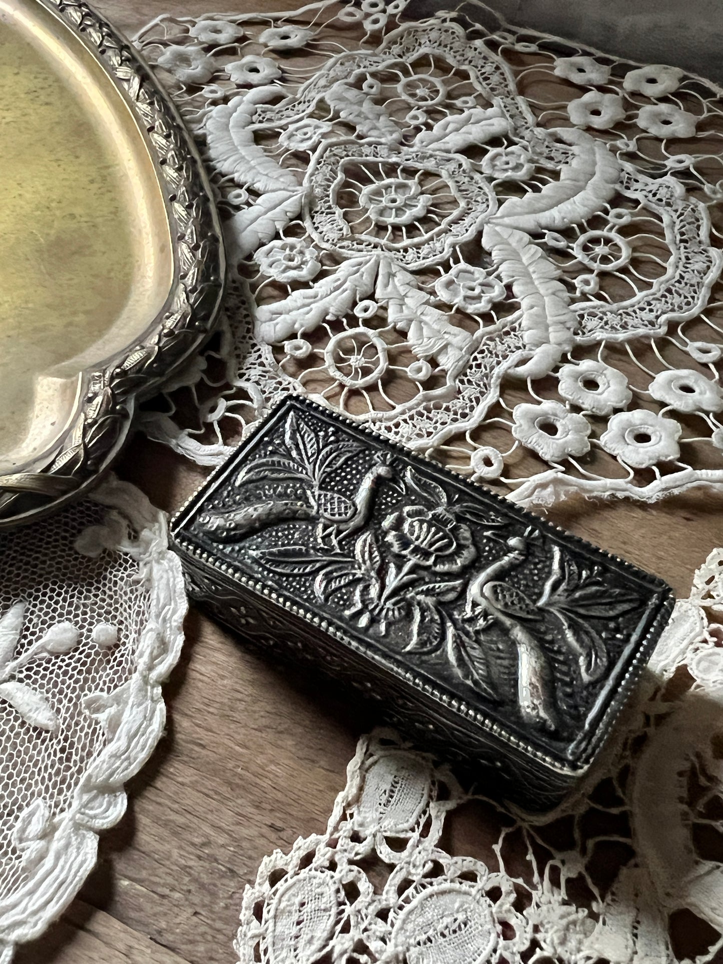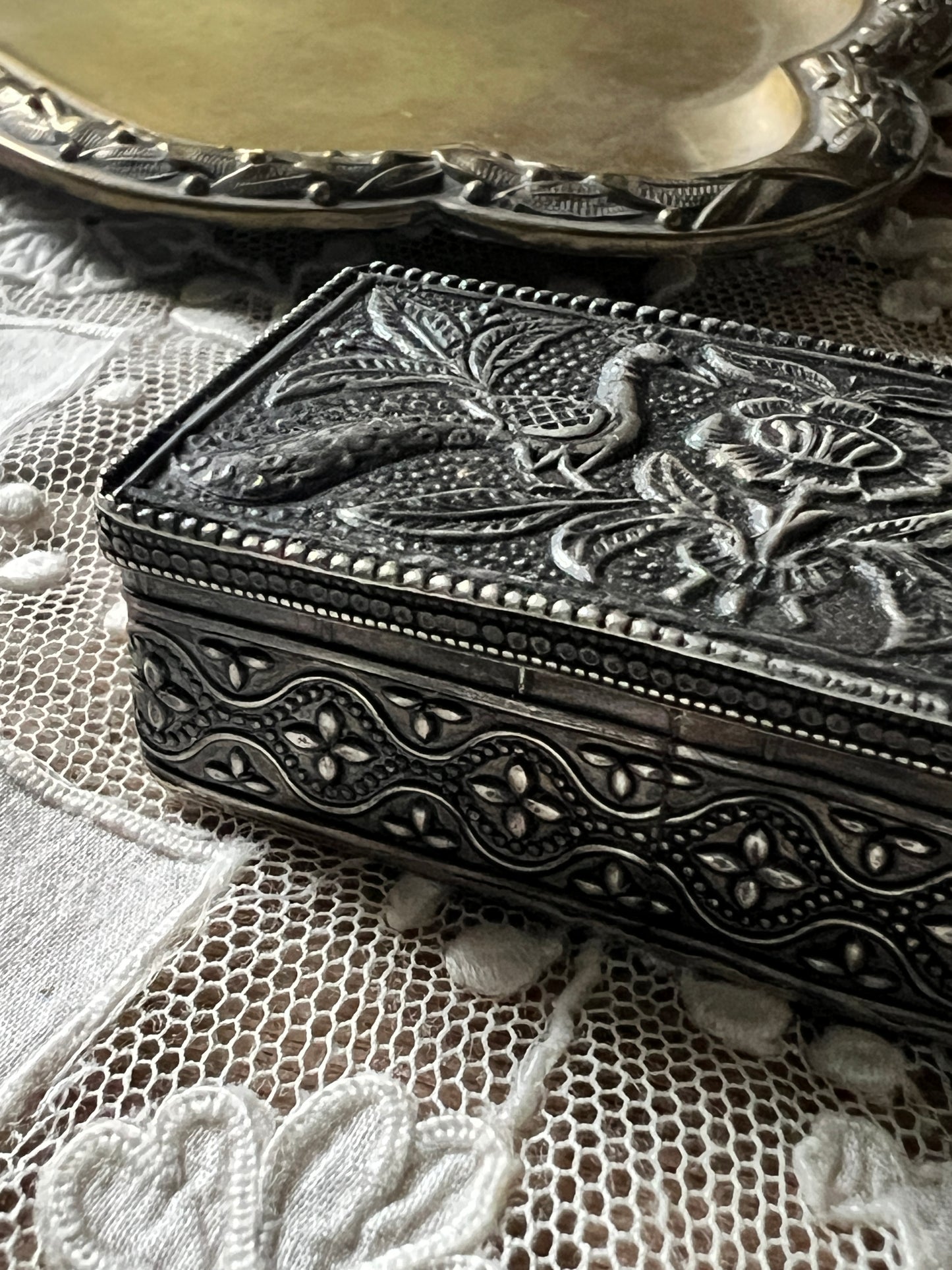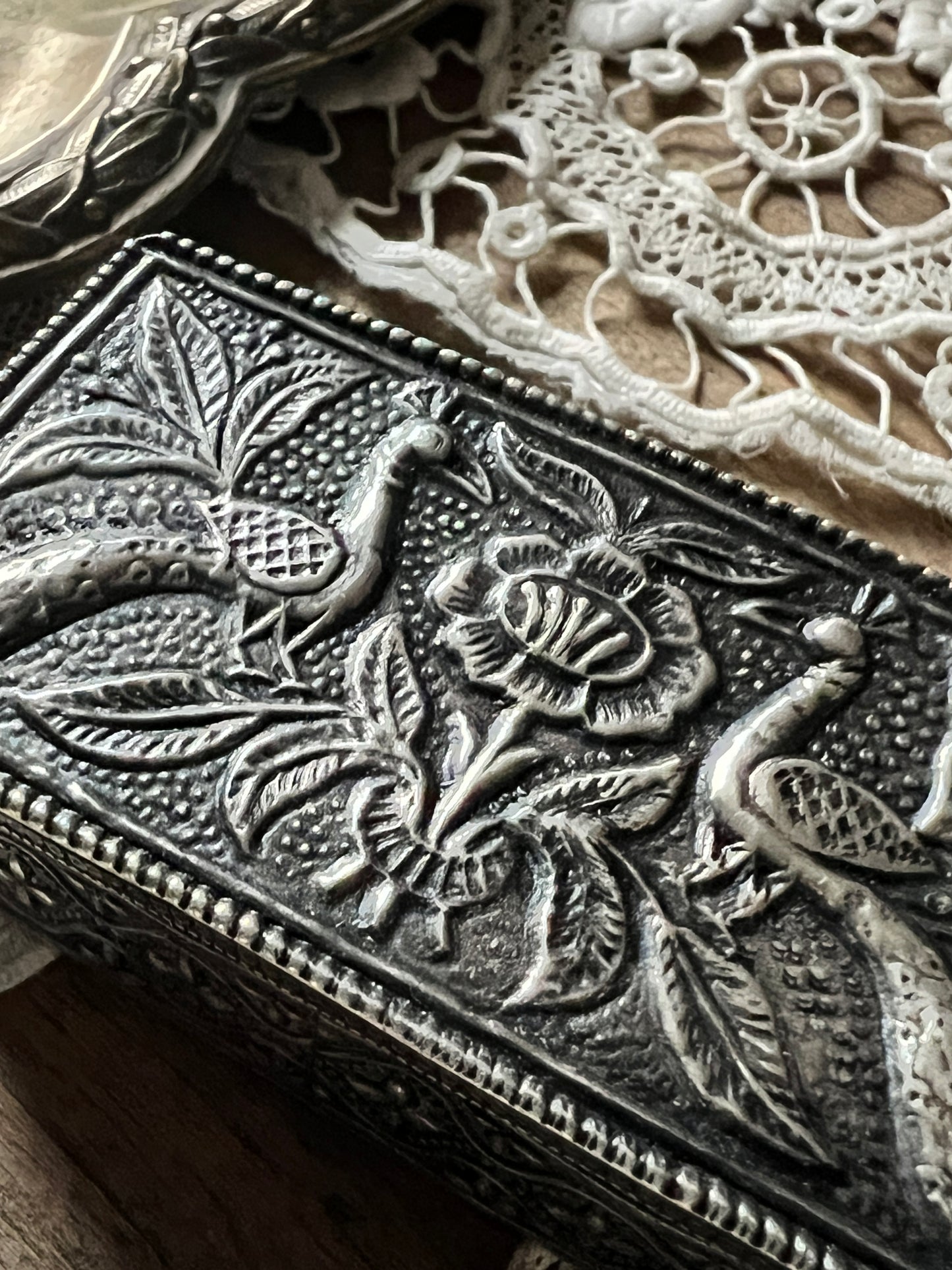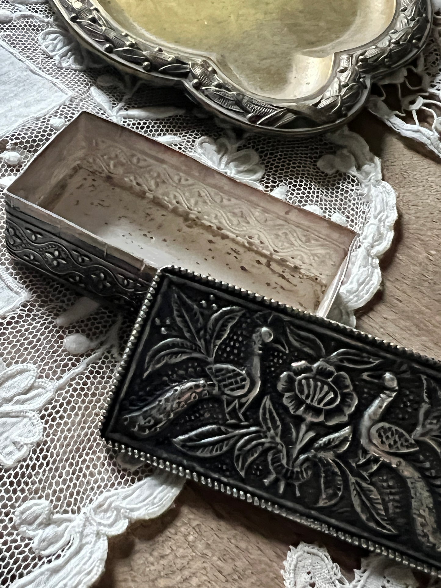 二羽の孔雀がたたずむ姿が描かれた銀の小物ケースです