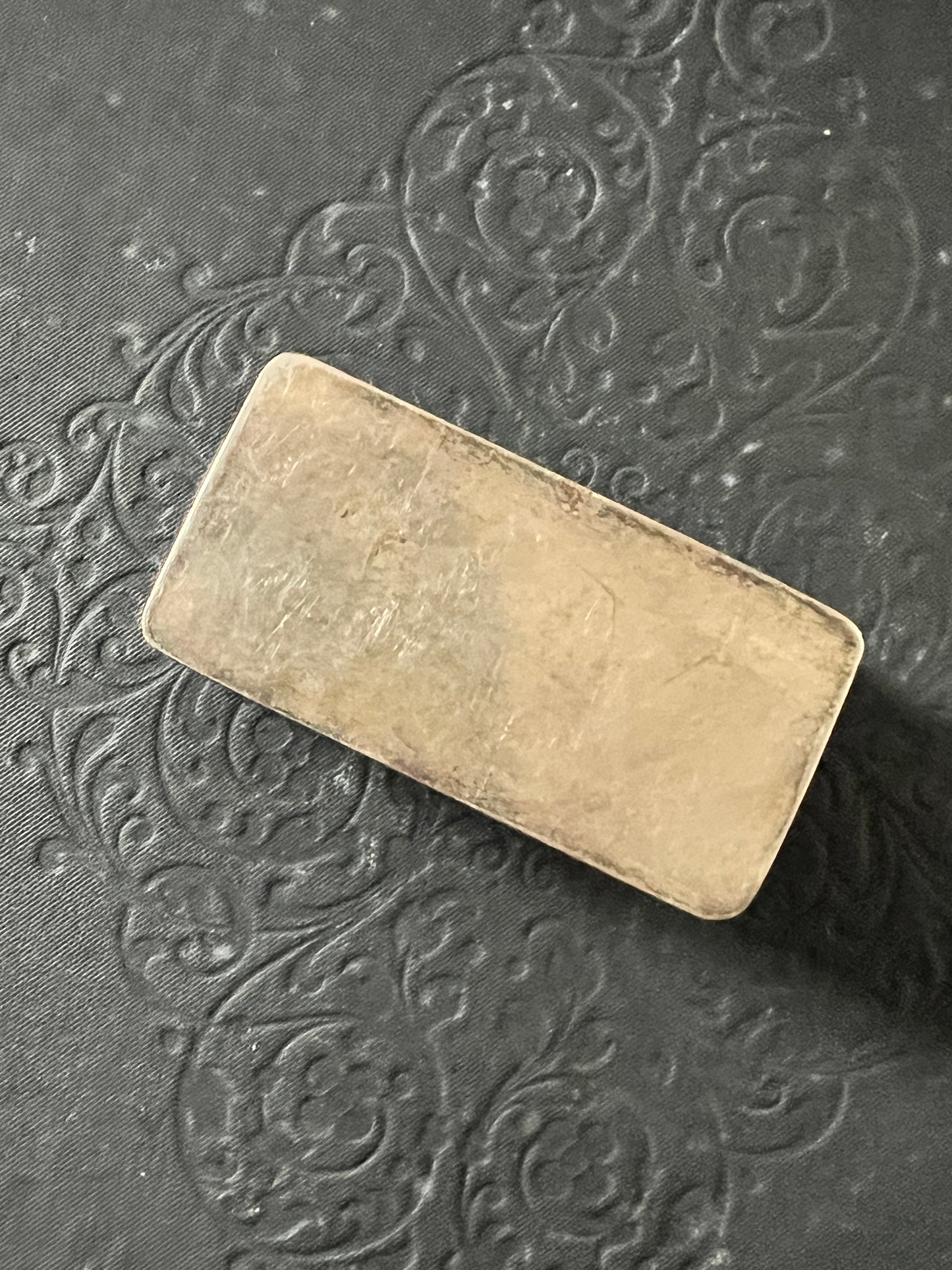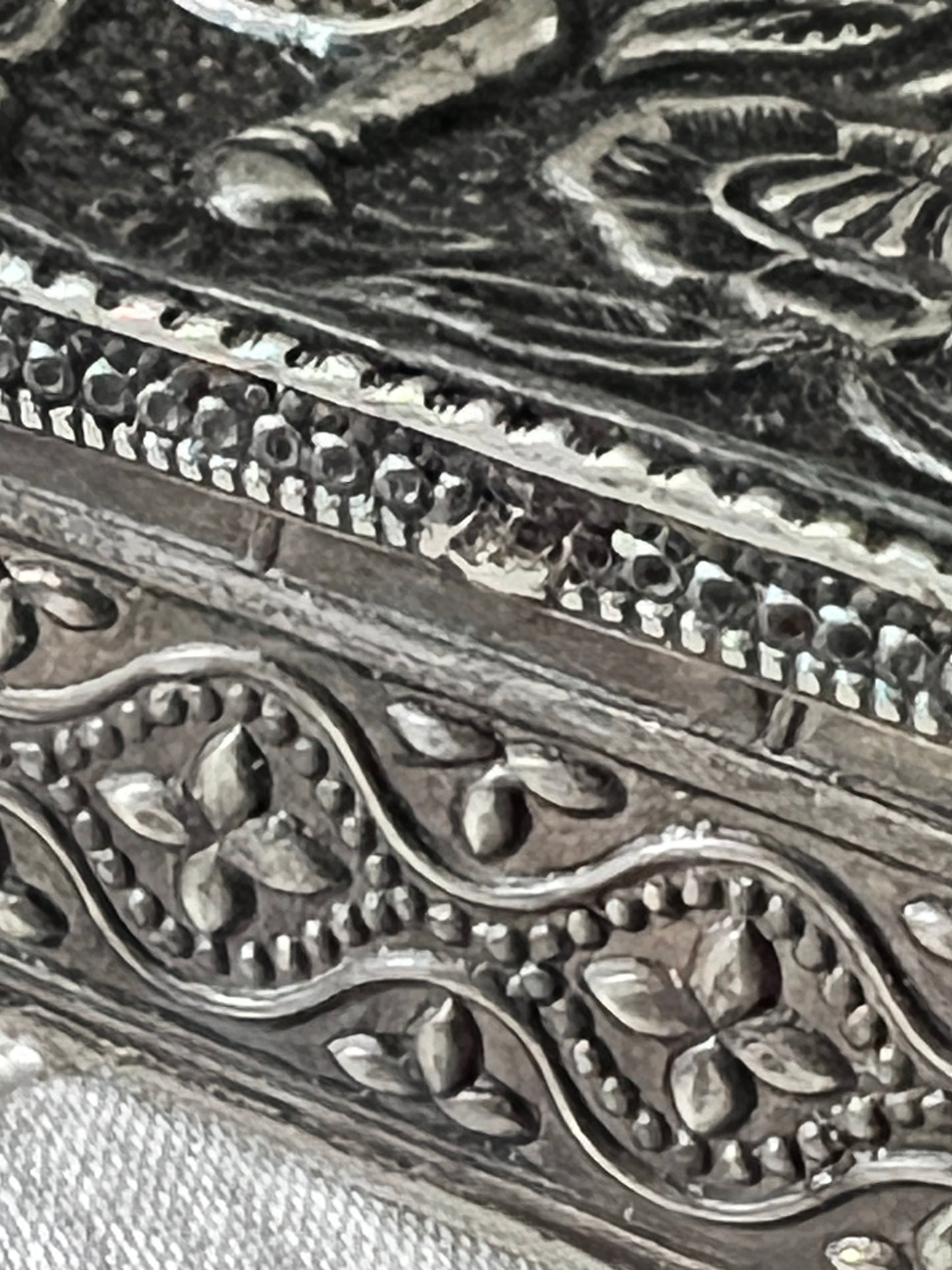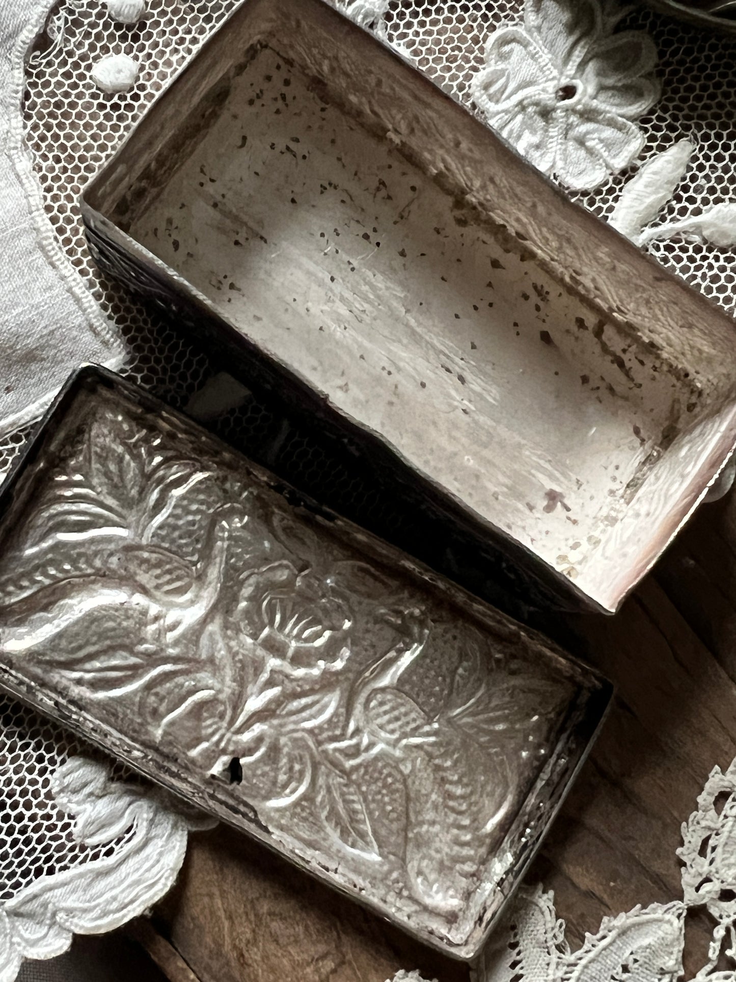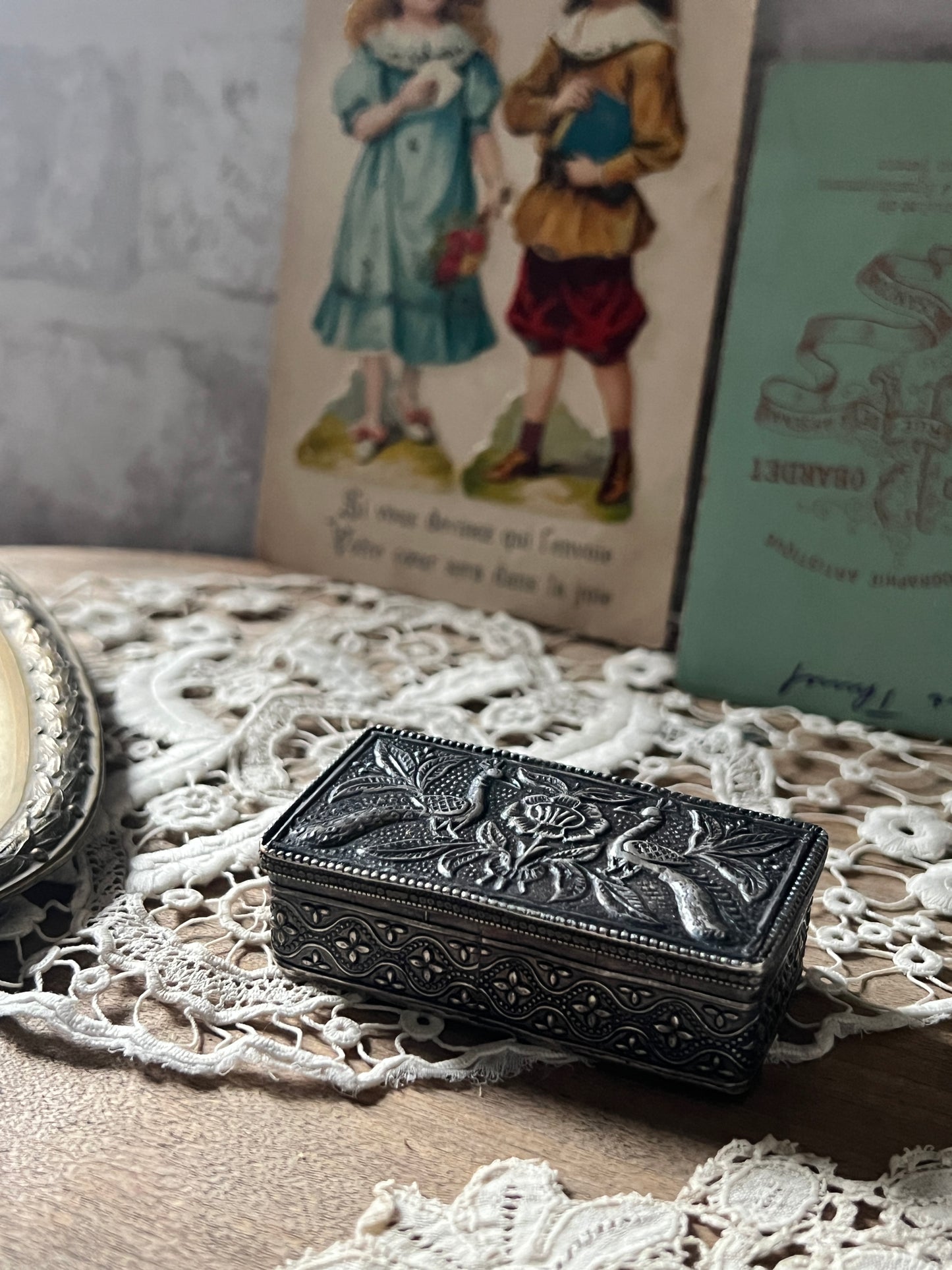 二羽の孔雀がたたずむ姿が描かれた銀の小物ケースです
