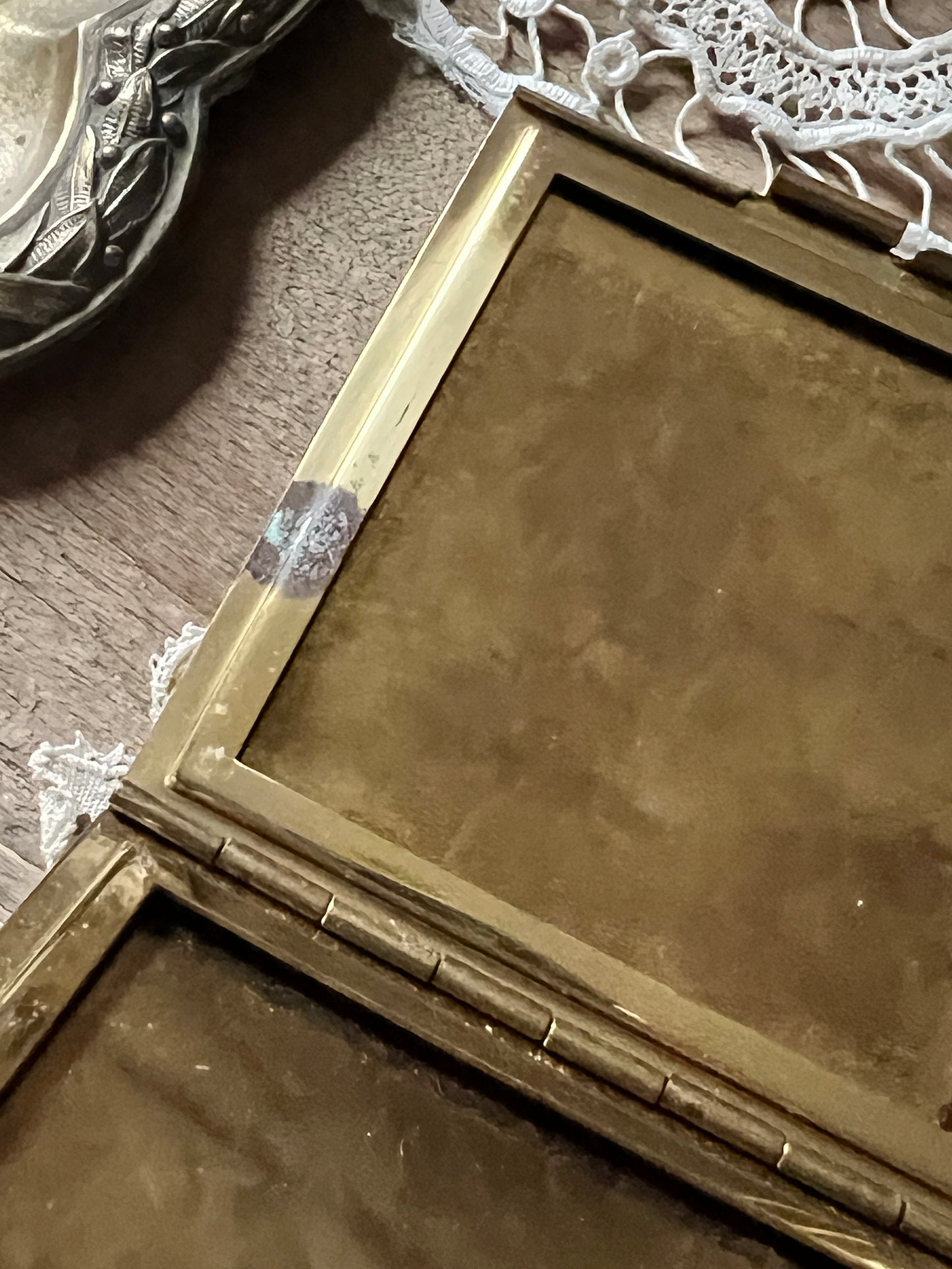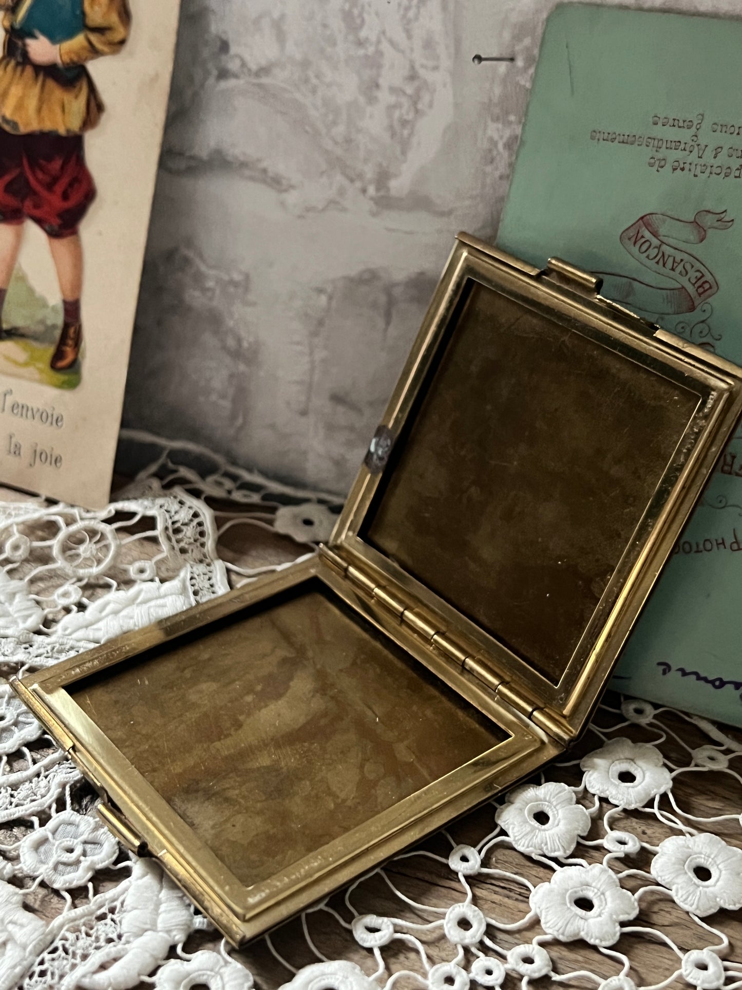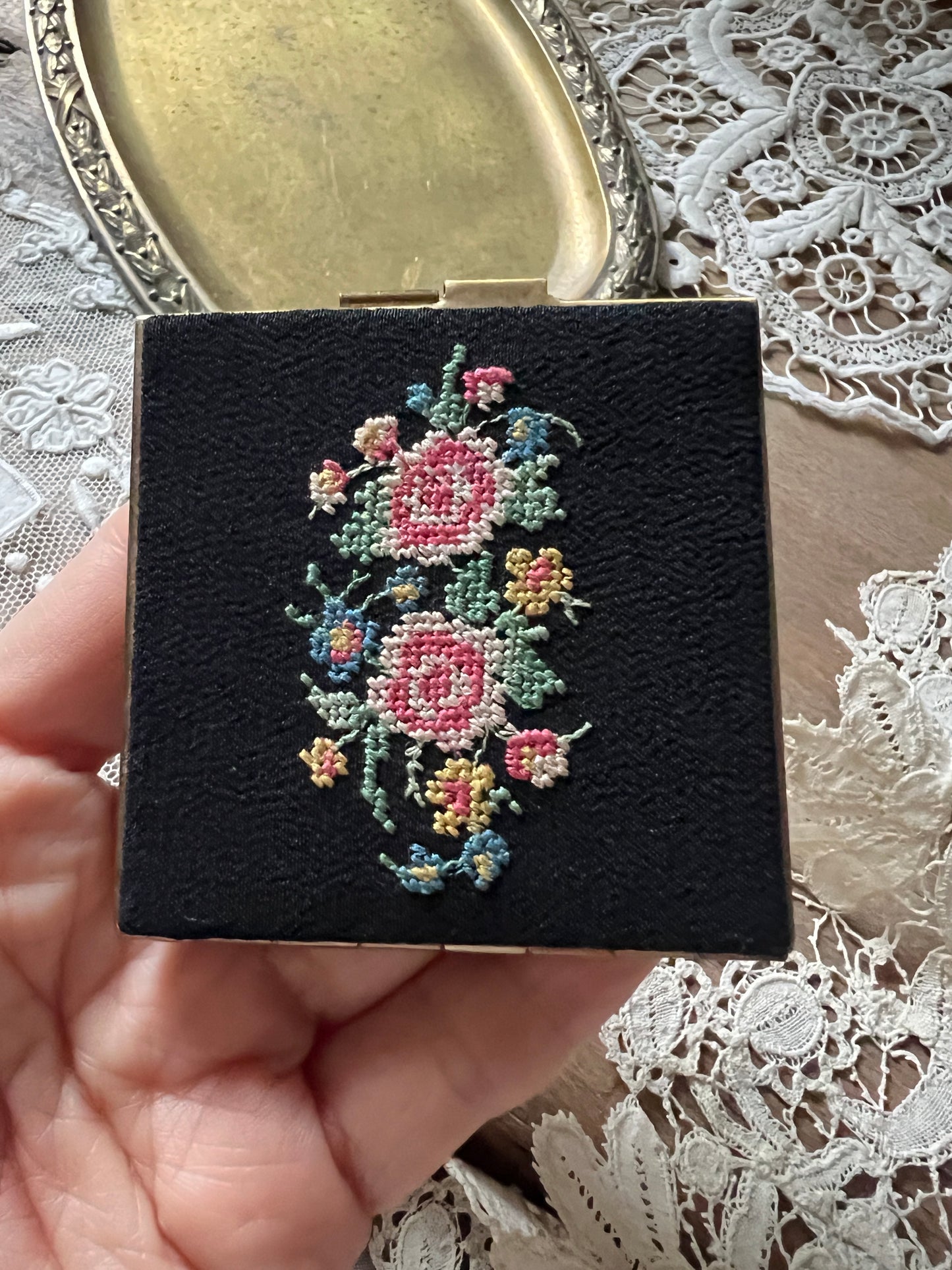 6cm×6.3cm 57g 本体真鍮製 黒地にプチポワン刺繍で薔薇や花々が描かれたケースです本体は真鍮製で内部には写真など薄いものが収納できるかと思います 内部に一部汚れがあります 開閉はスムーズでぱちんときっちり閉まります