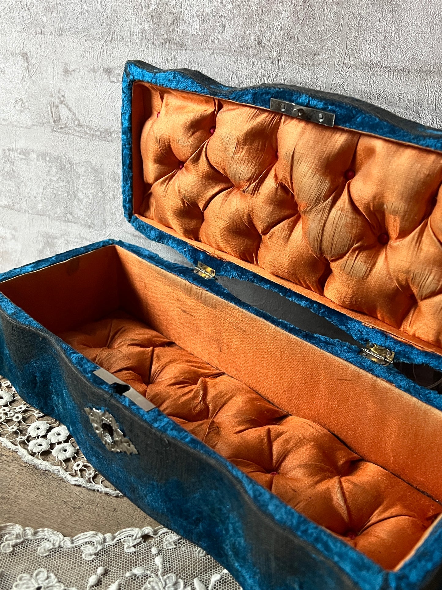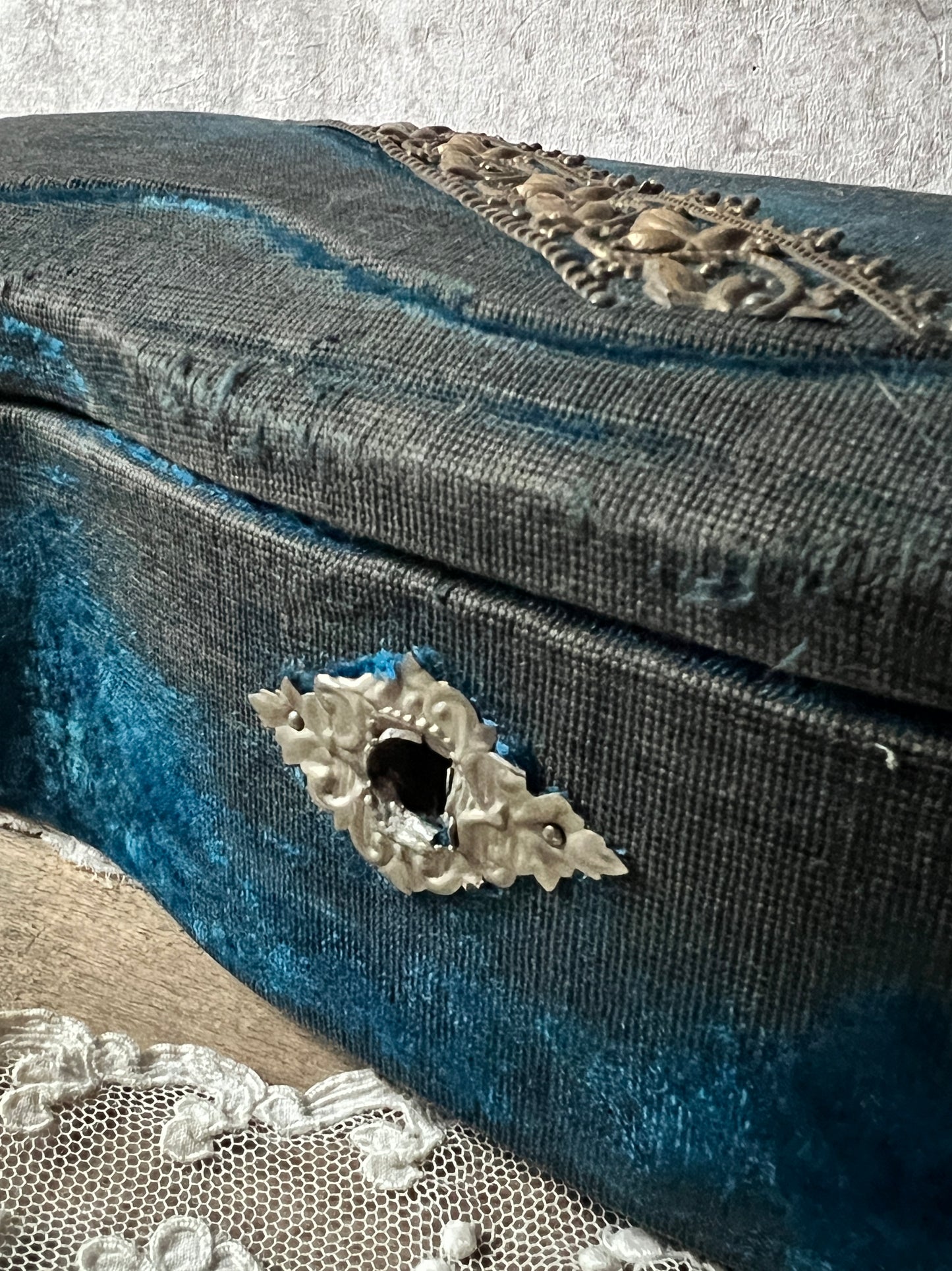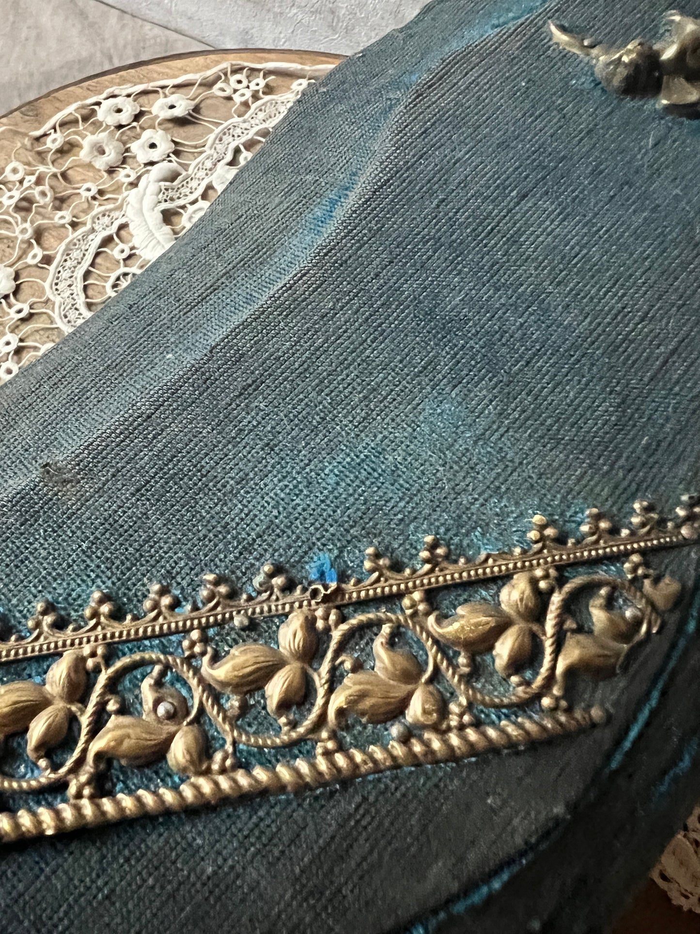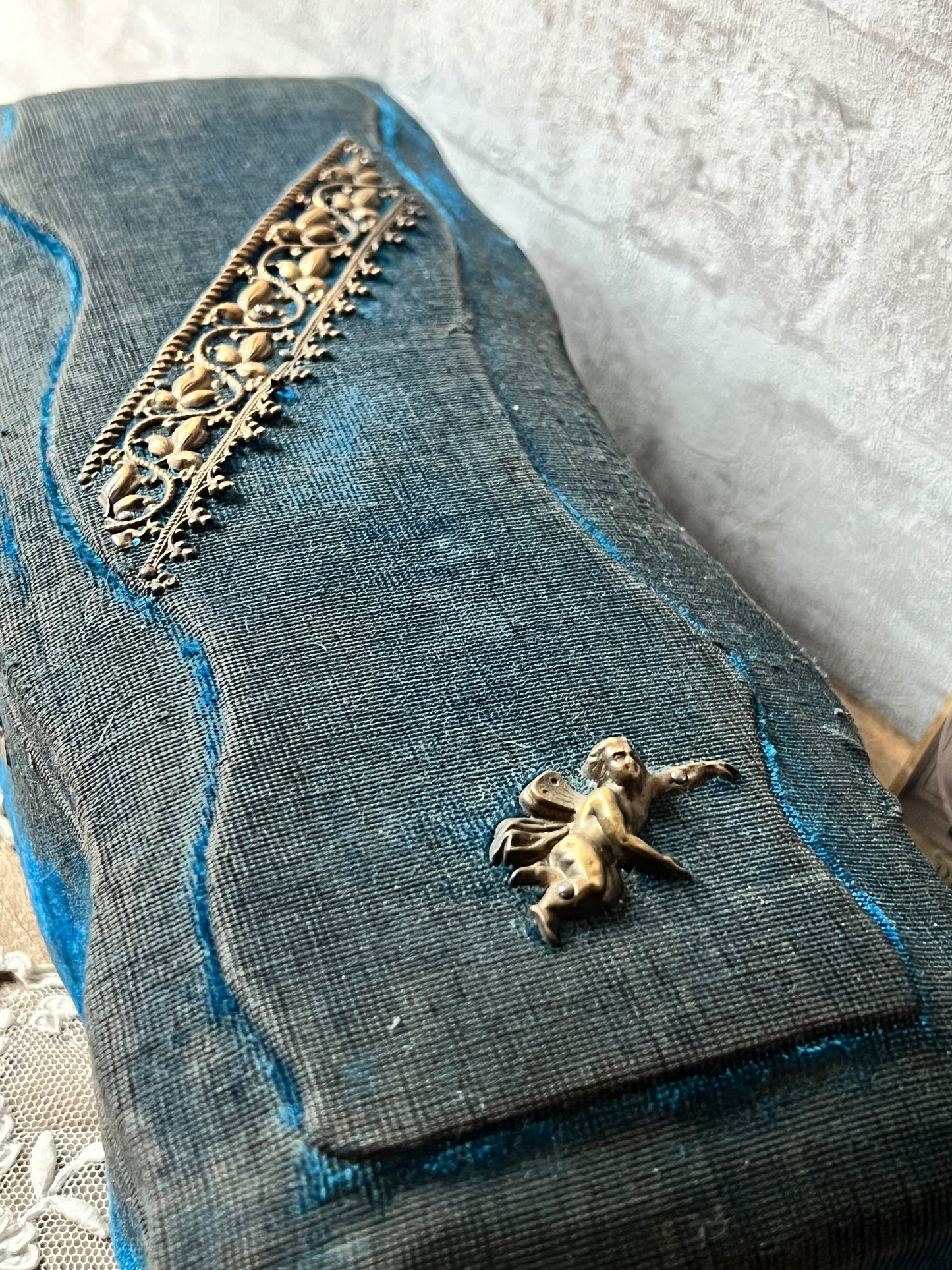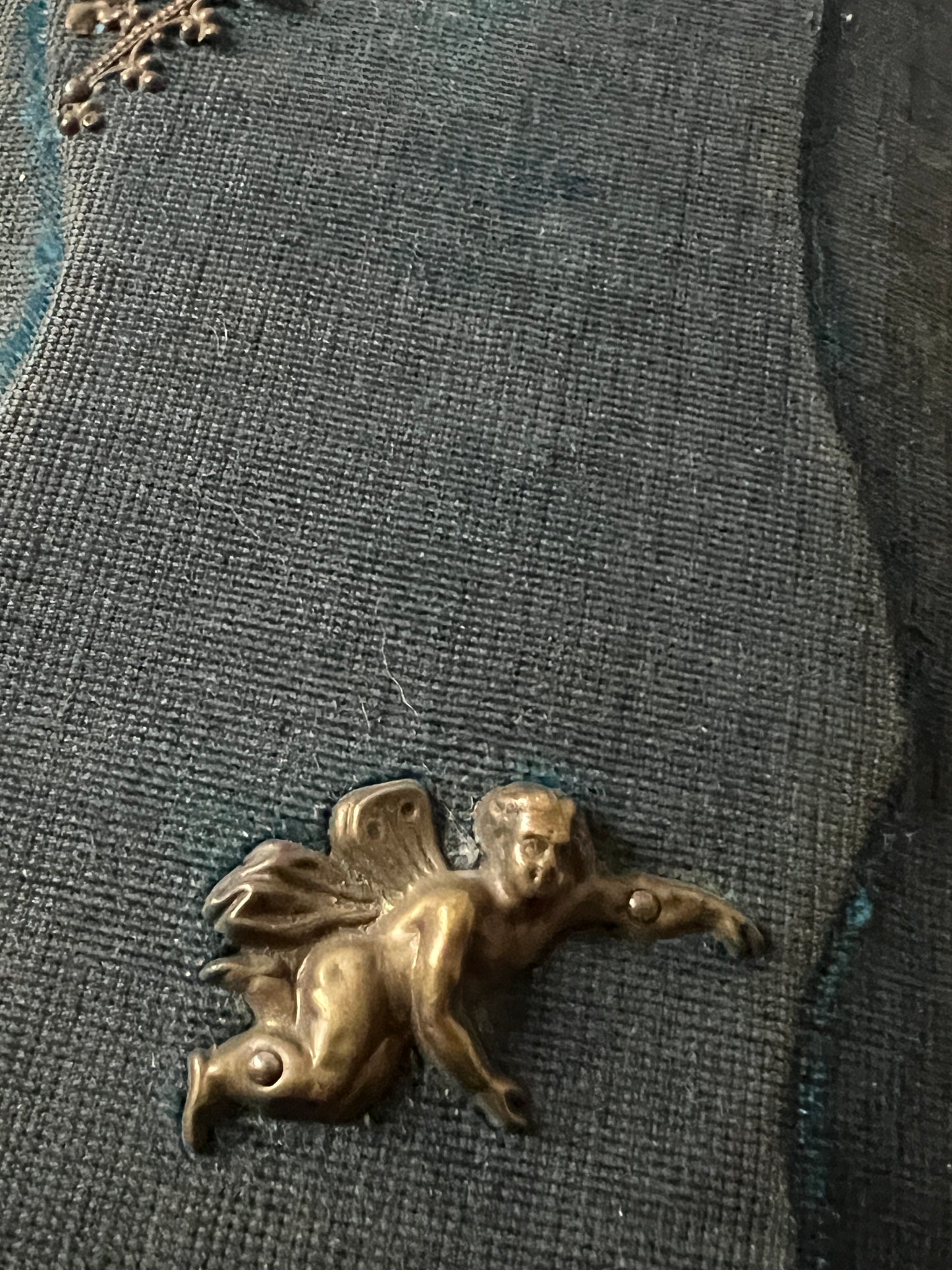 上部は起毛がほぼ擦り切れてしまっていますが、真鍮製の飾りが取り付けられており、美しいモチーフと天使の飾りがとても魅力的