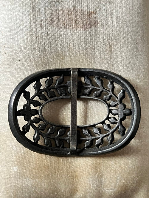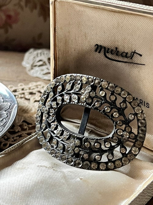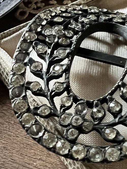 メタルの土台に小さなストーンがびっしりと取付けられた華やかなバックルです。