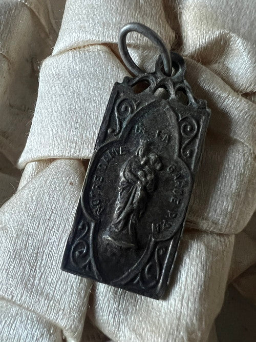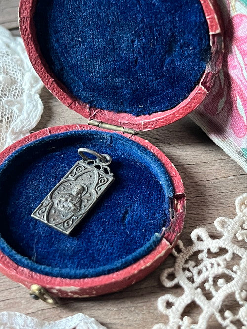 透かし細工の美しい長方形のアンティークメダイです キリストの聖心/守護の聖母子